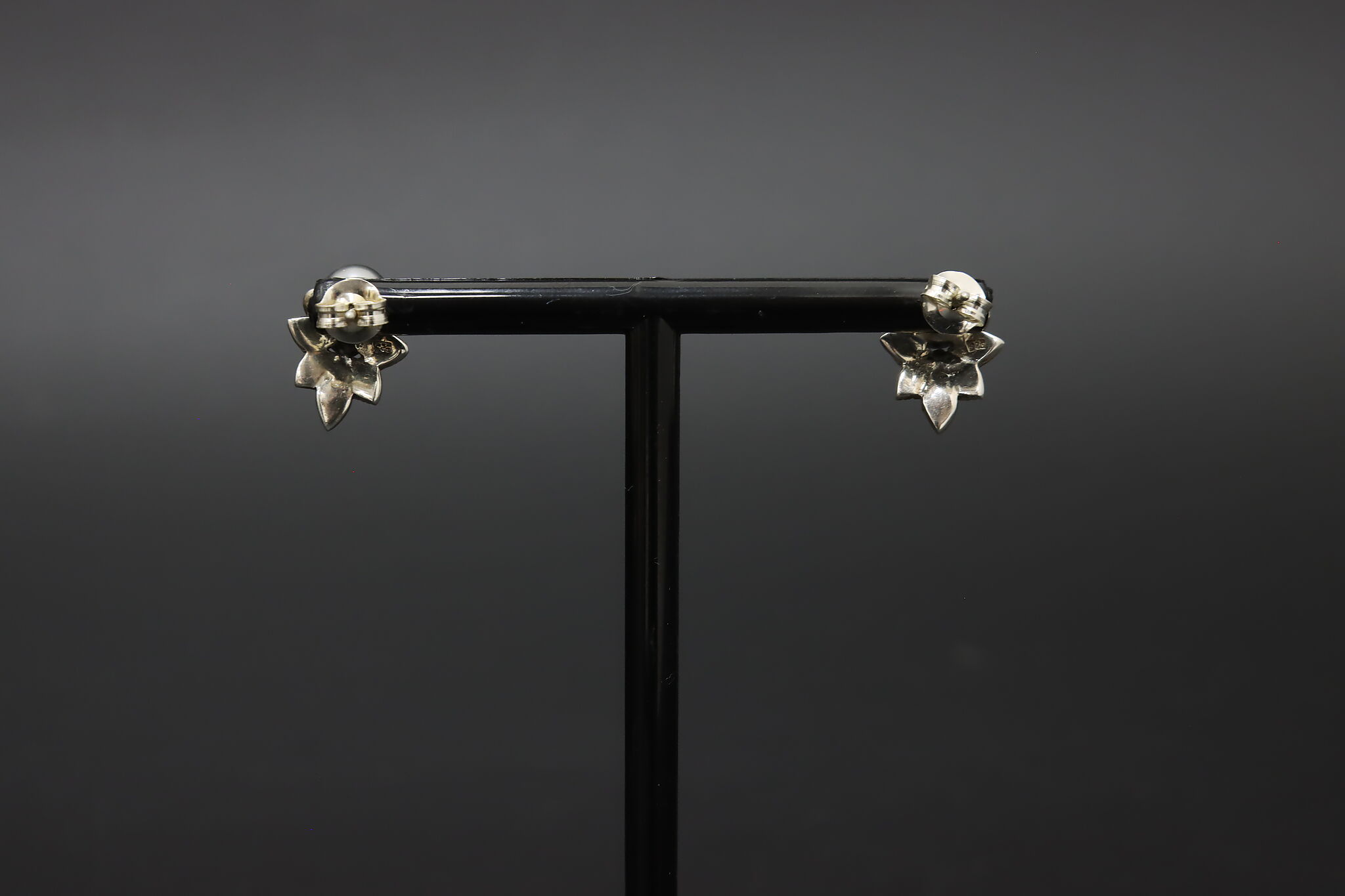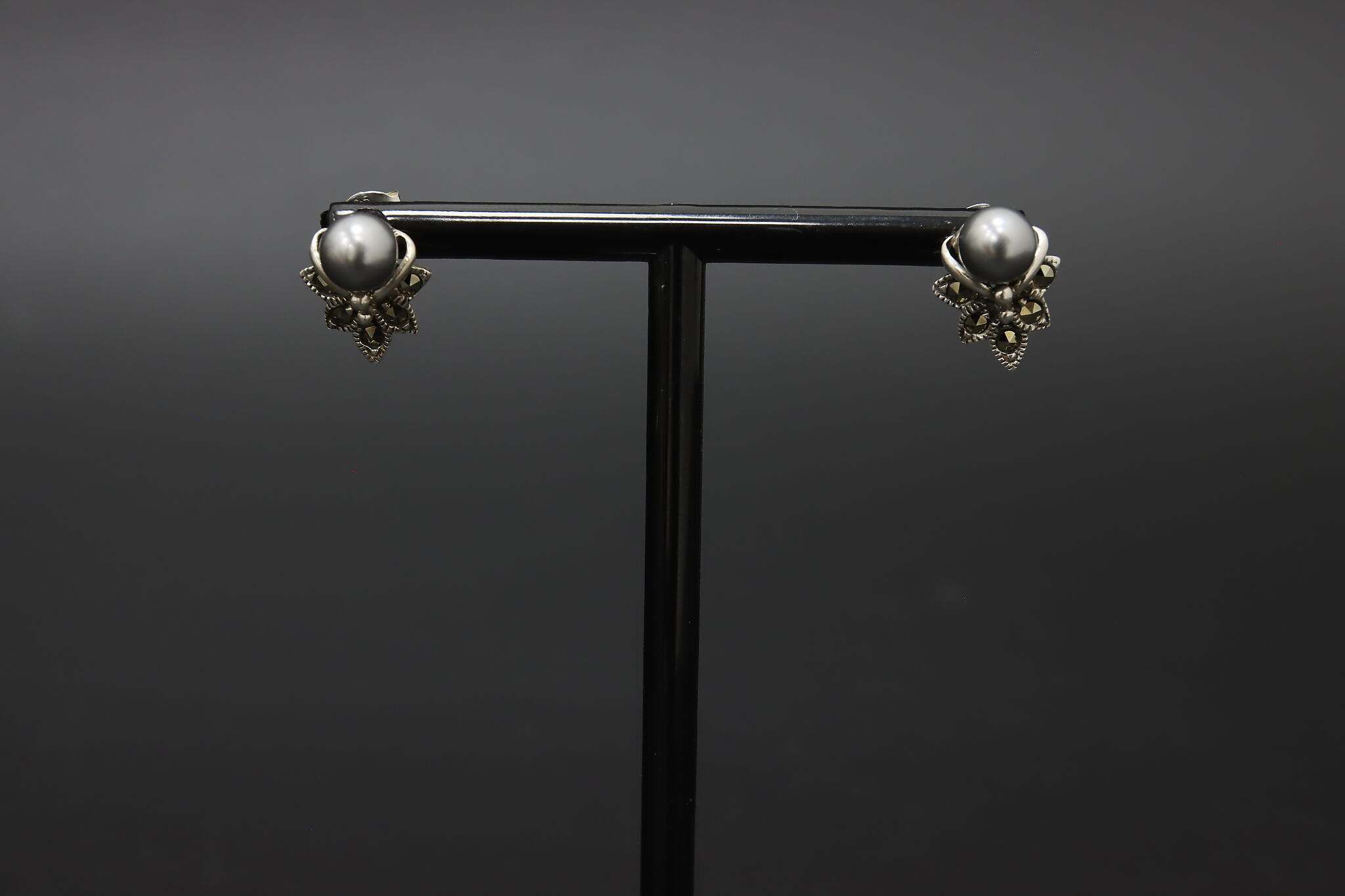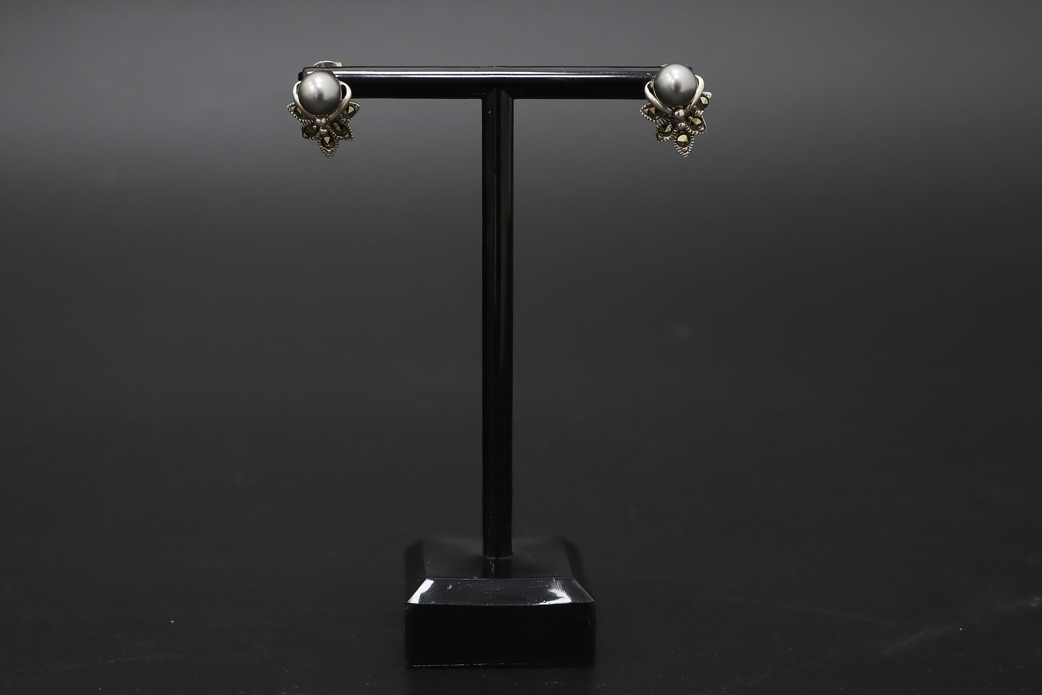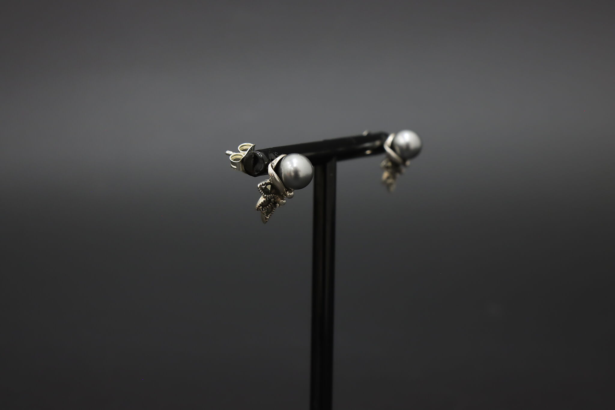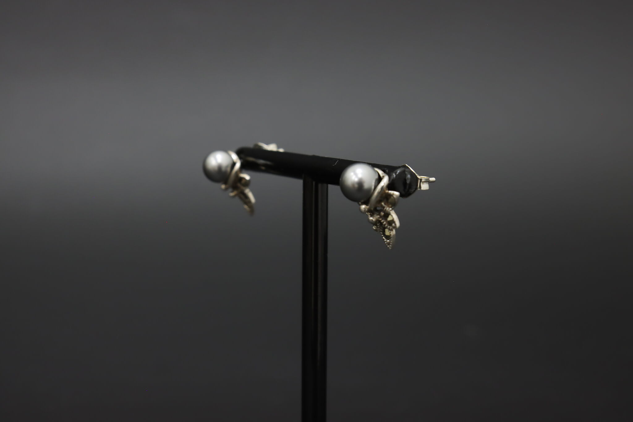 An elegant pair of earrings have beautiful grey freshwater pearls complimented by olive green cubic zirconia gemstones.