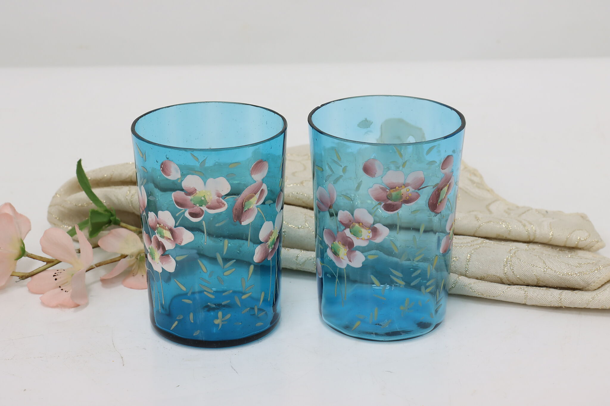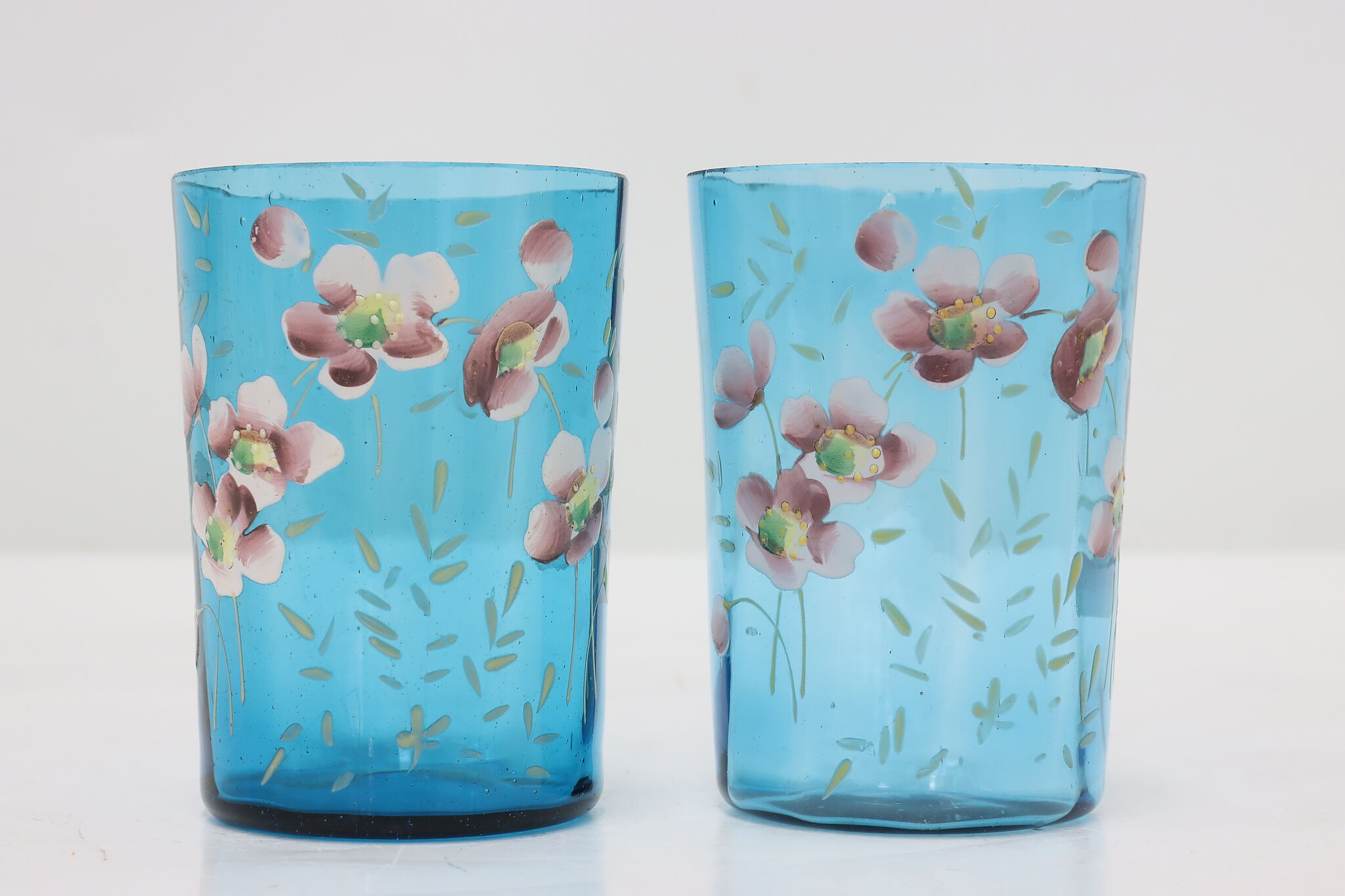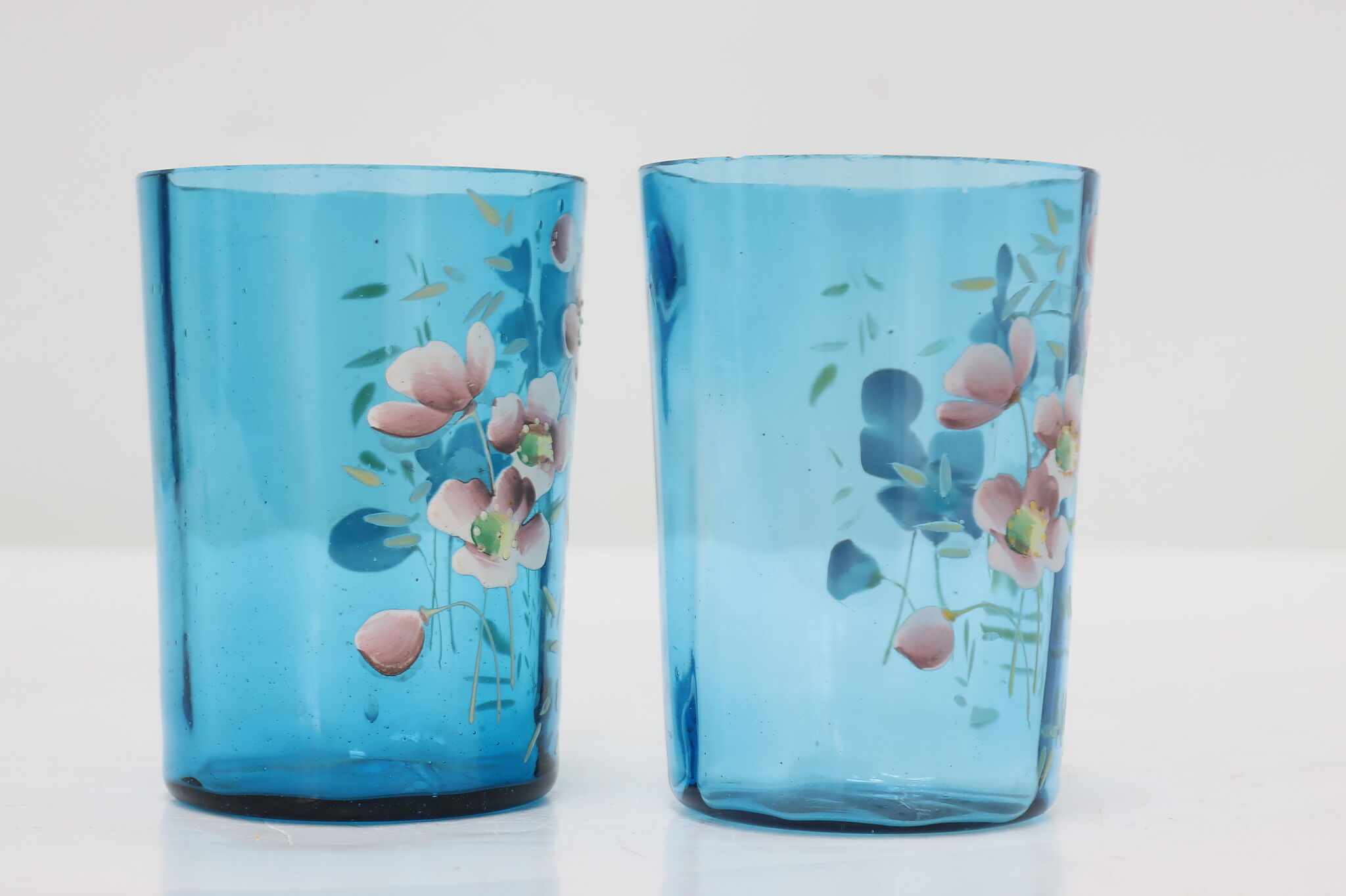 A pair of Victorian period glass tumblers have beautiful hand-painted flowers.