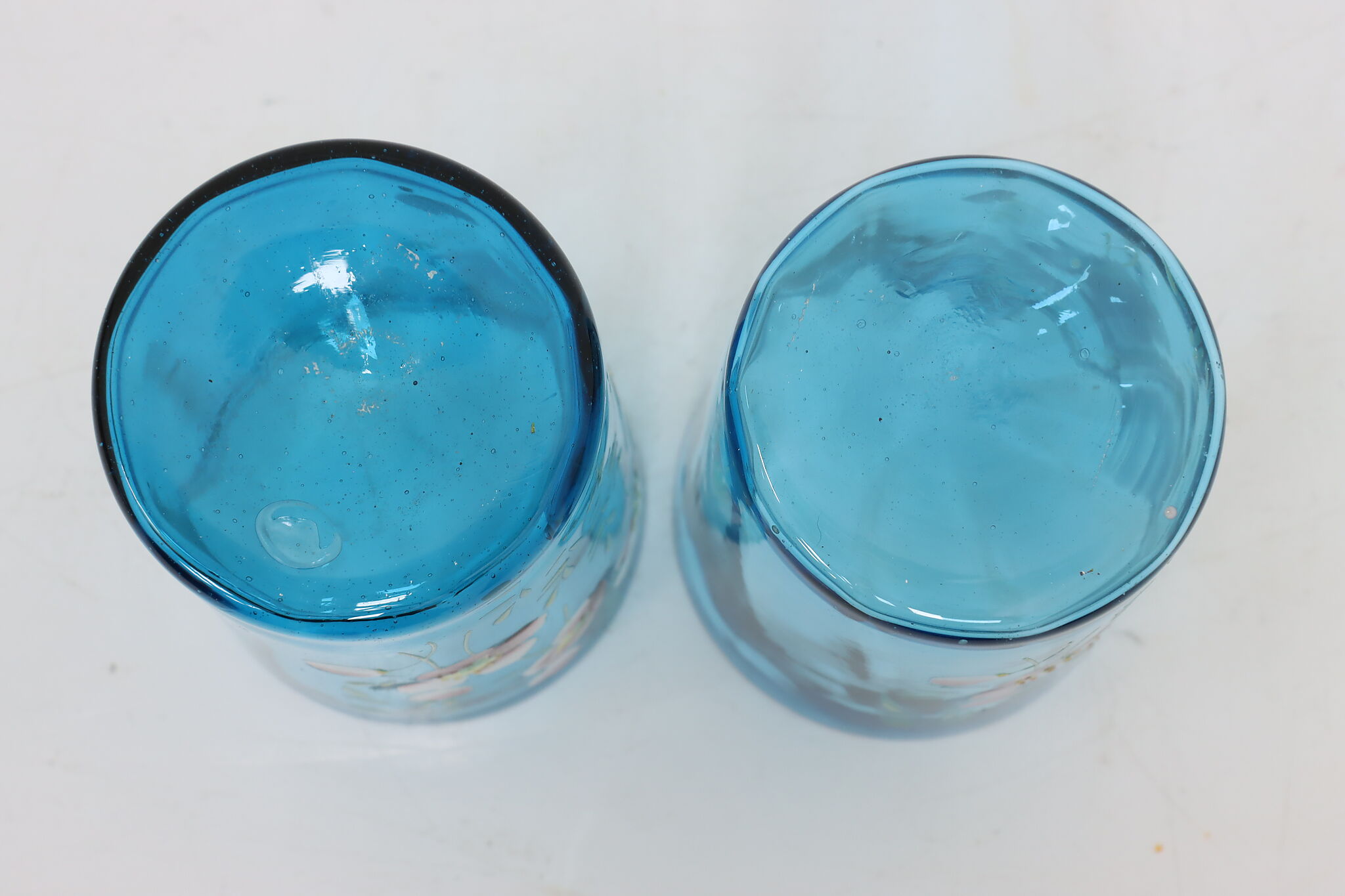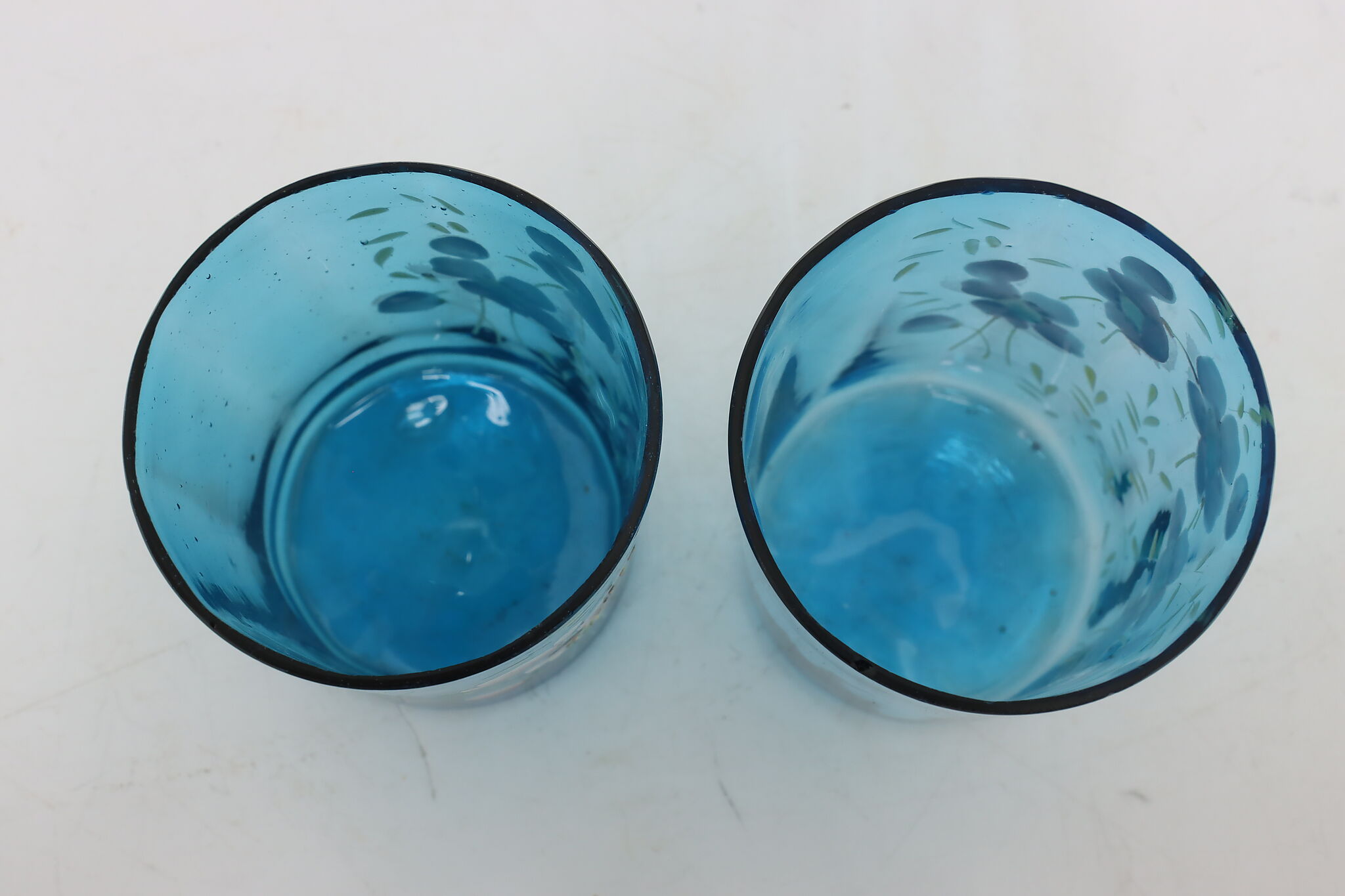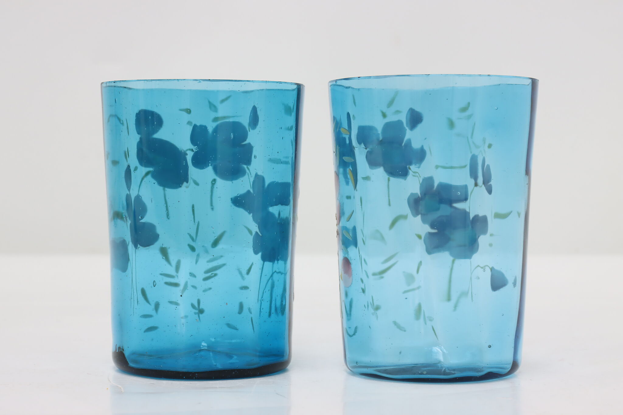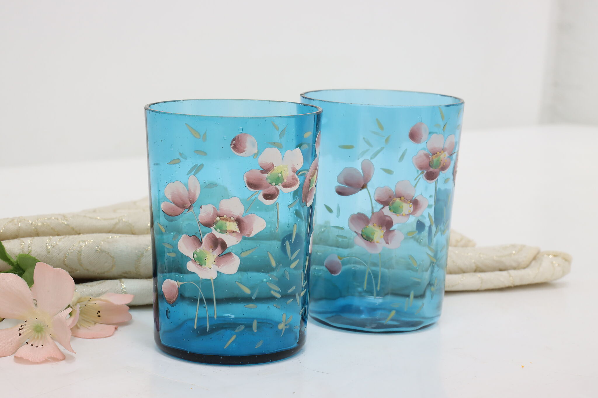 A pair of Victorian period glass tumblers have beautiful hand-painted flowers.