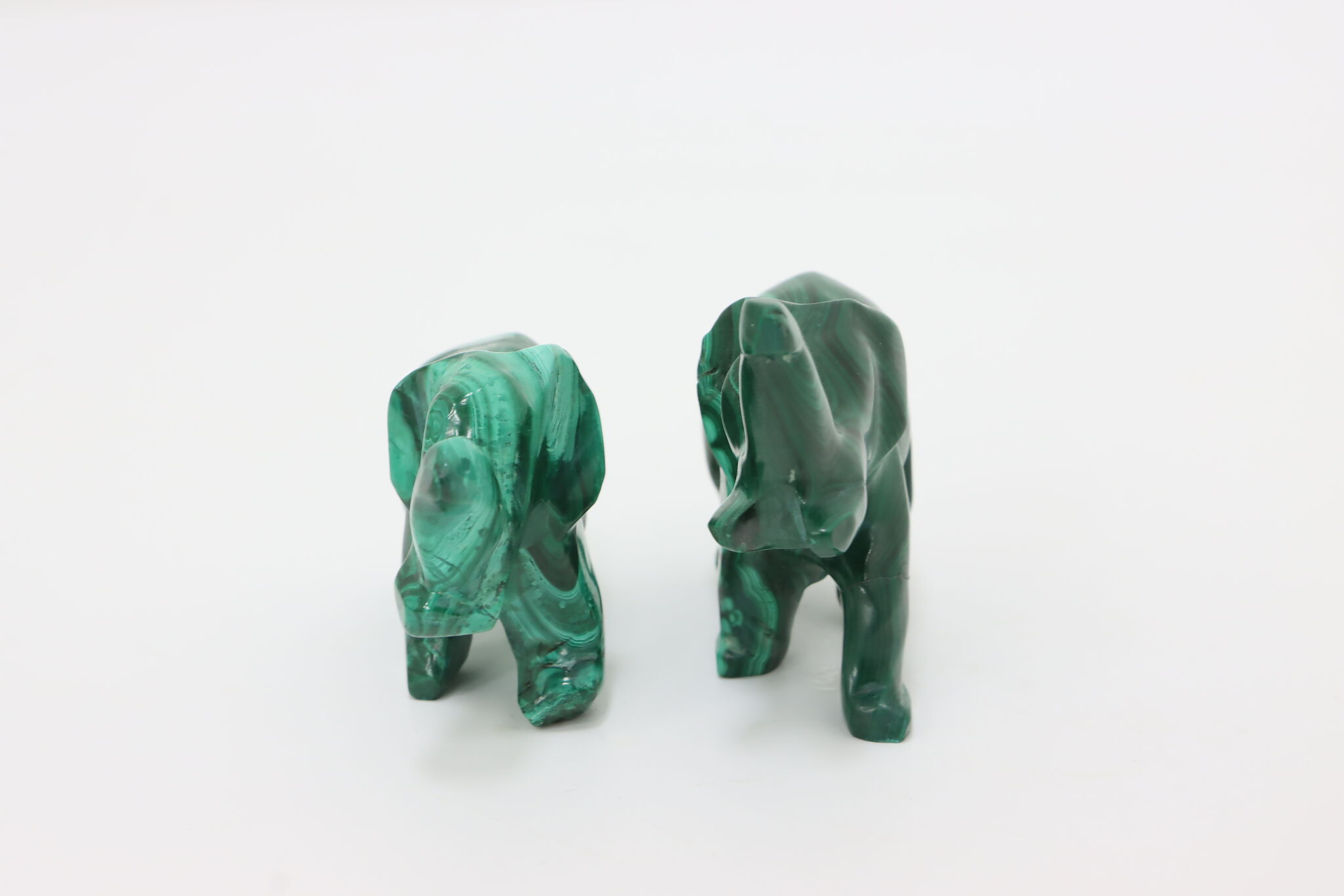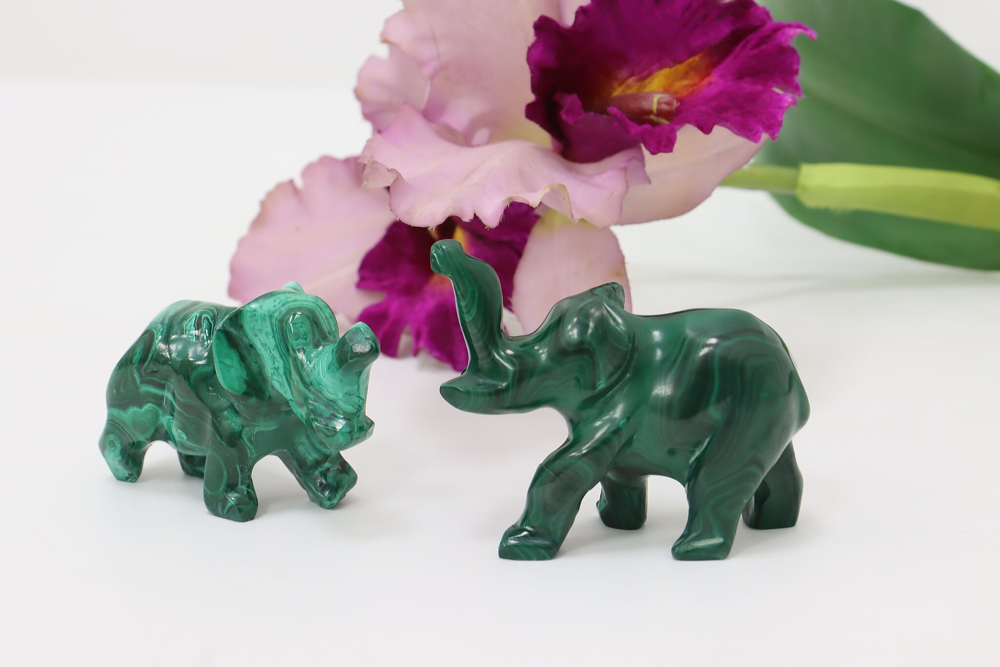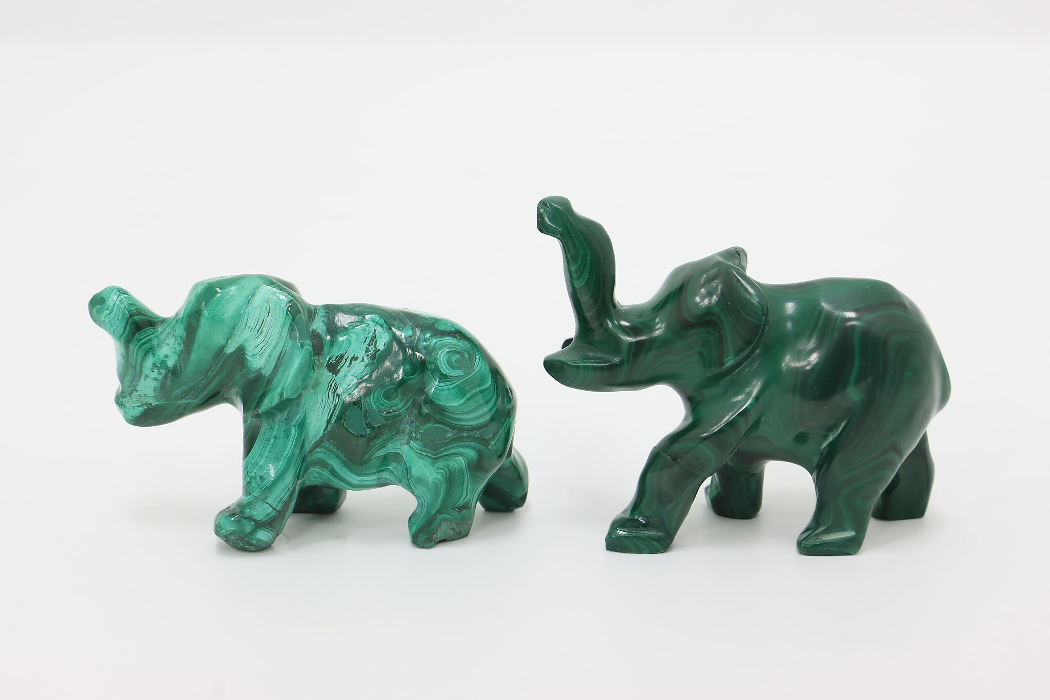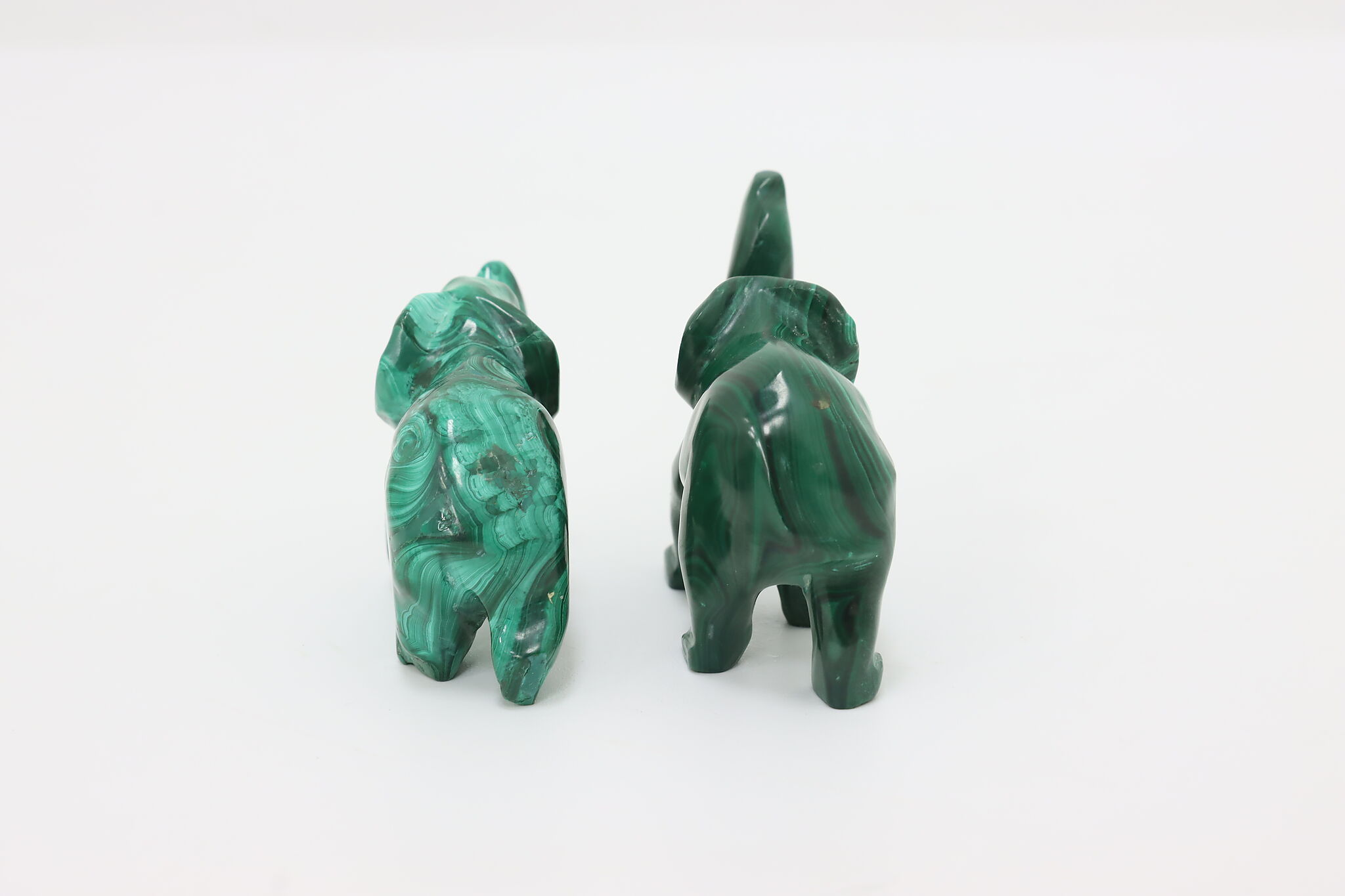 This pair of elephant sculptures are hand carved of gorgeous genuine semi-precious malachite.