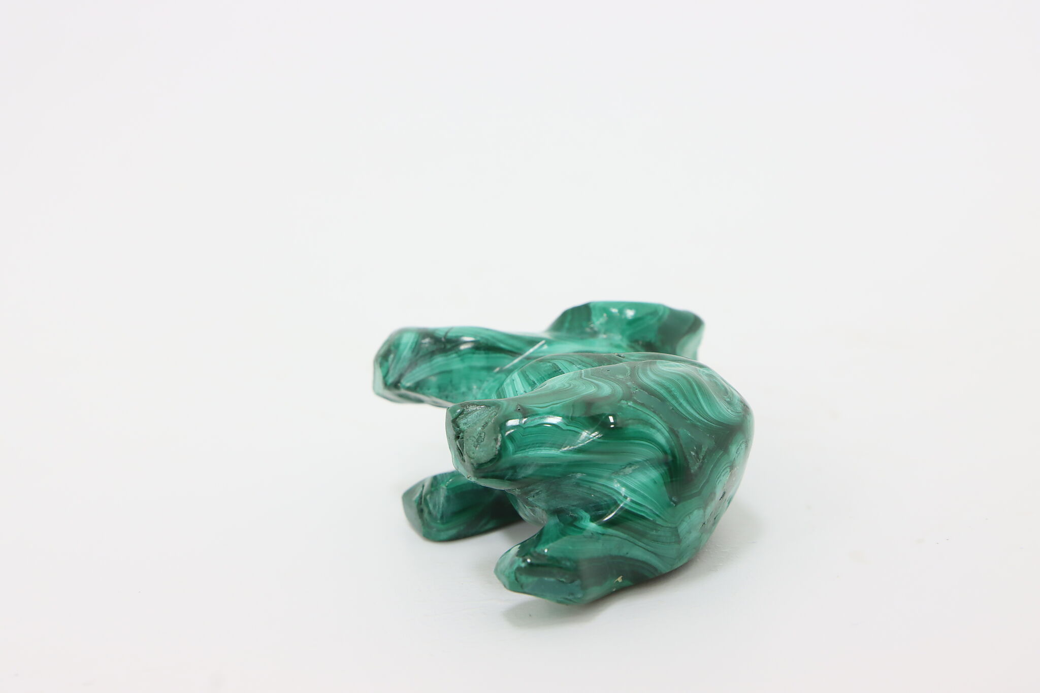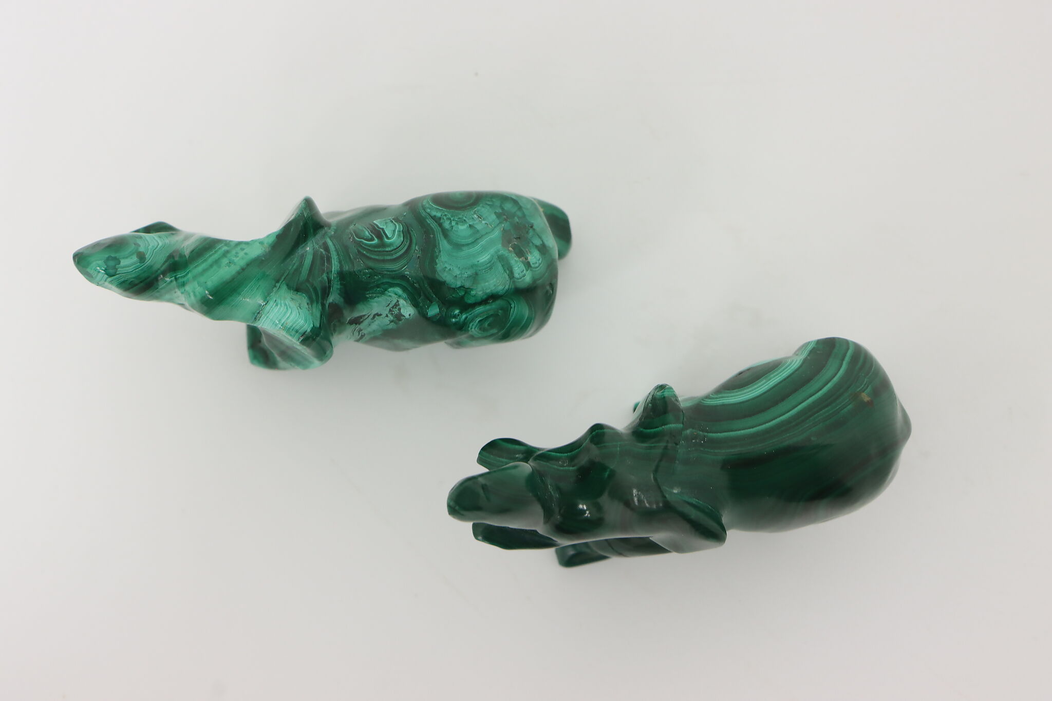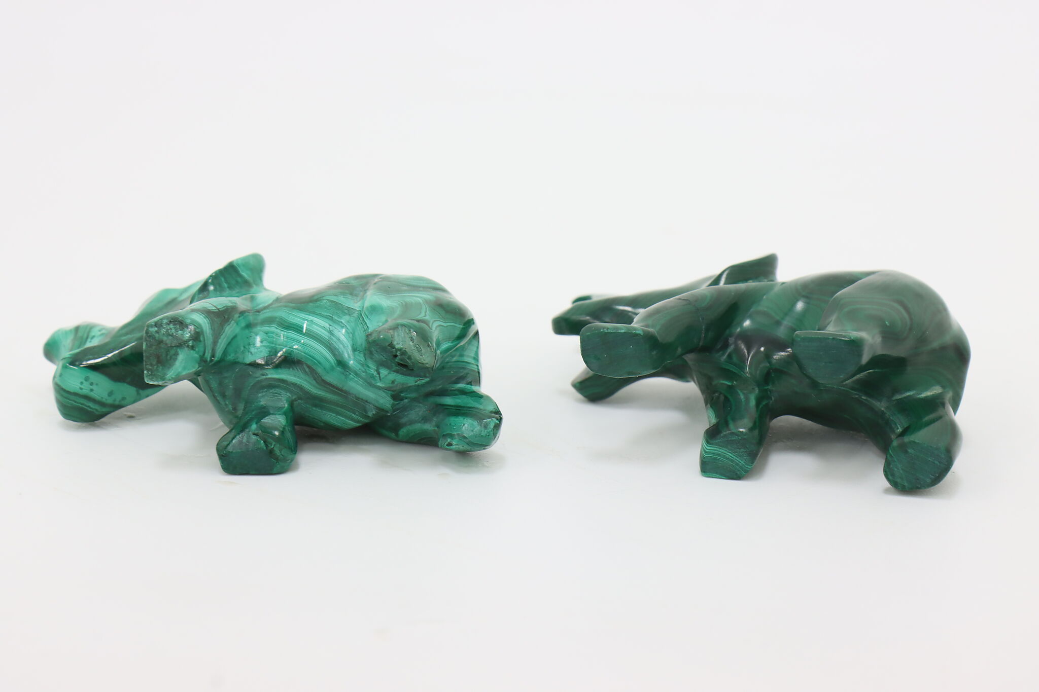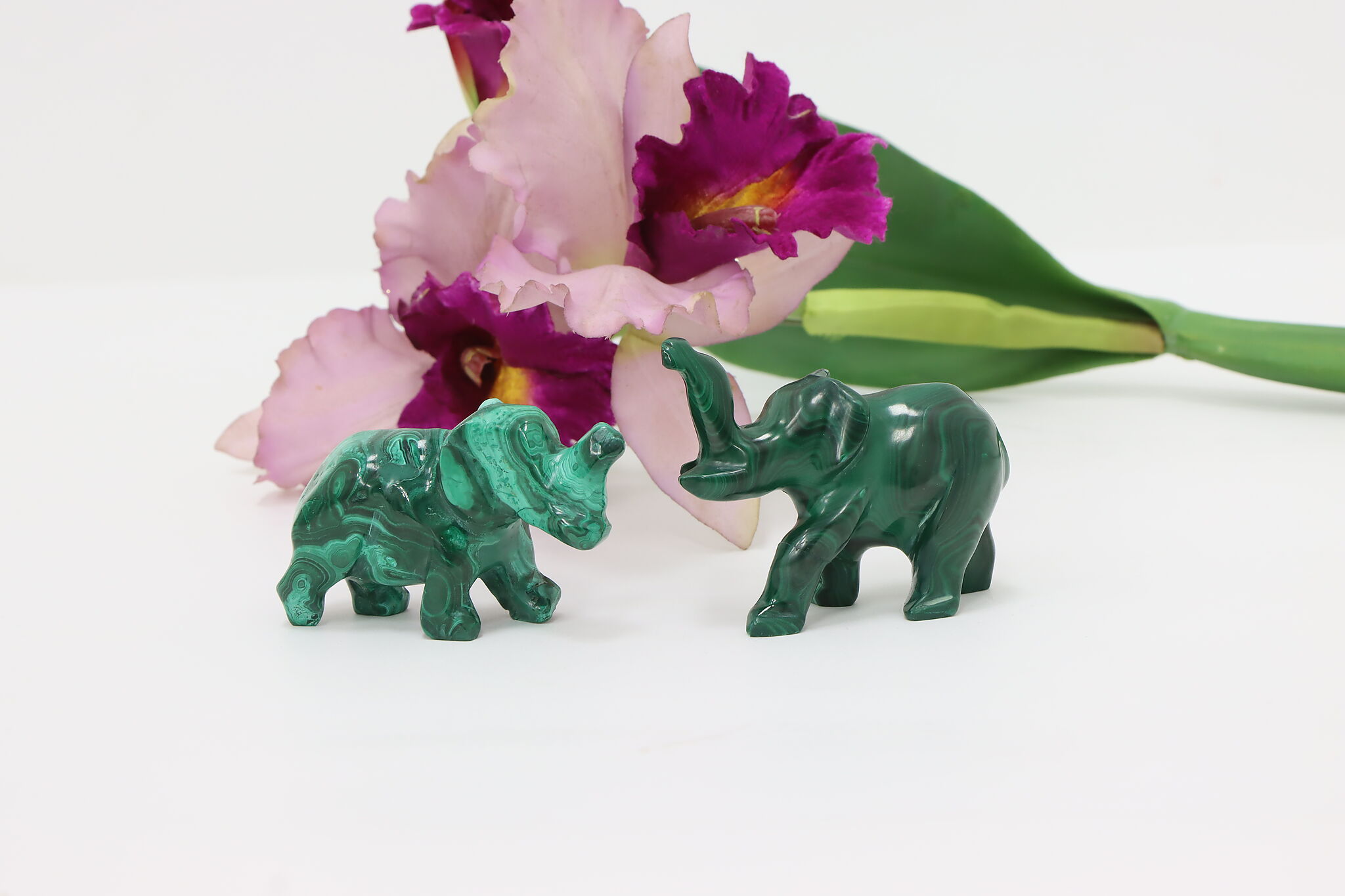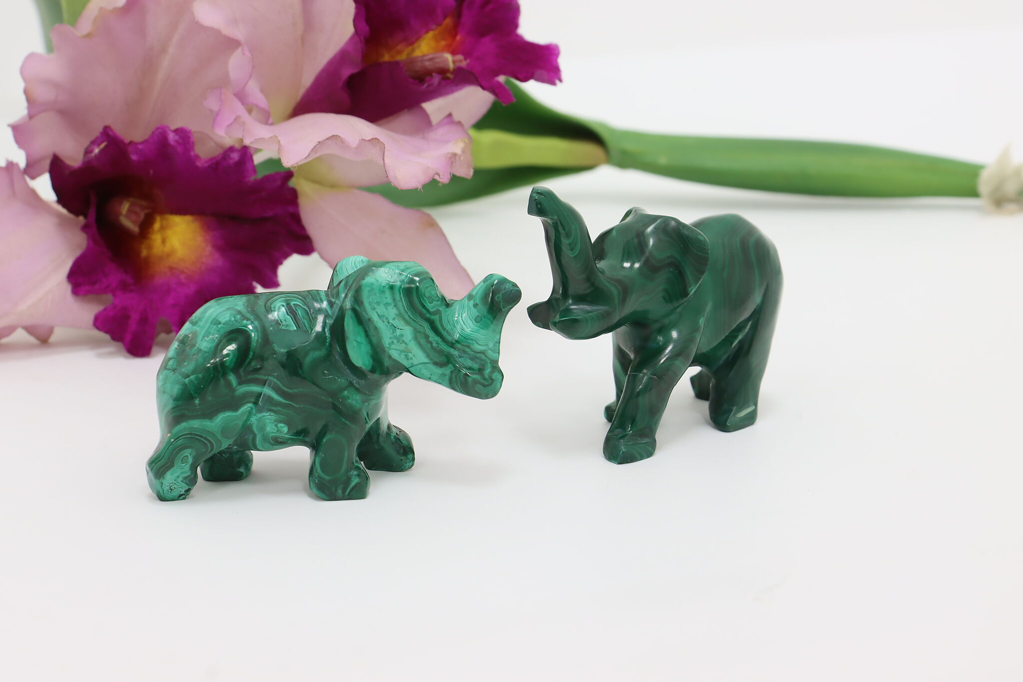 This pair of elephant sculptures are hand carved of gorgeous genuine semi-precious malachite.
