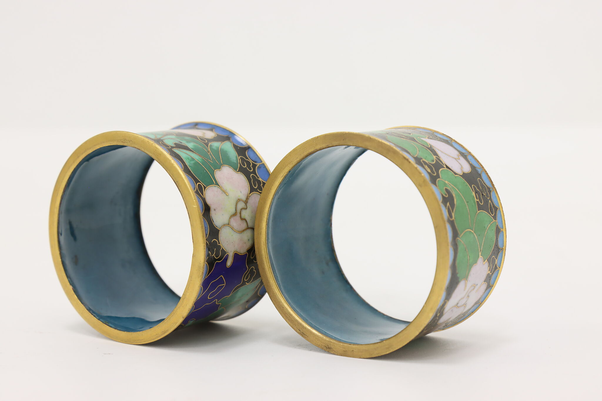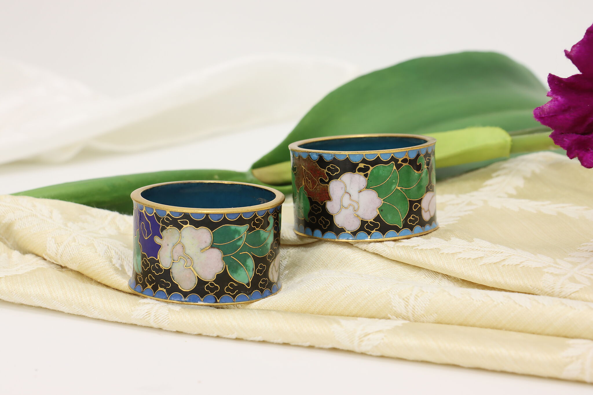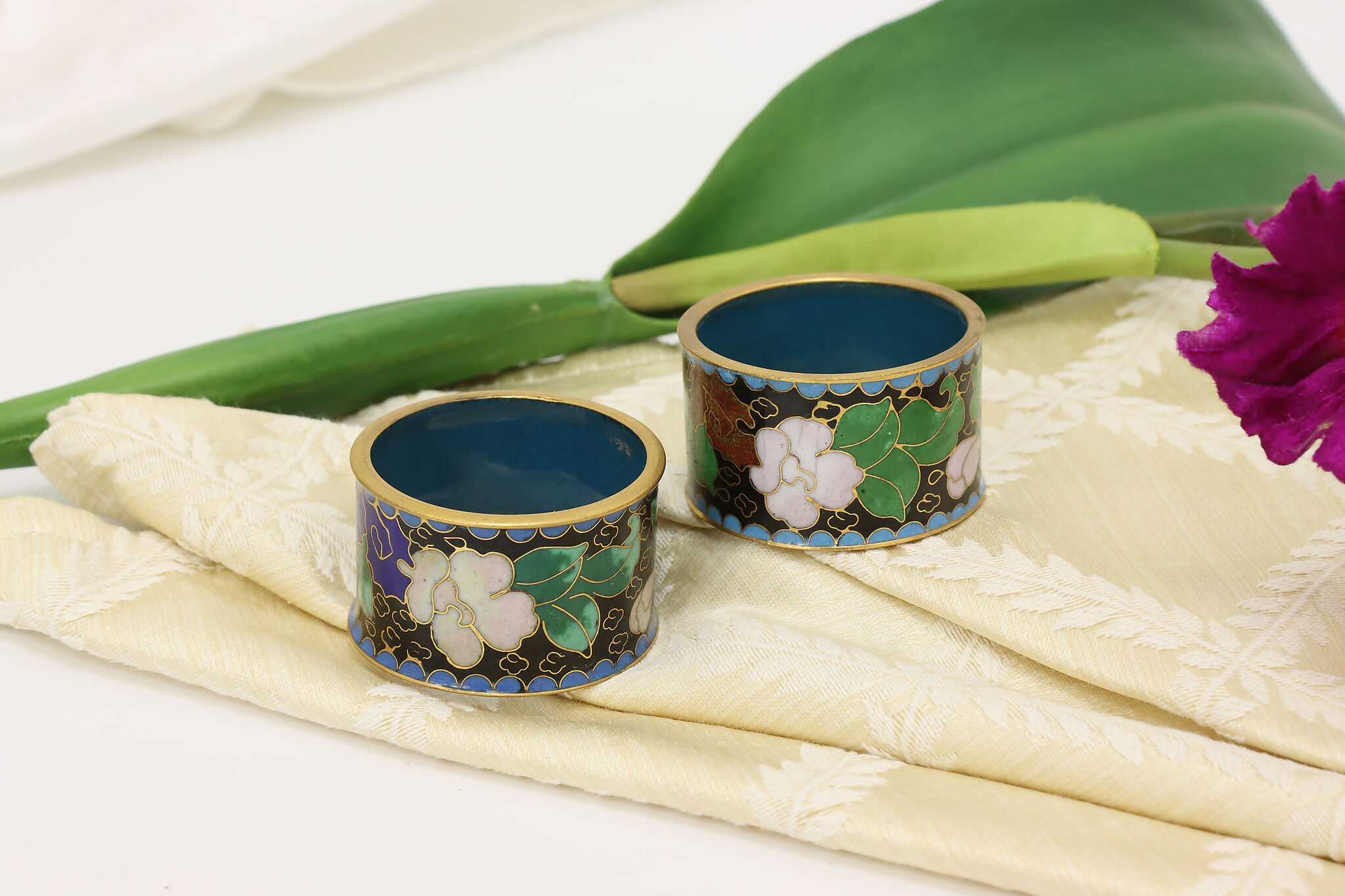 This beautiful pair of traditional "cloisonne" or intricate enamel over brass napkin rings would be wonderful given as gifts.