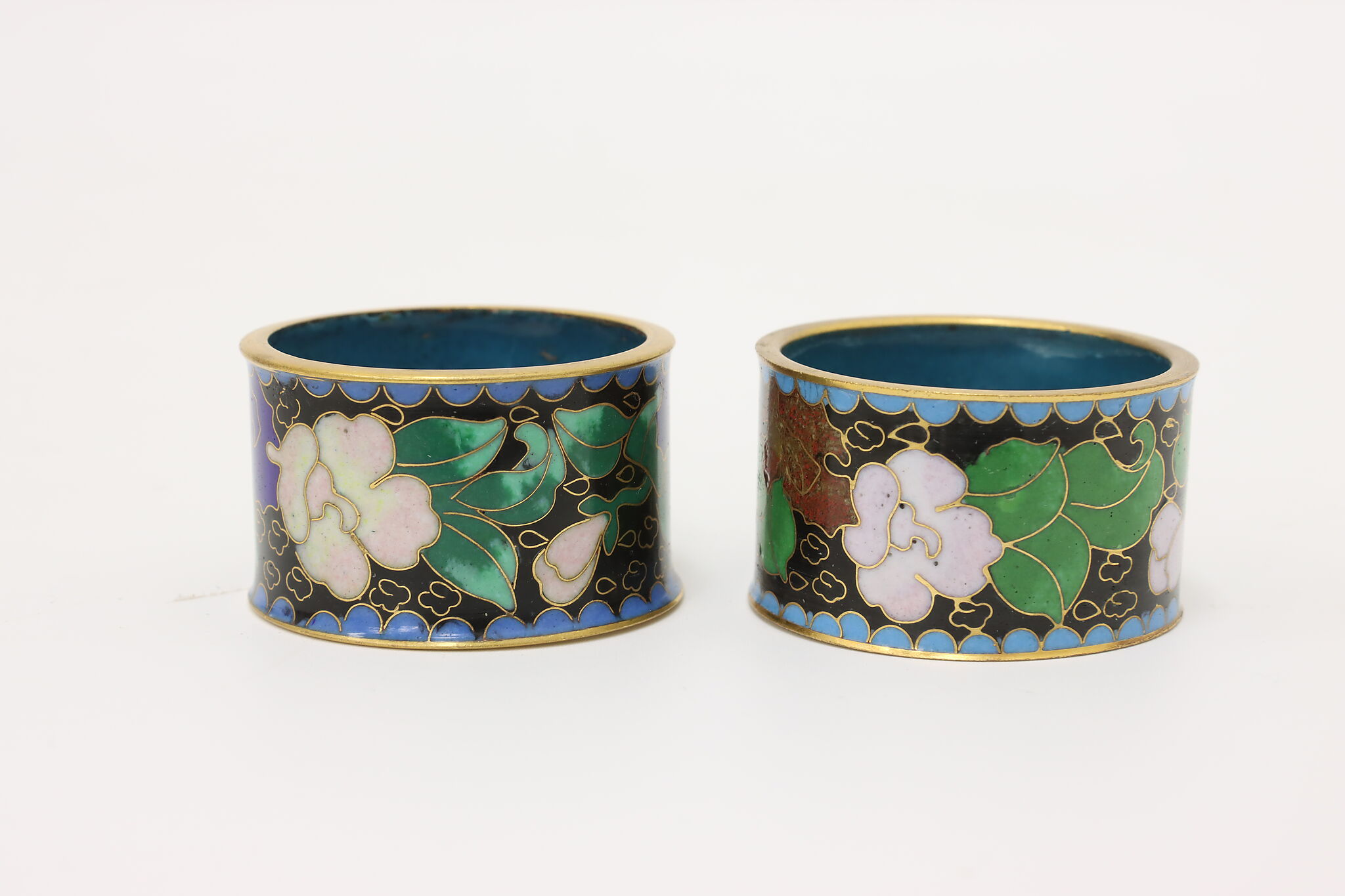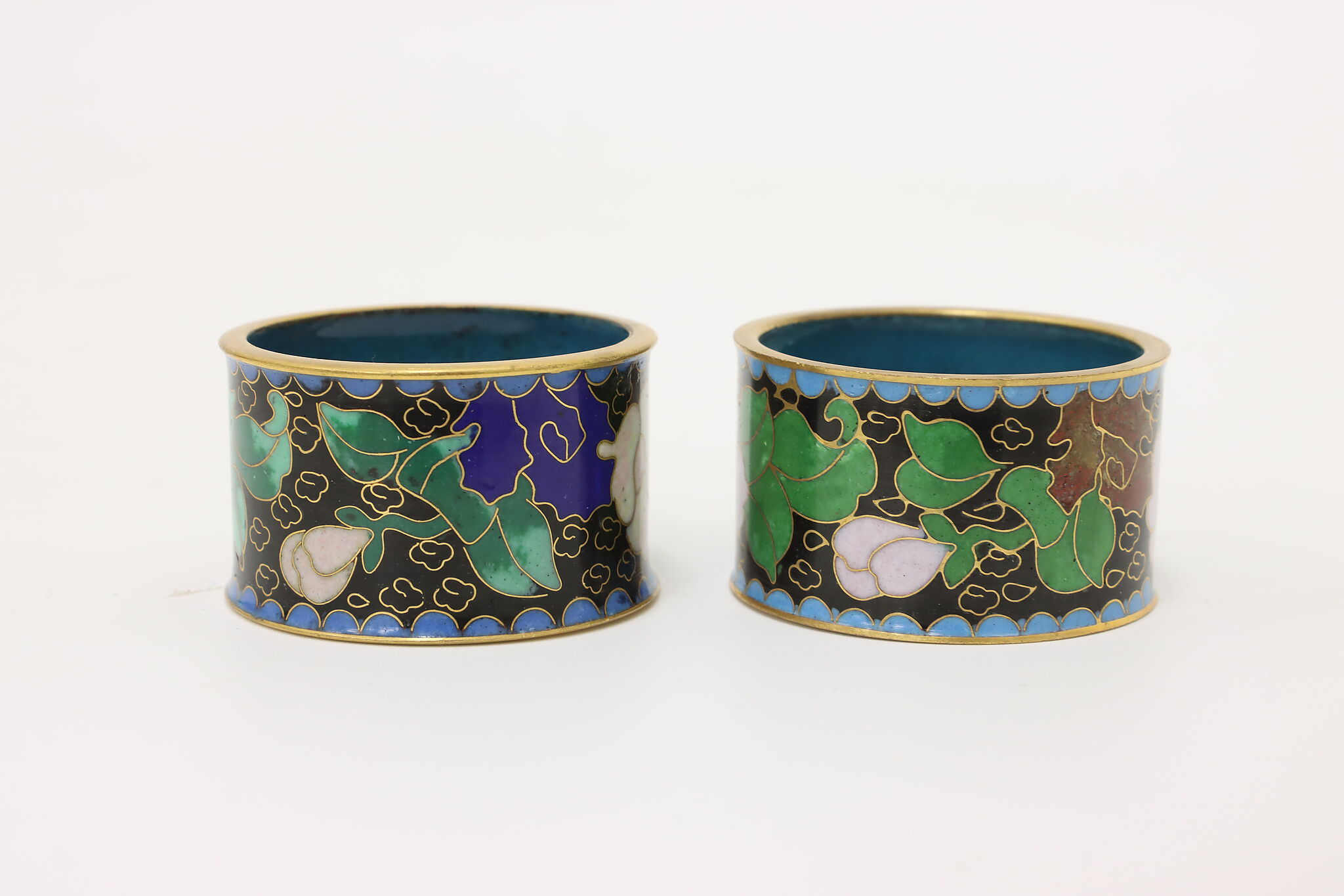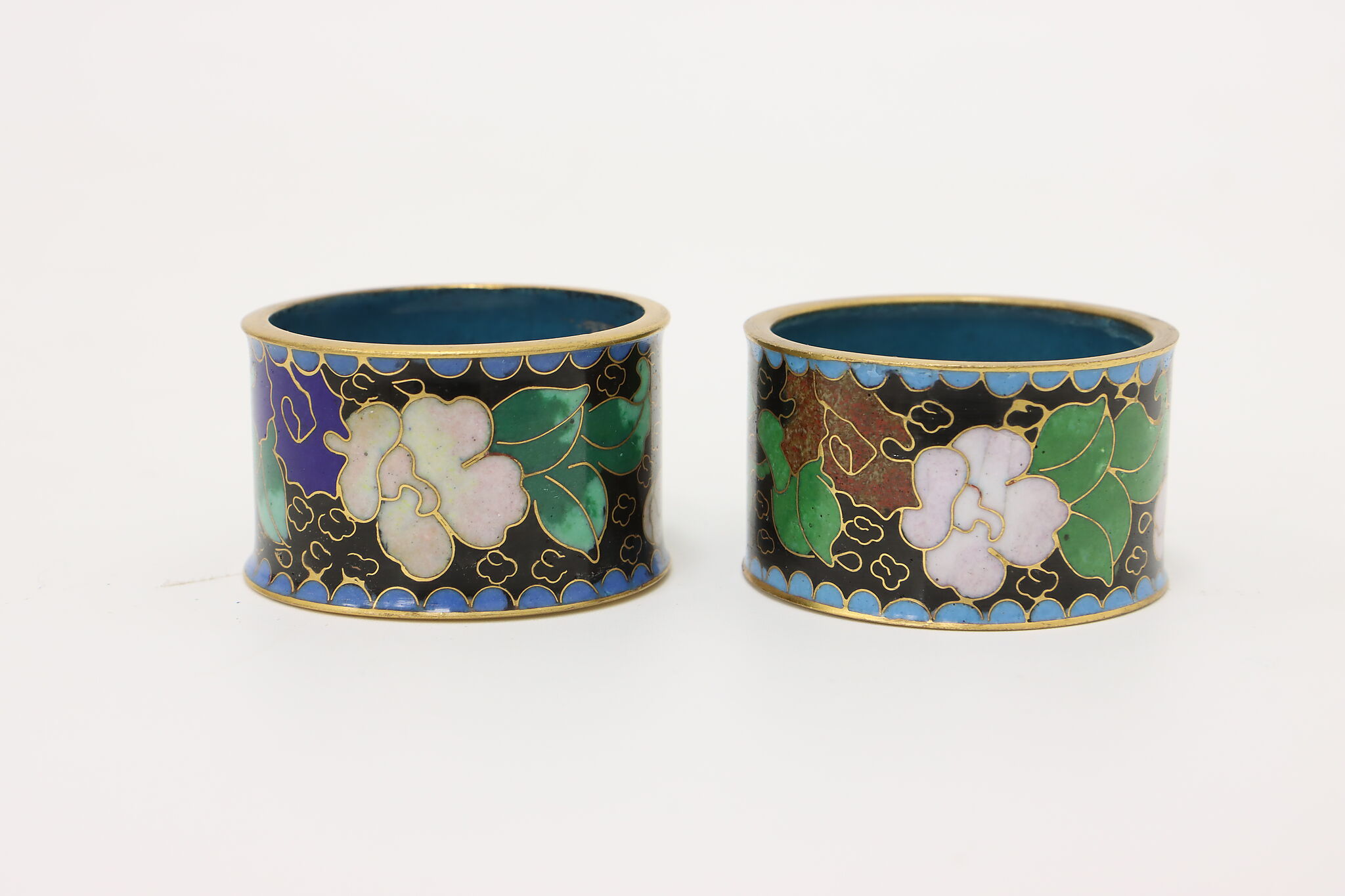 This beautiful pair of traditional "cloisonne" or intricate enamel over brass napkin rings would be wonderful given as gifts.