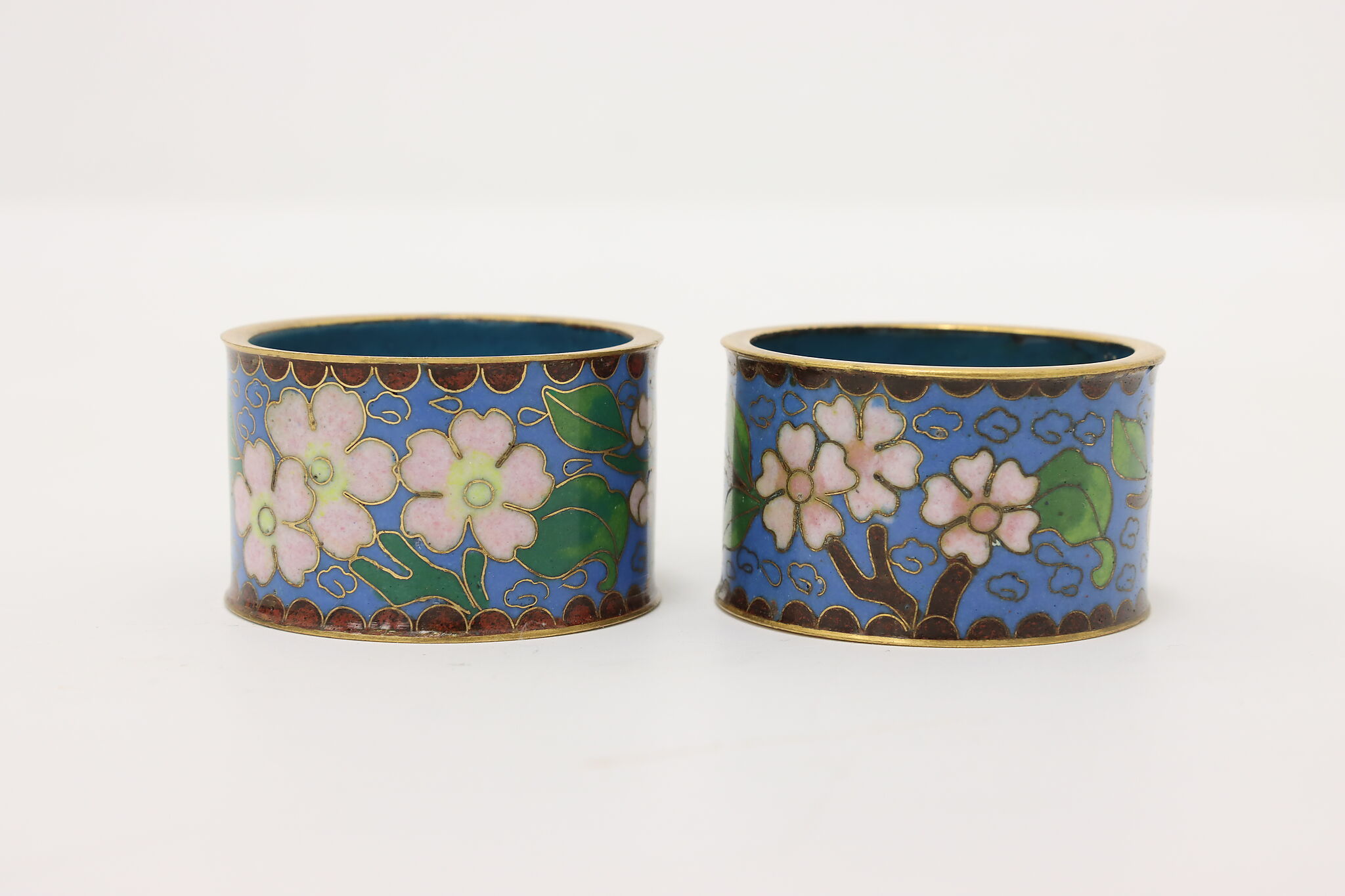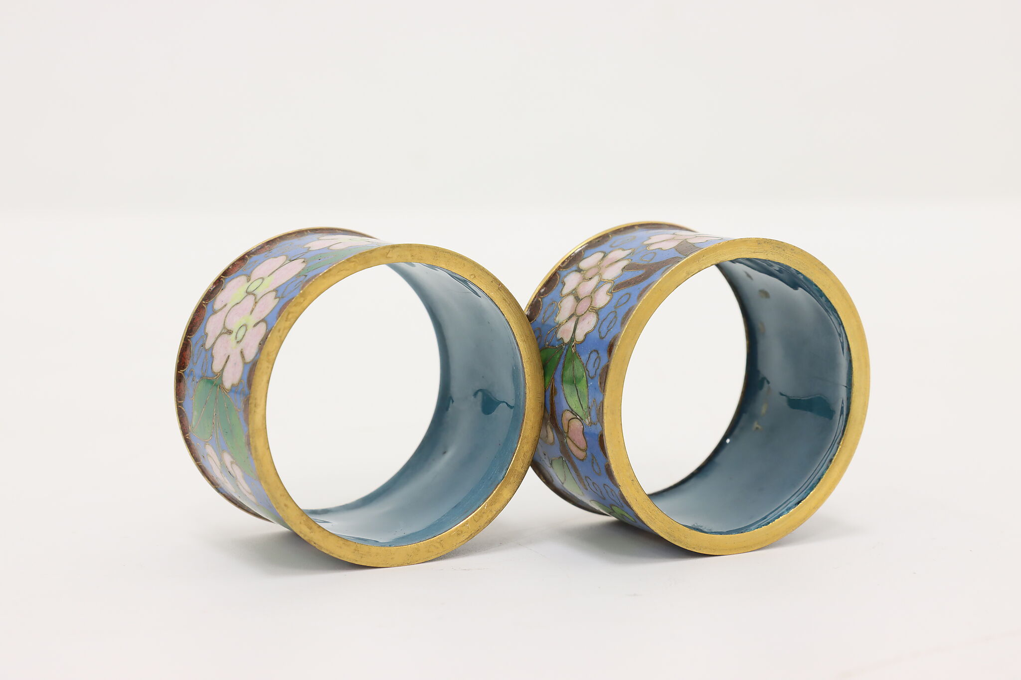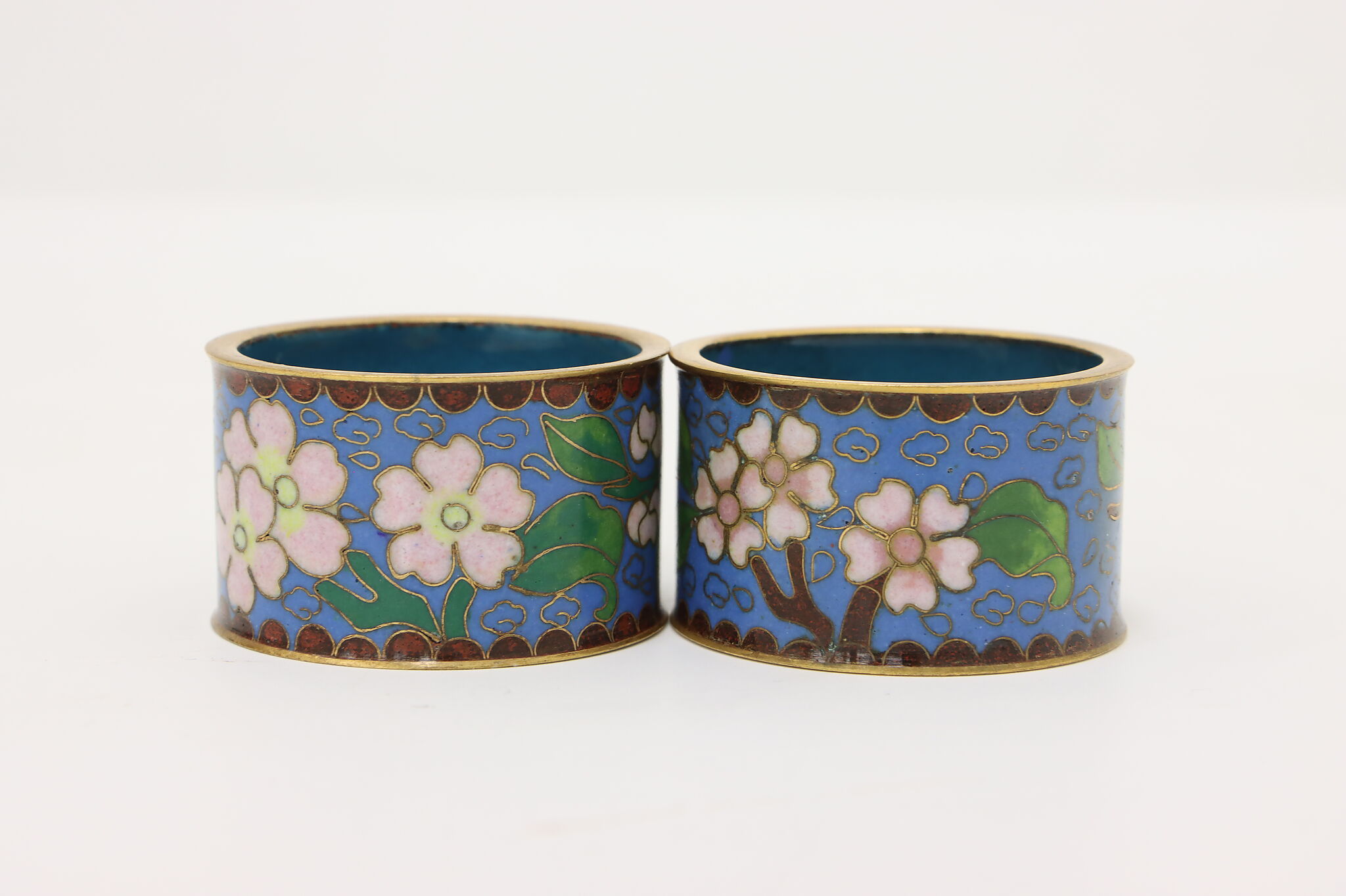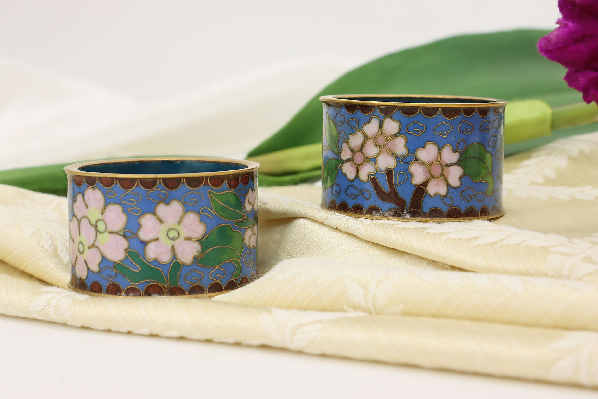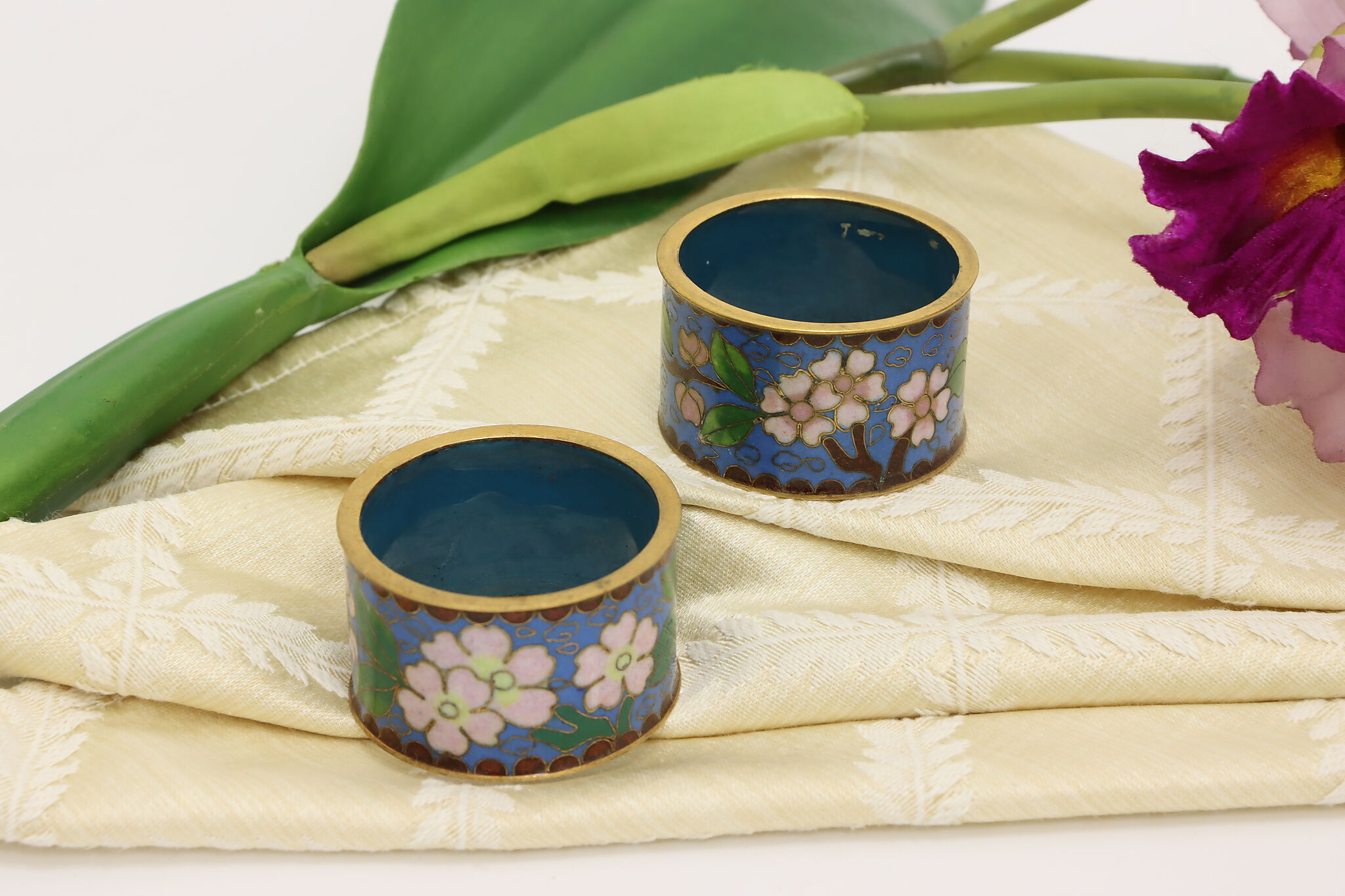This beautiful pair of traditional "cloisonne" or intricate enamel over brass napkin rings would be wonderful given as gifts.