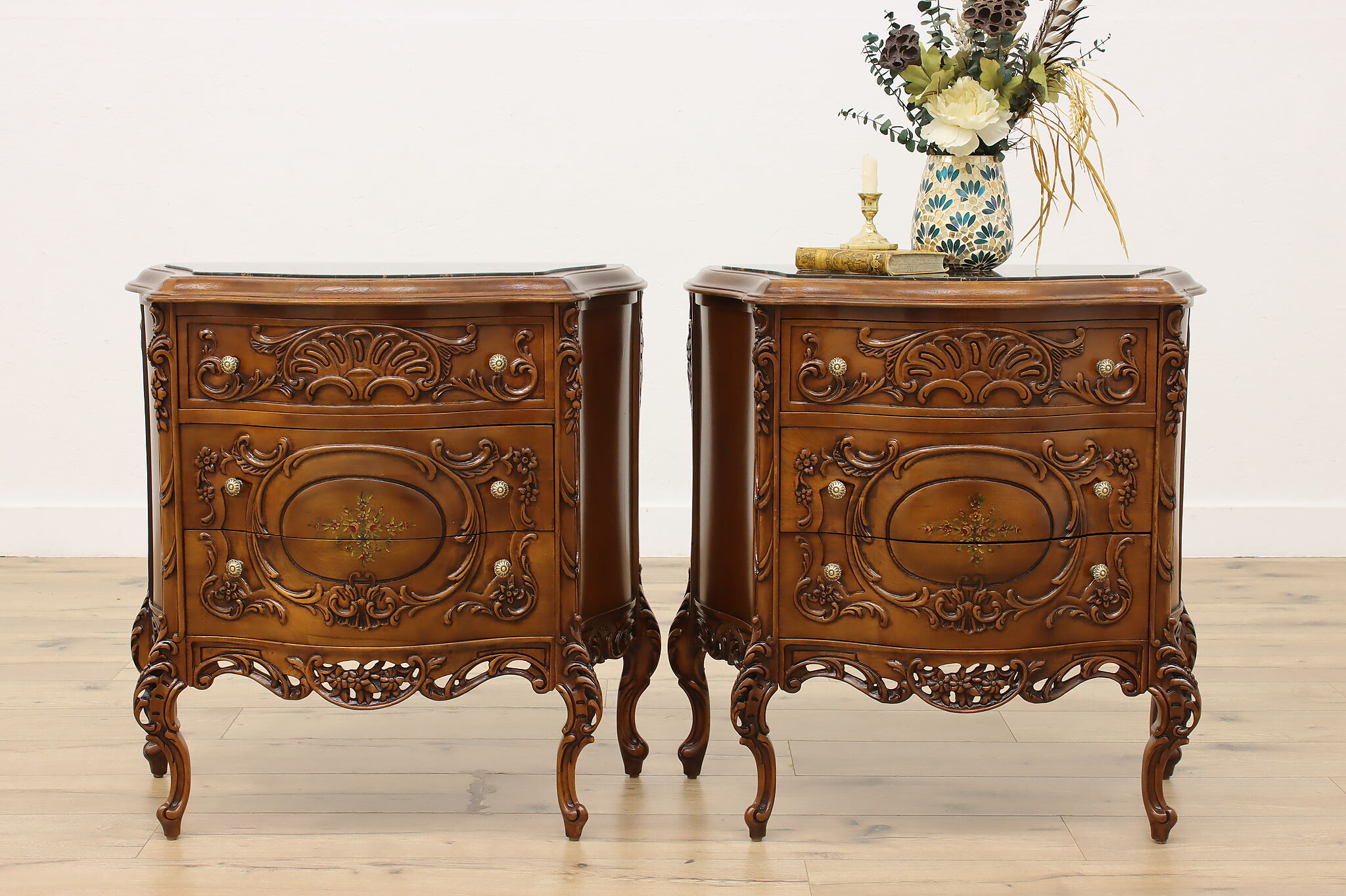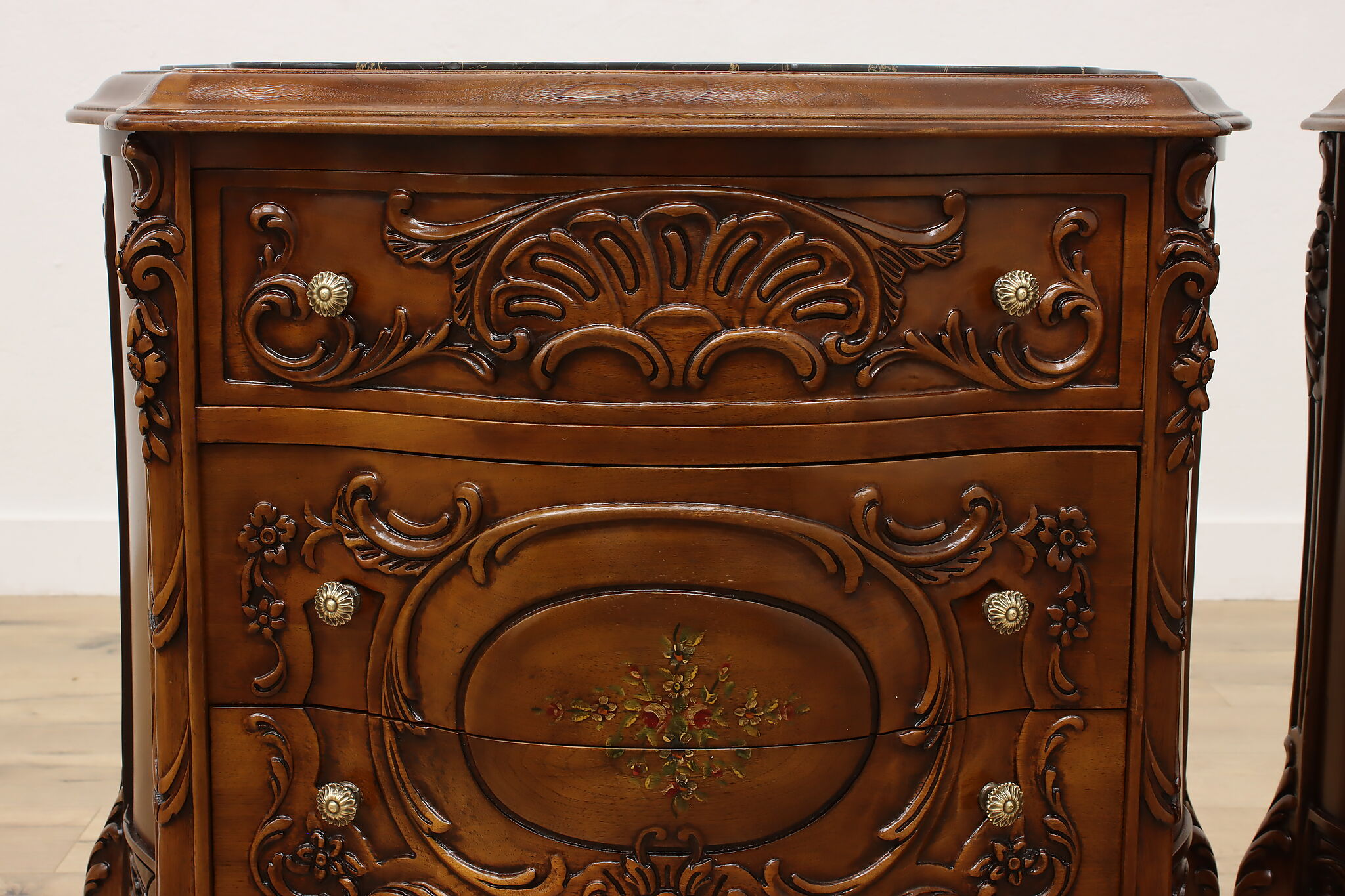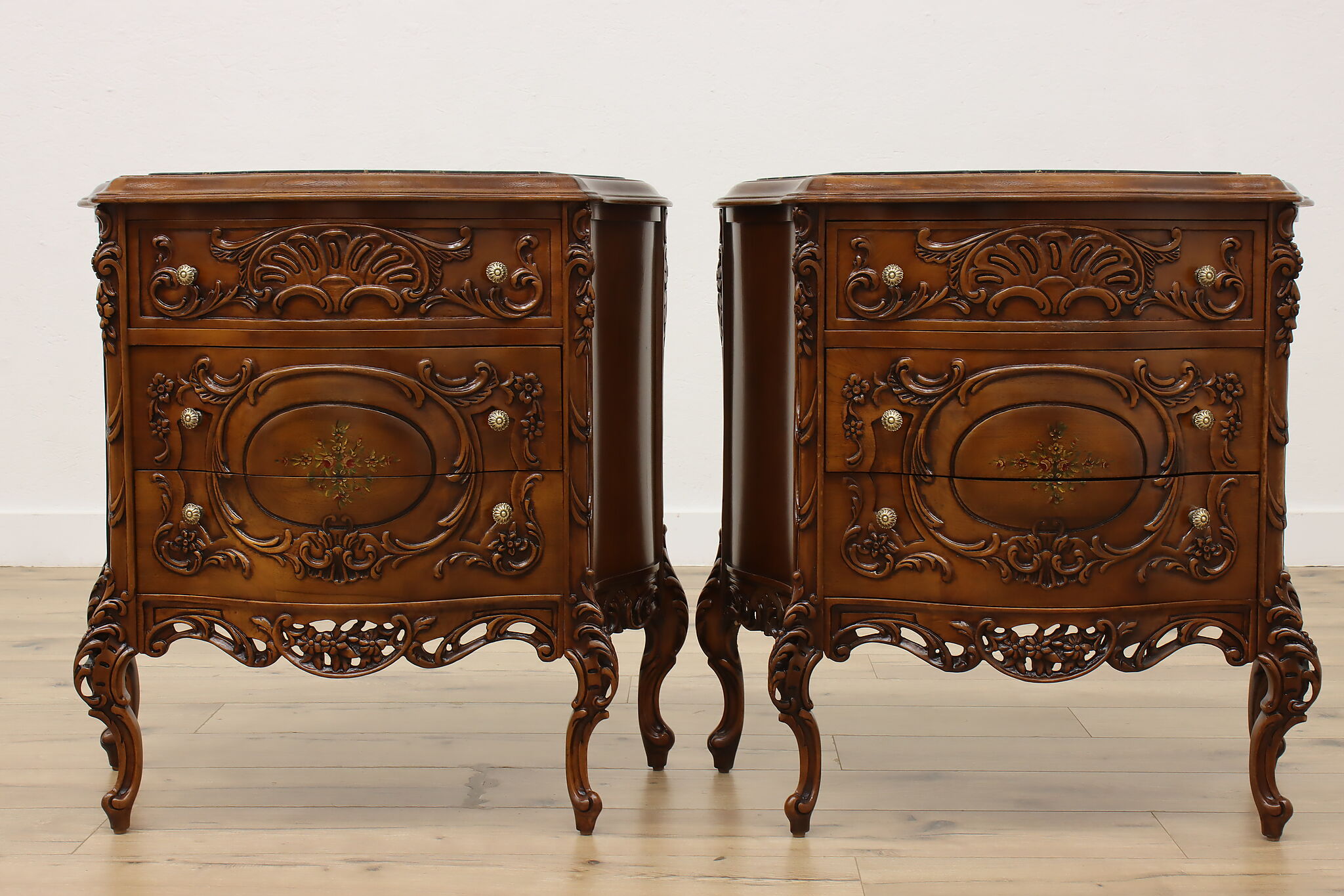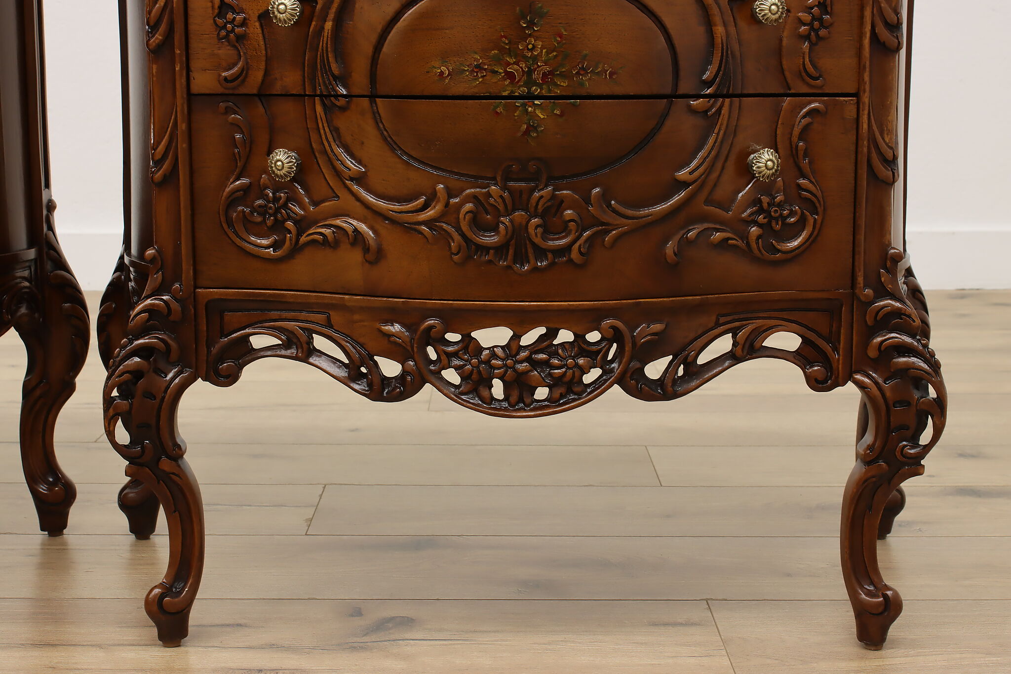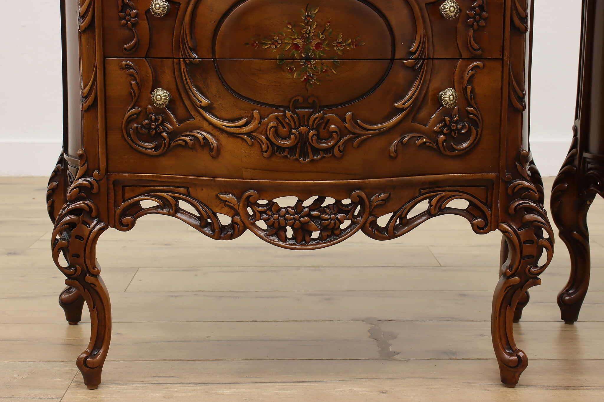 This darling pair of French design nightstands have beautifully carved detailing with hand-painted floral accents for an elegant addition to any room.