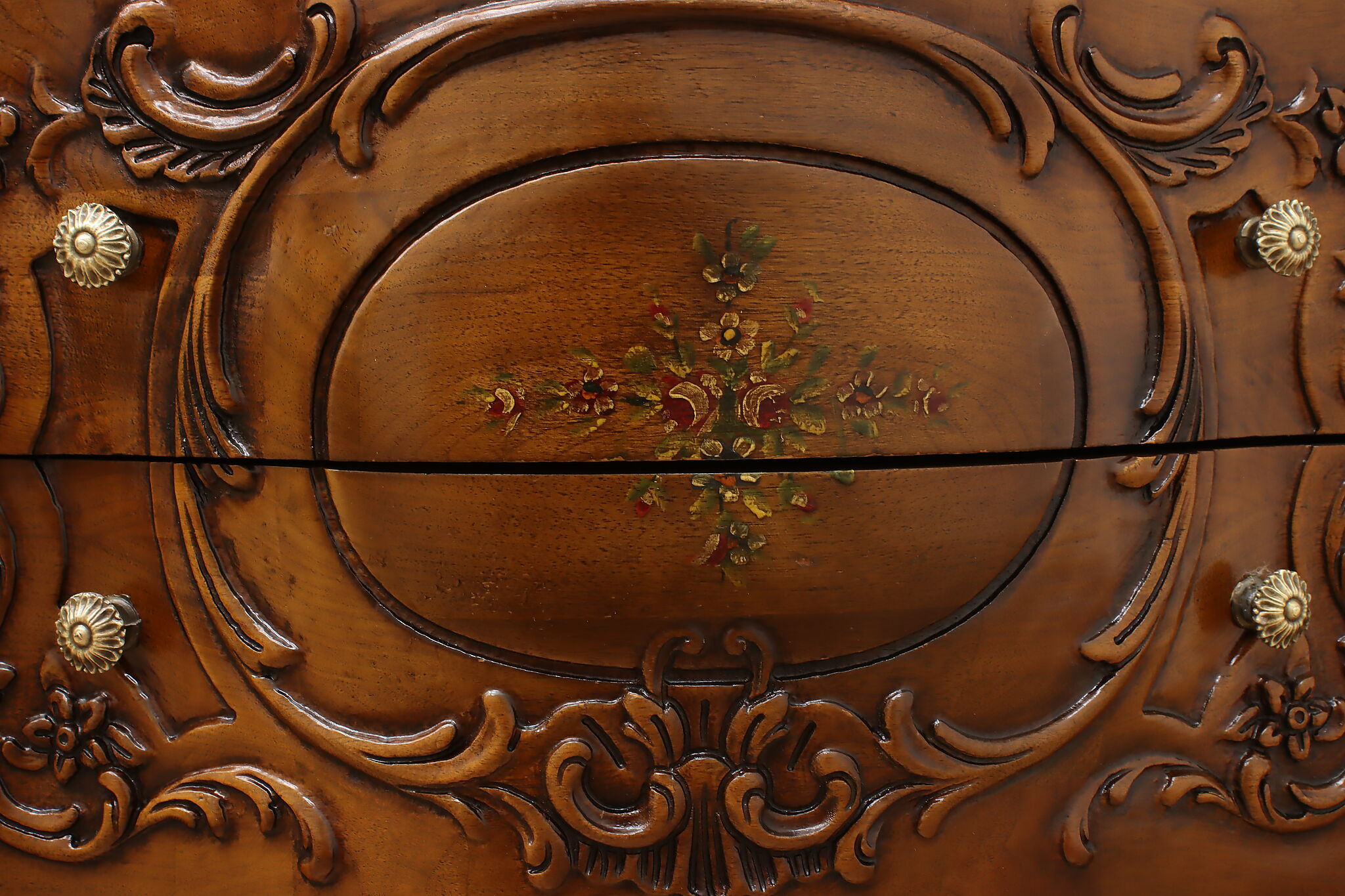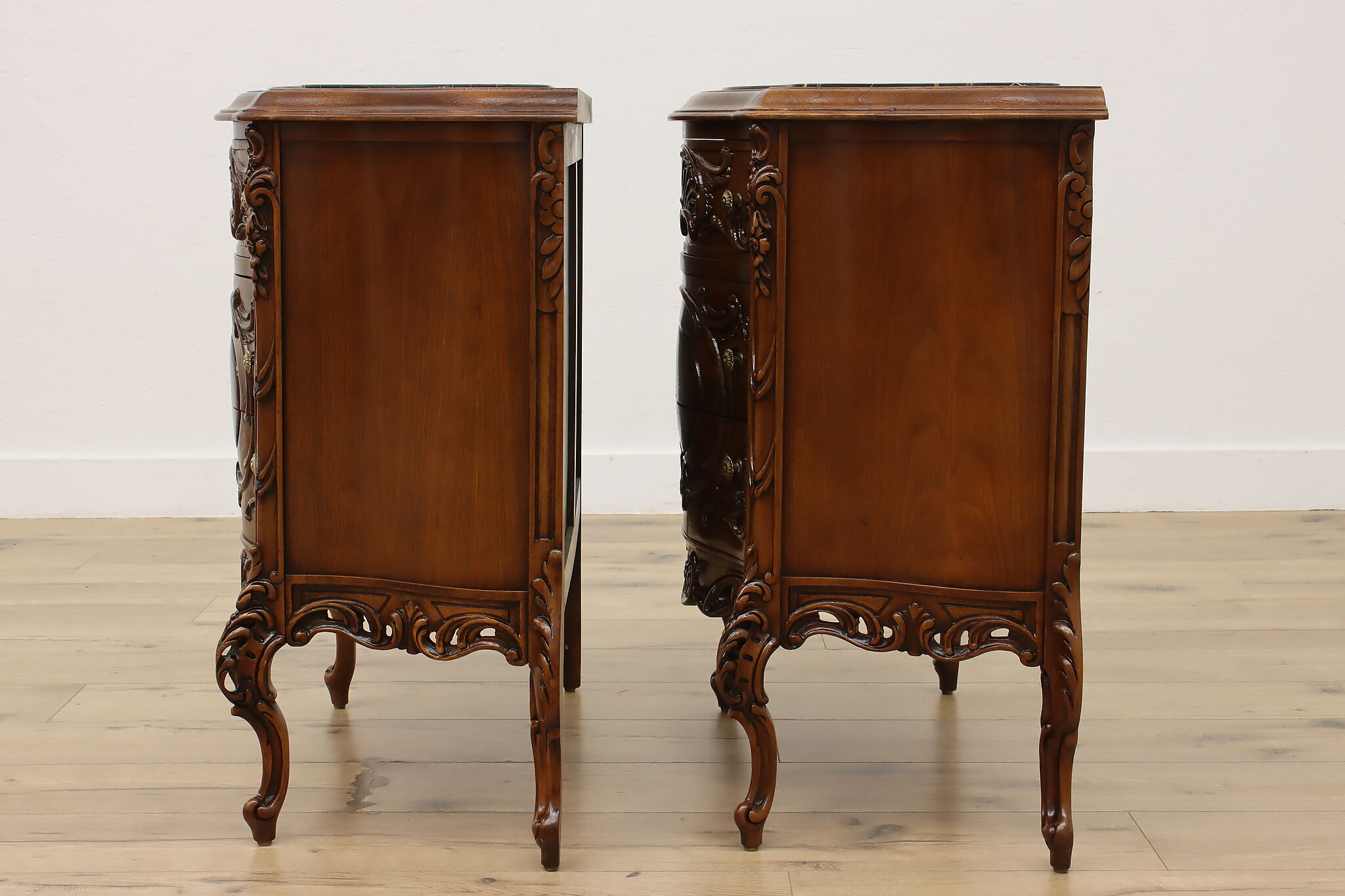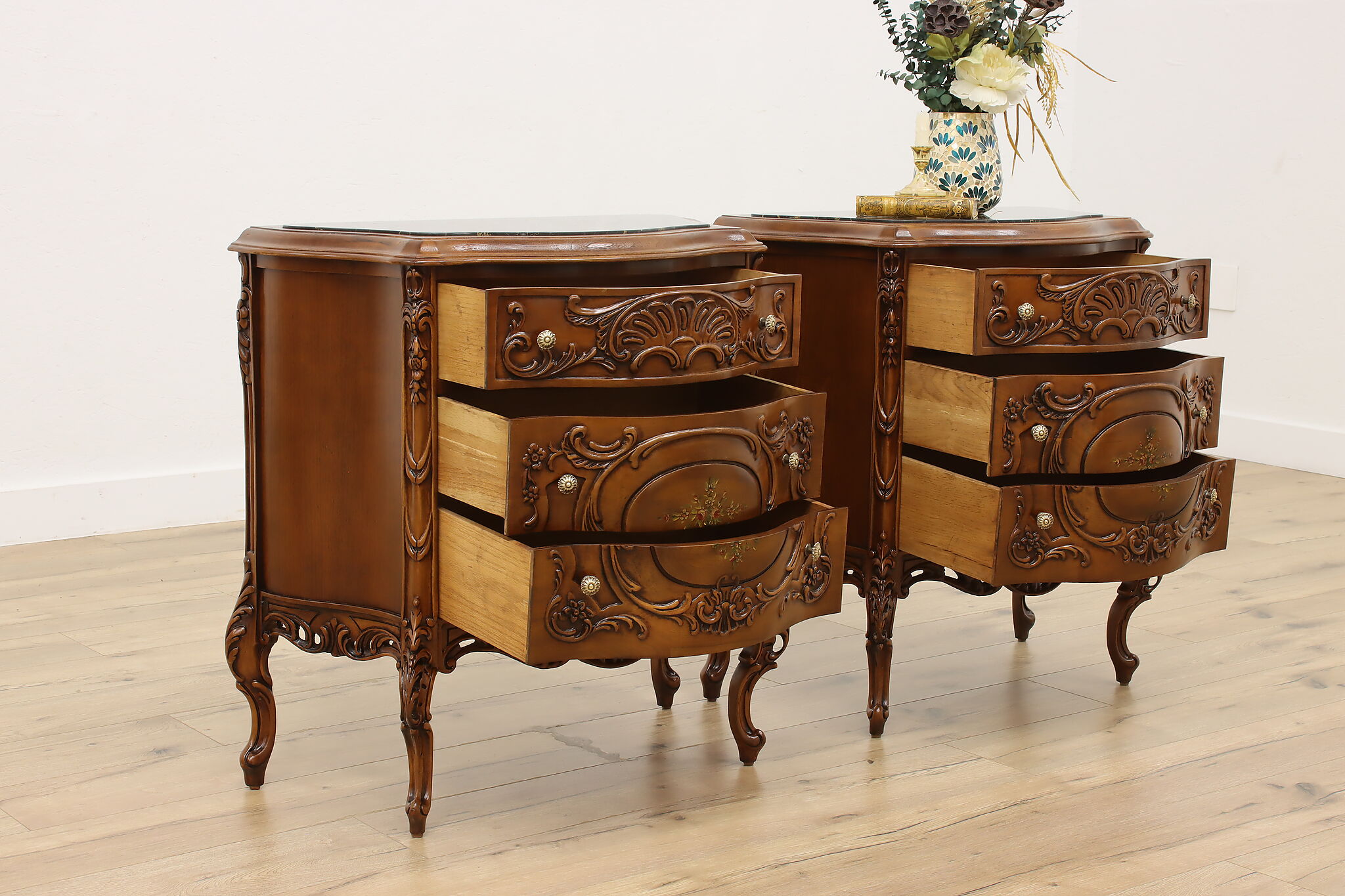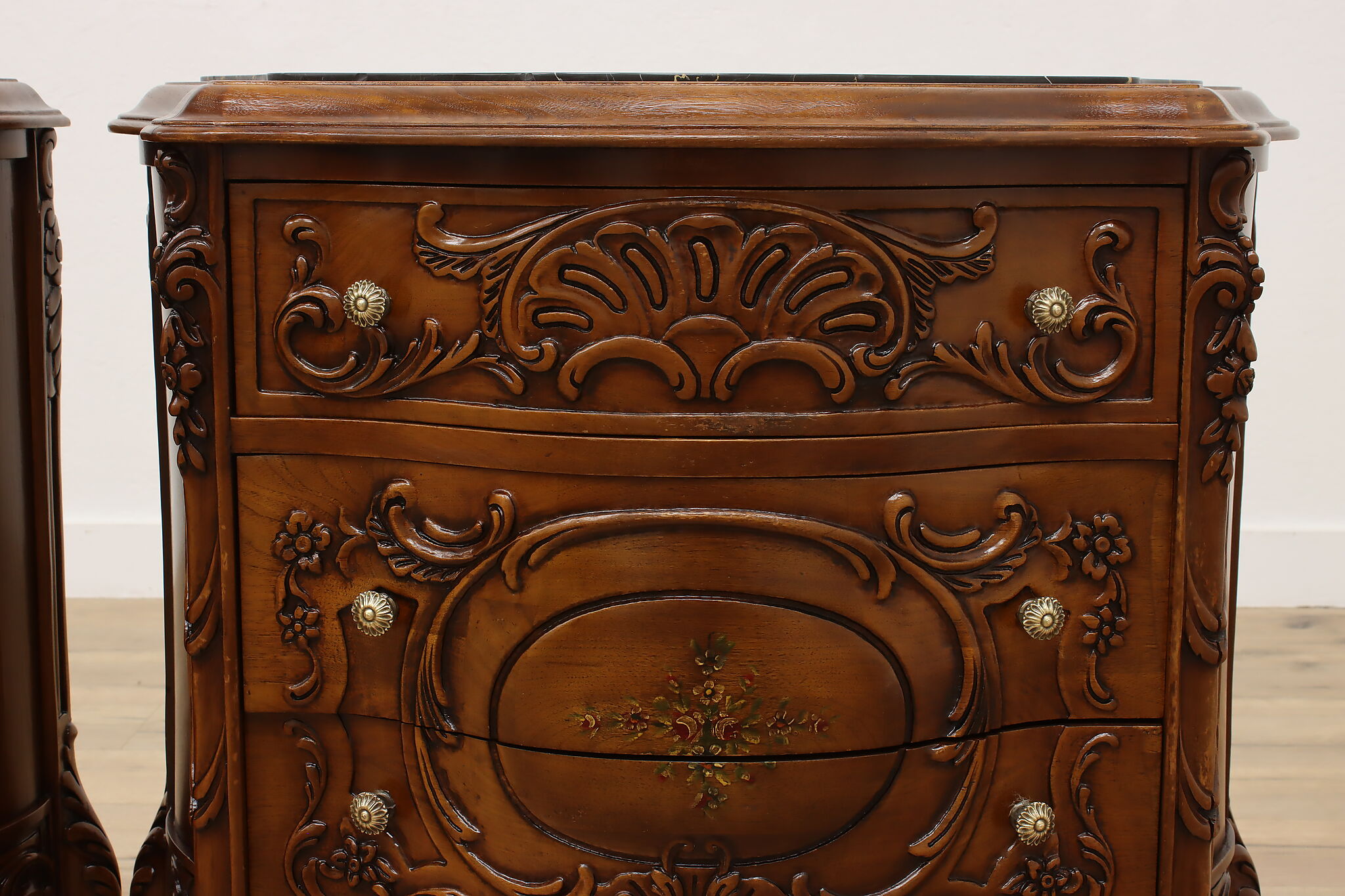 This darling pair of French design nightstands have beautifully carved detailing with hand-painted floral accents for an elegant addition to any room.