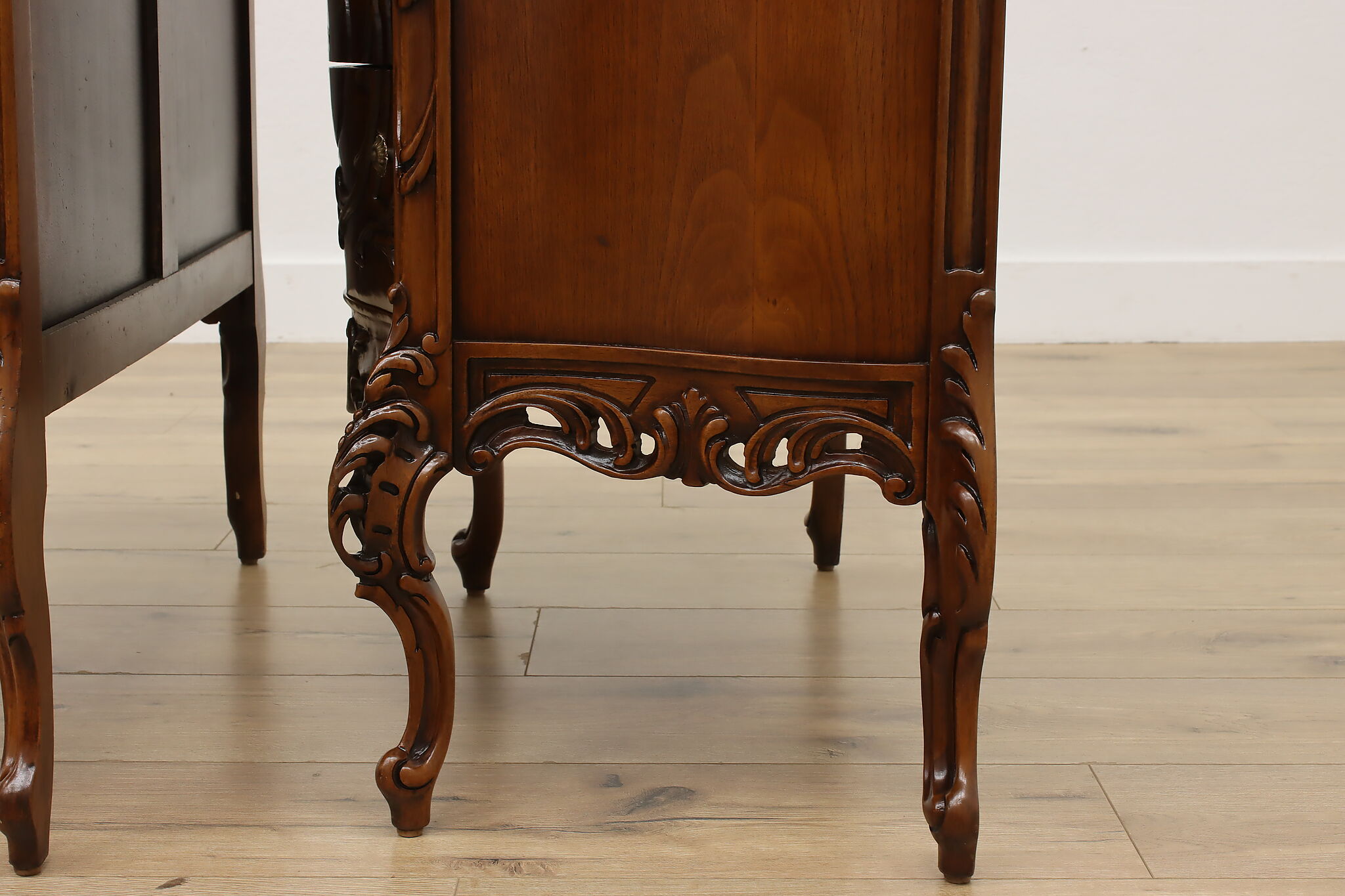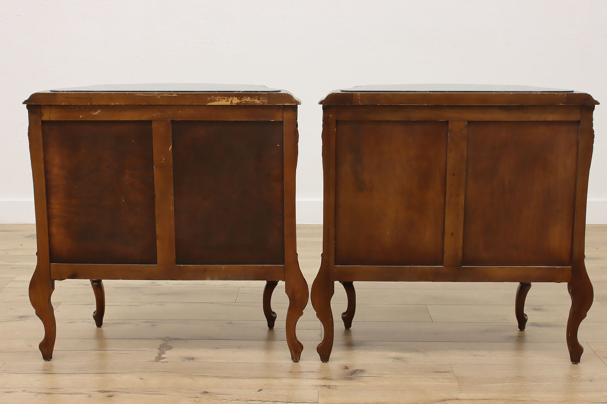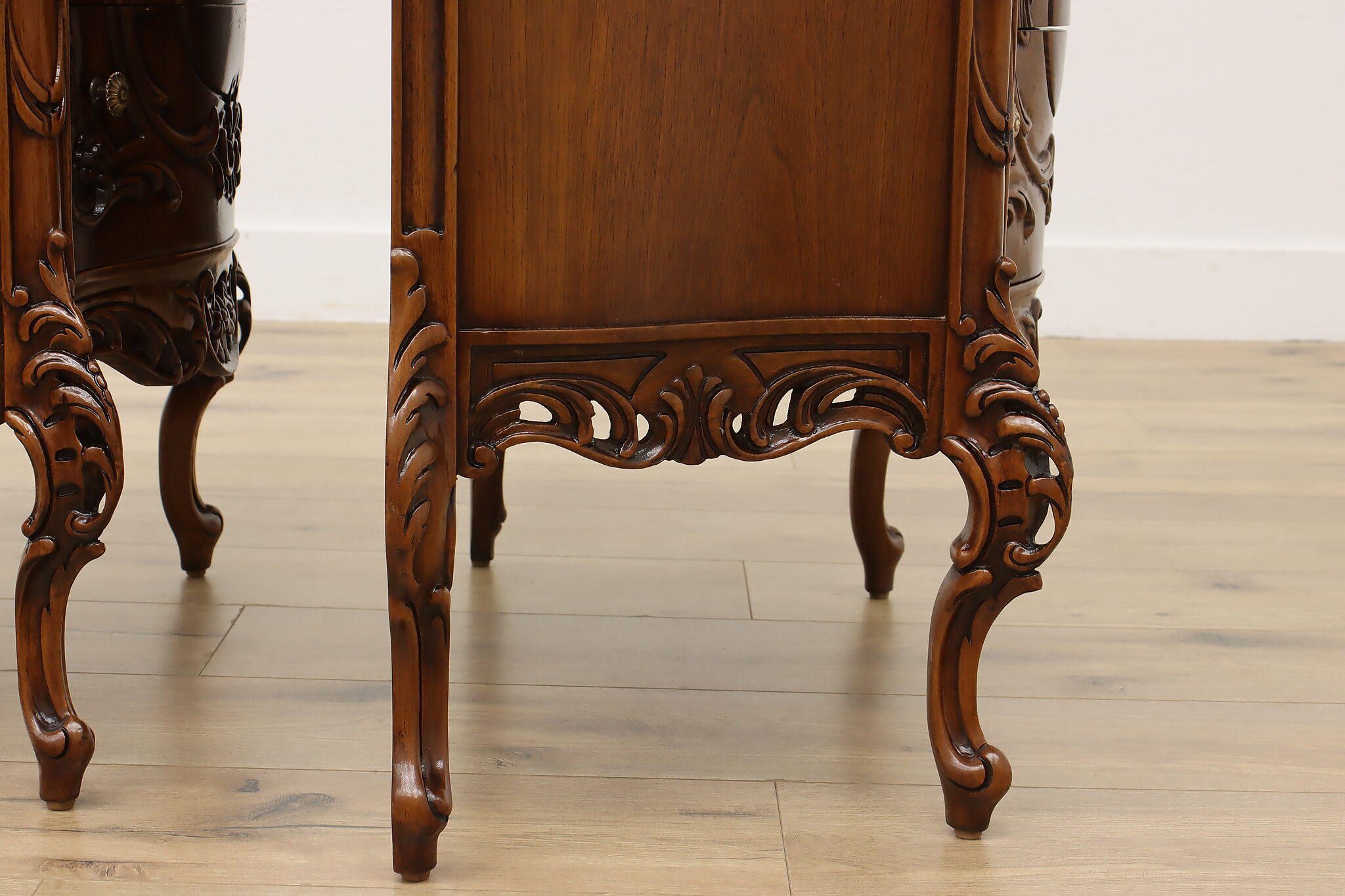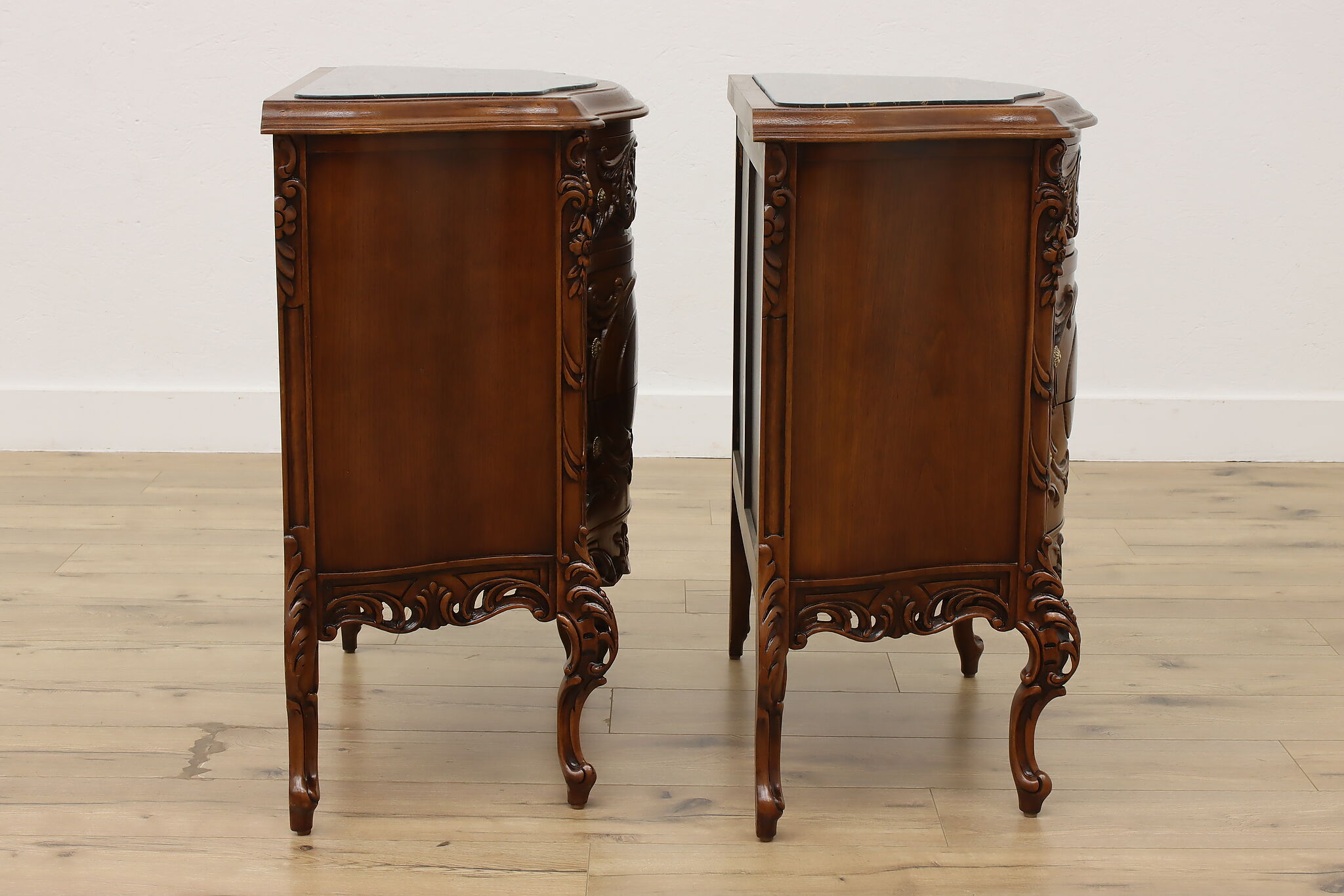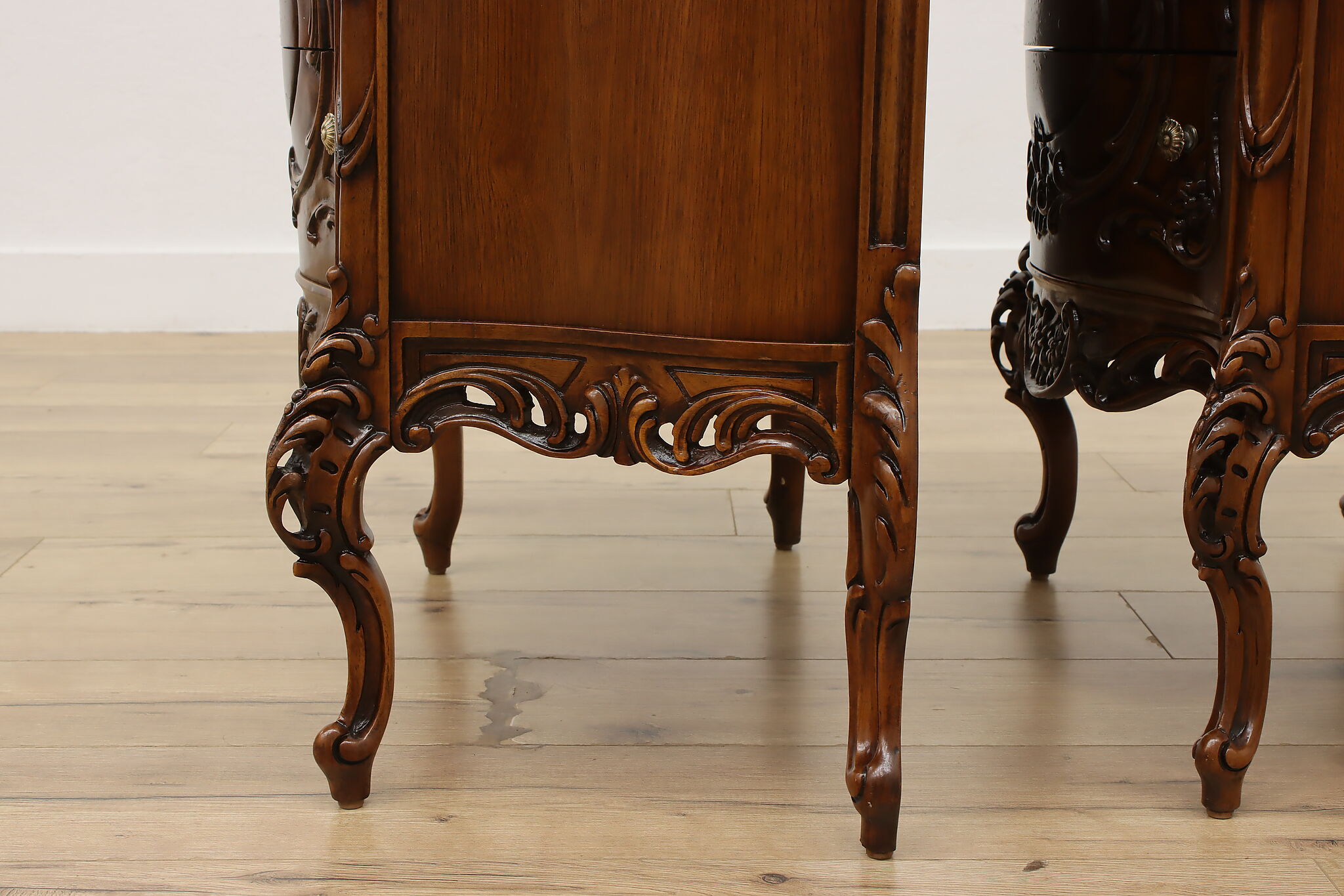 This darling pair of French design nightstands have beautifully carved detailing with hand-painted floral accents for an elegant addition to any room.