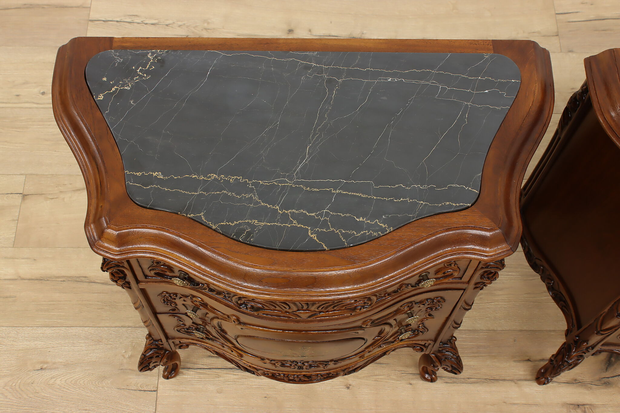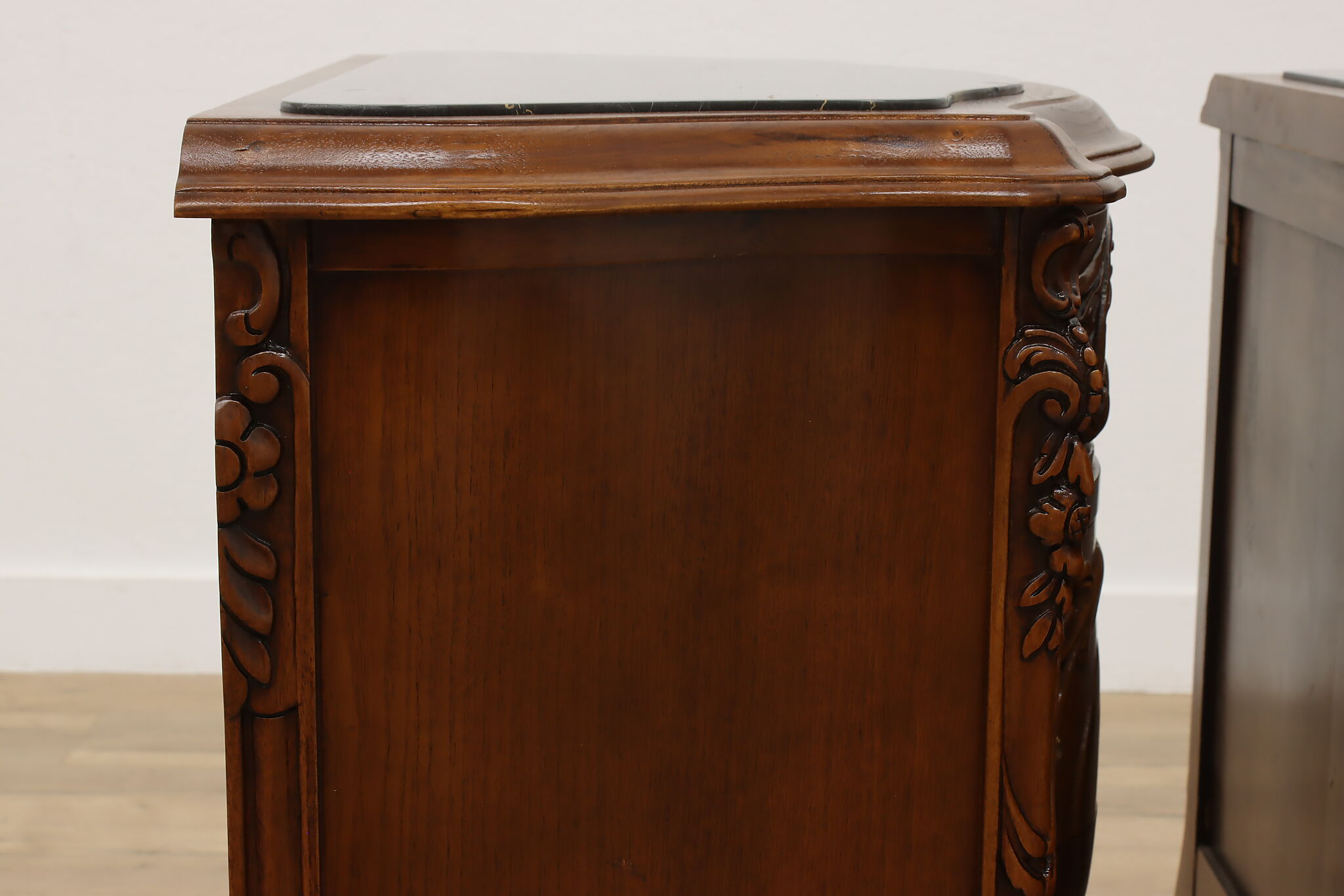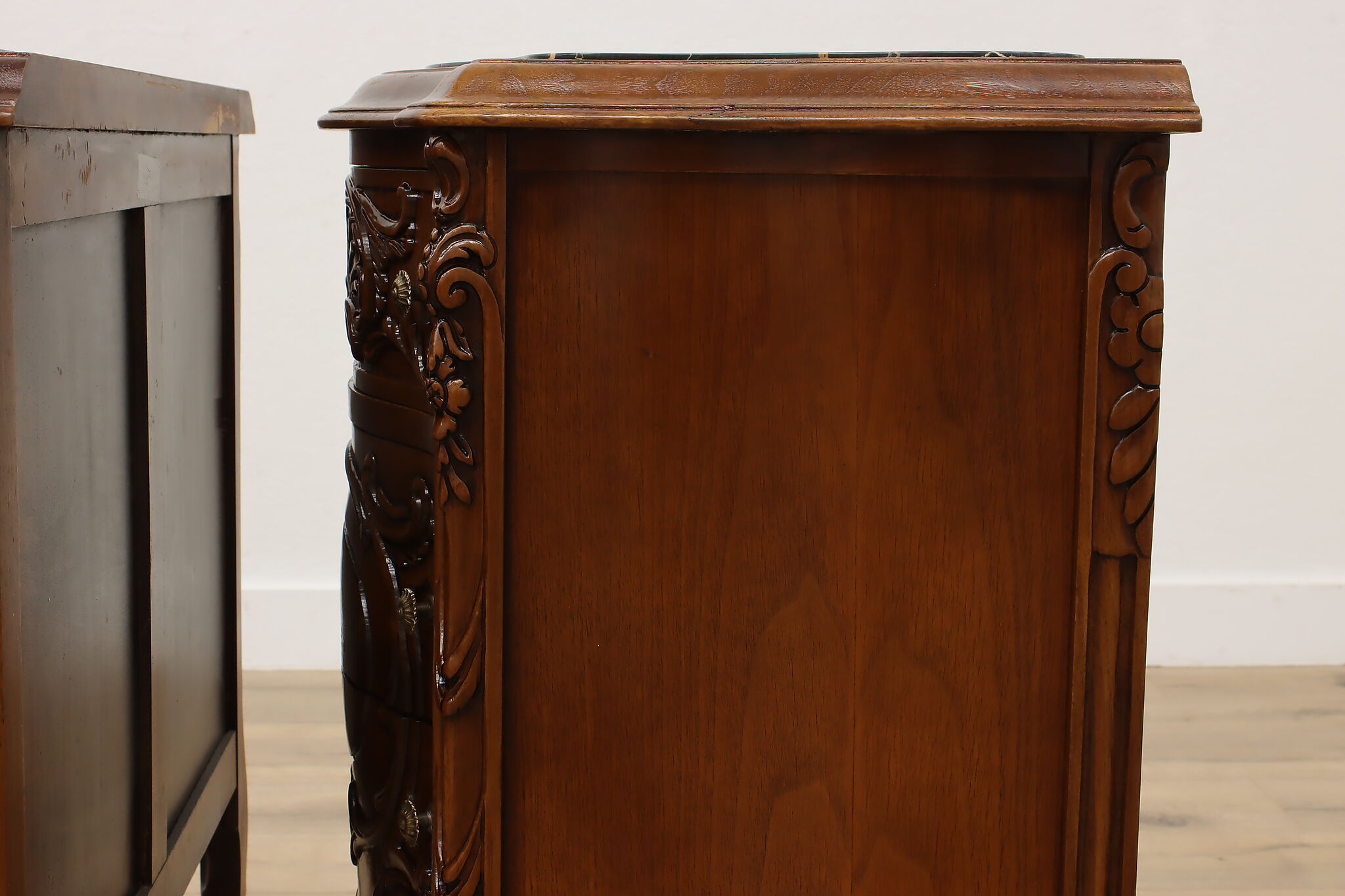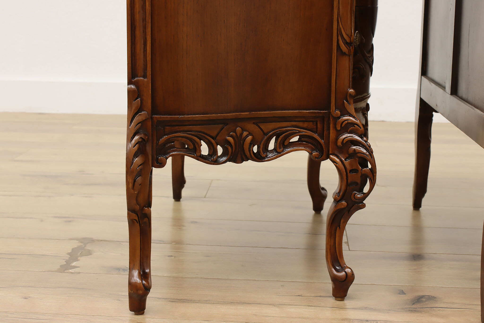 This darling pair of French design nightstands have beautifully carved detailing with hand-painted floral accents for an elegant addition to any room.