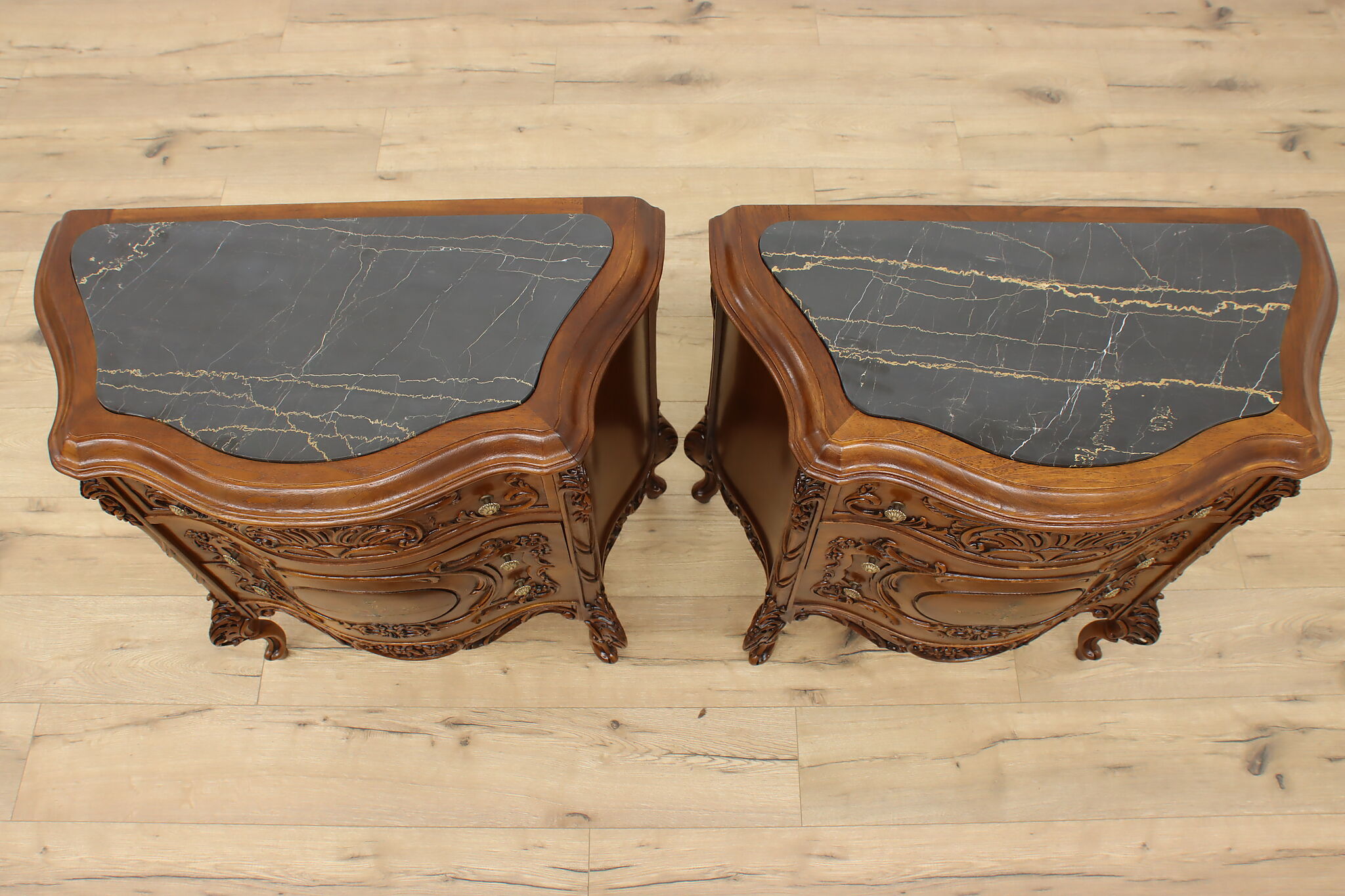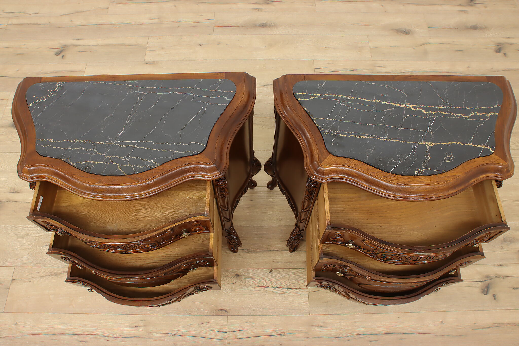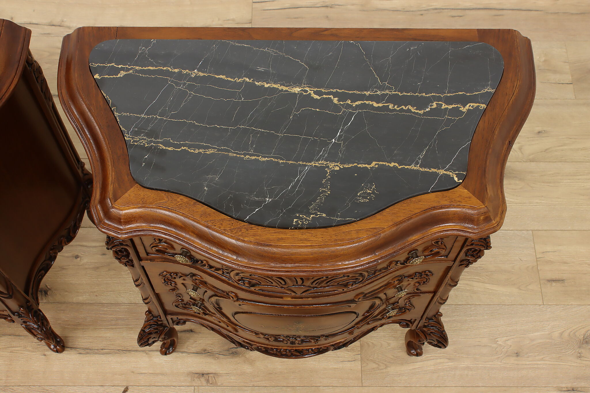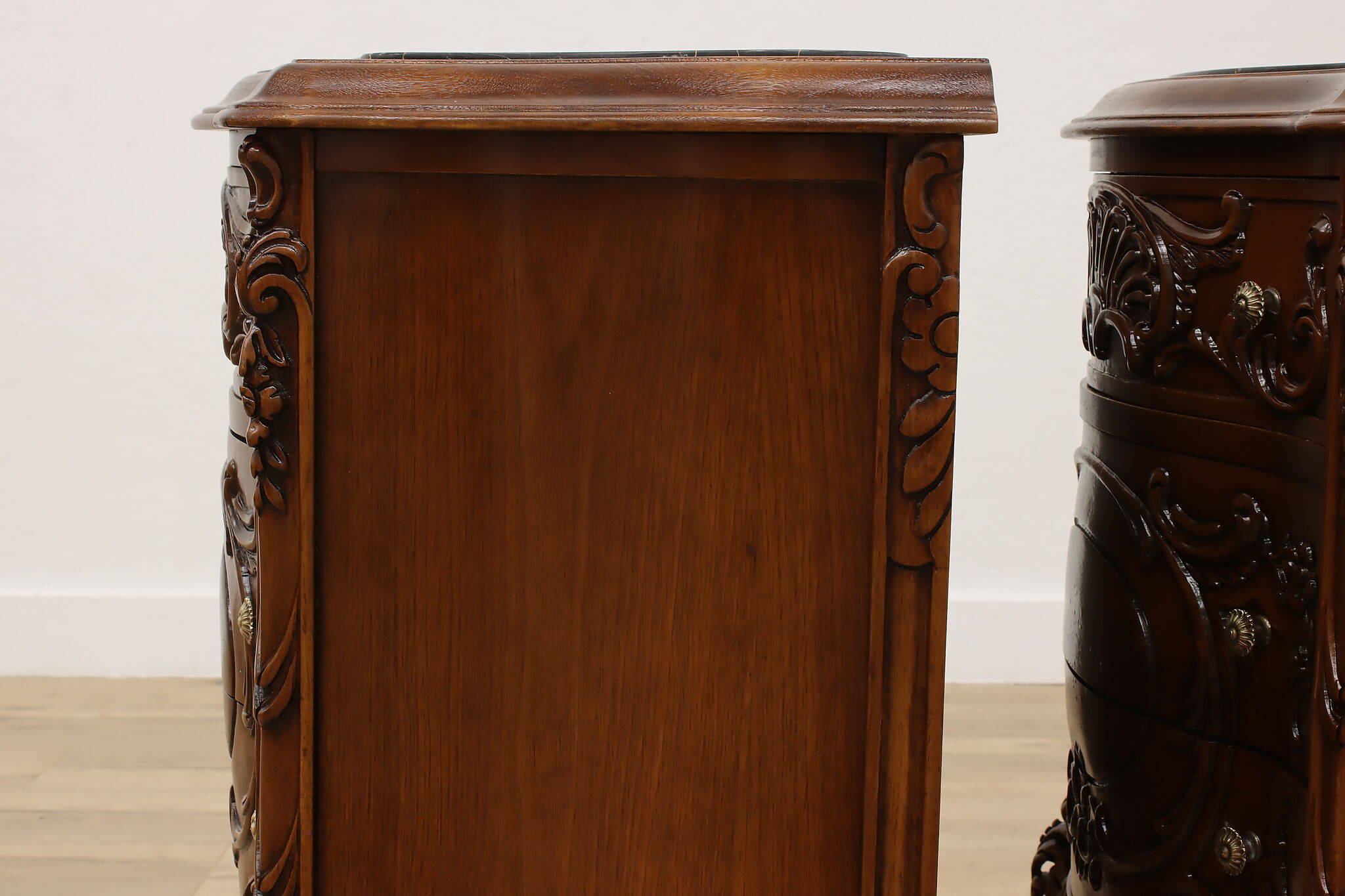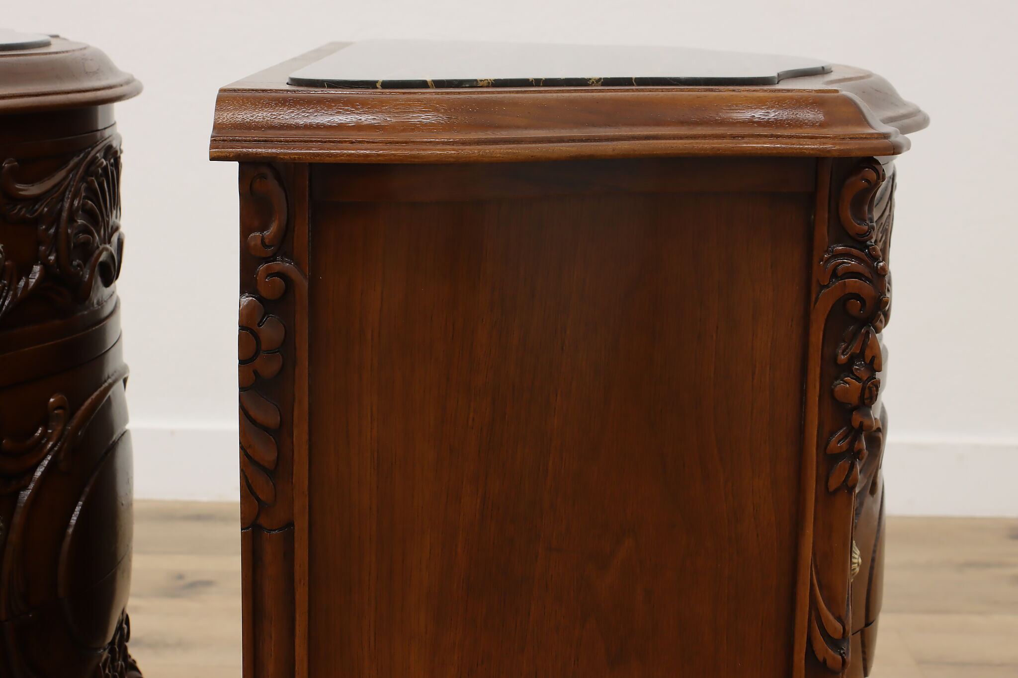 This darling pair of French design nightstands have beautifully carved detailing with hand-painted floral accents for an elegant addition to any room.