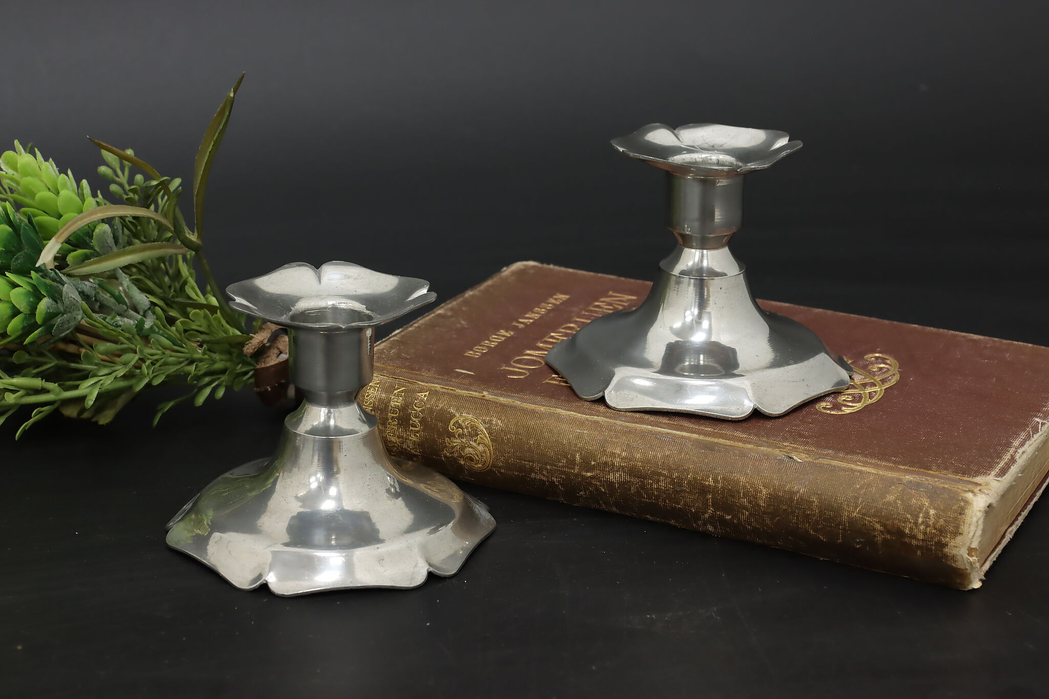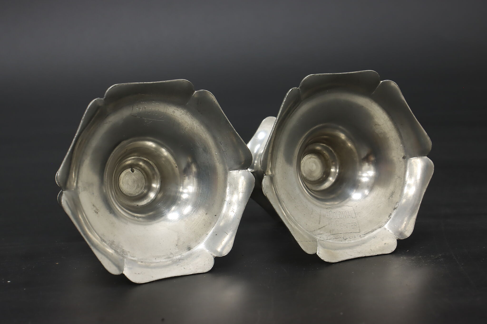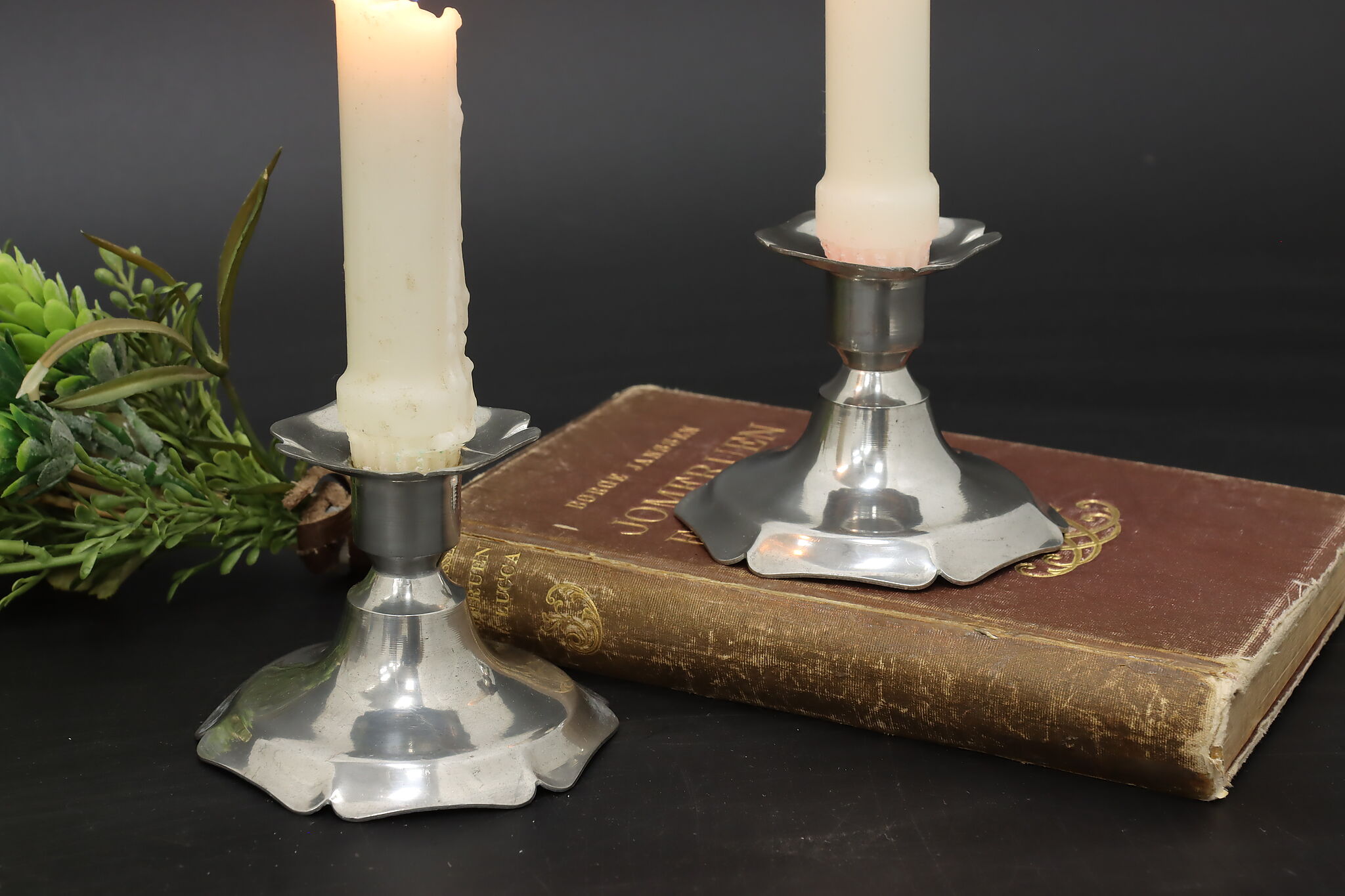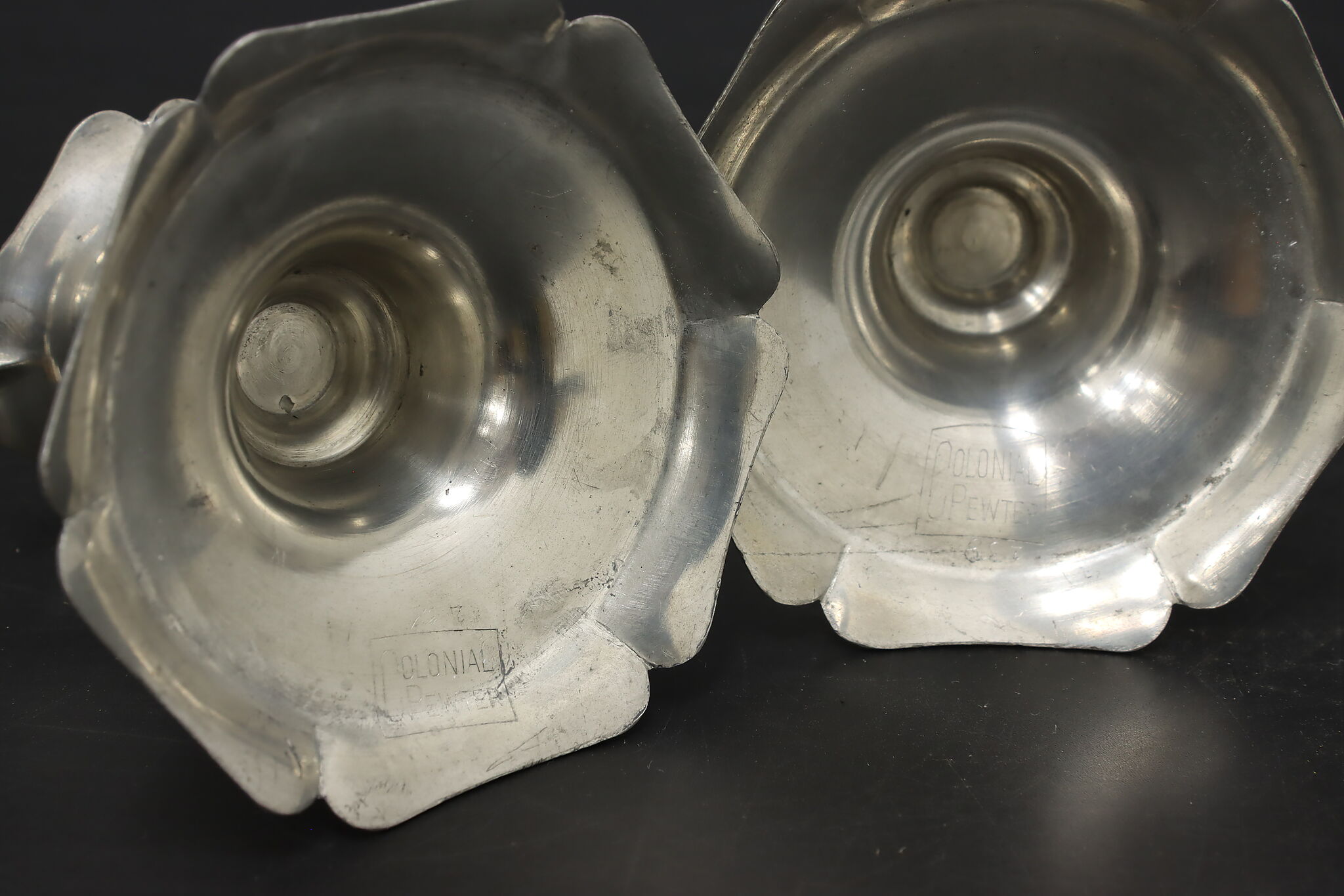 A charming pair of mantel or tabletop candlesticks are signed "Colonial Pewter."