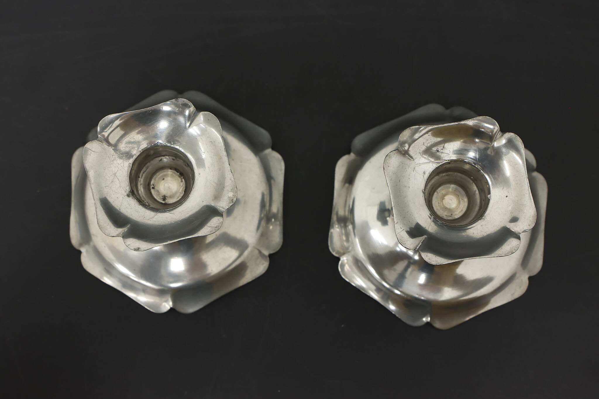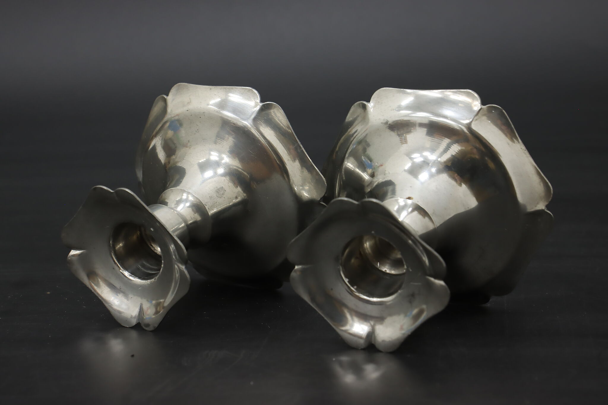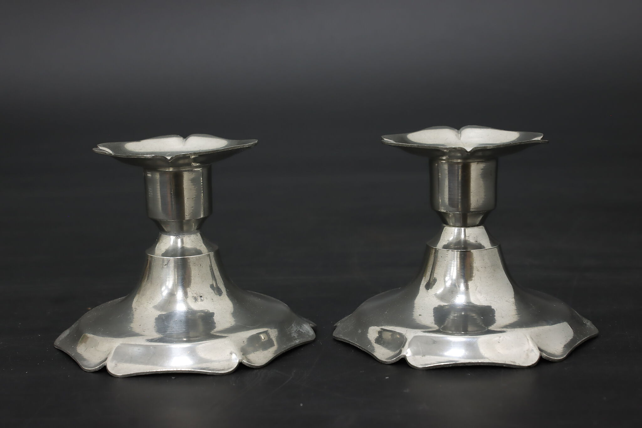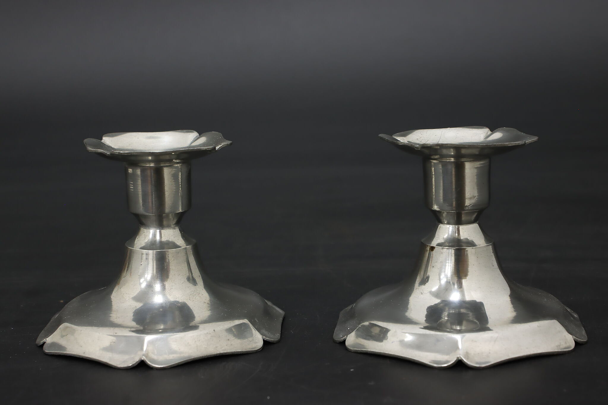A charming pair of mantel or tabletop candlesticks are signed "Colonial Pewter."