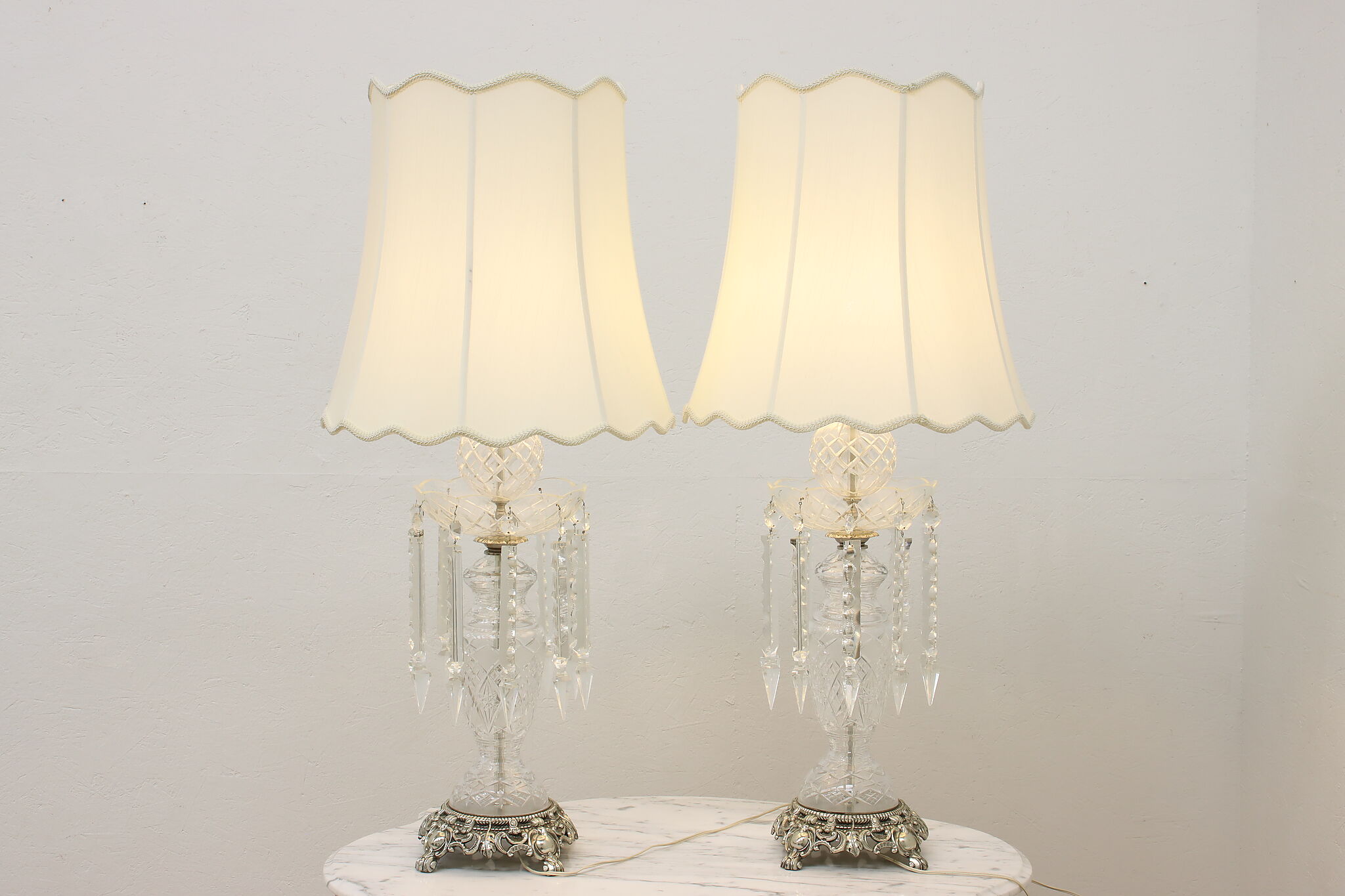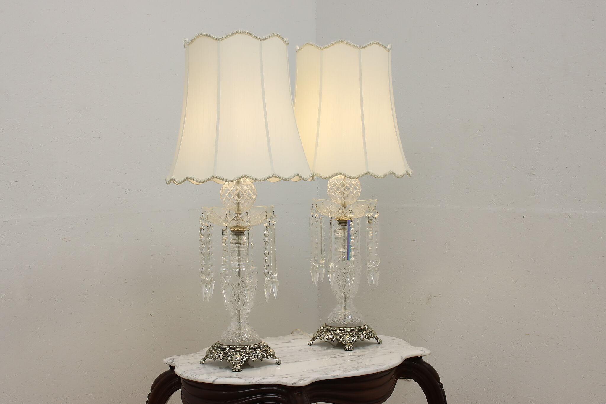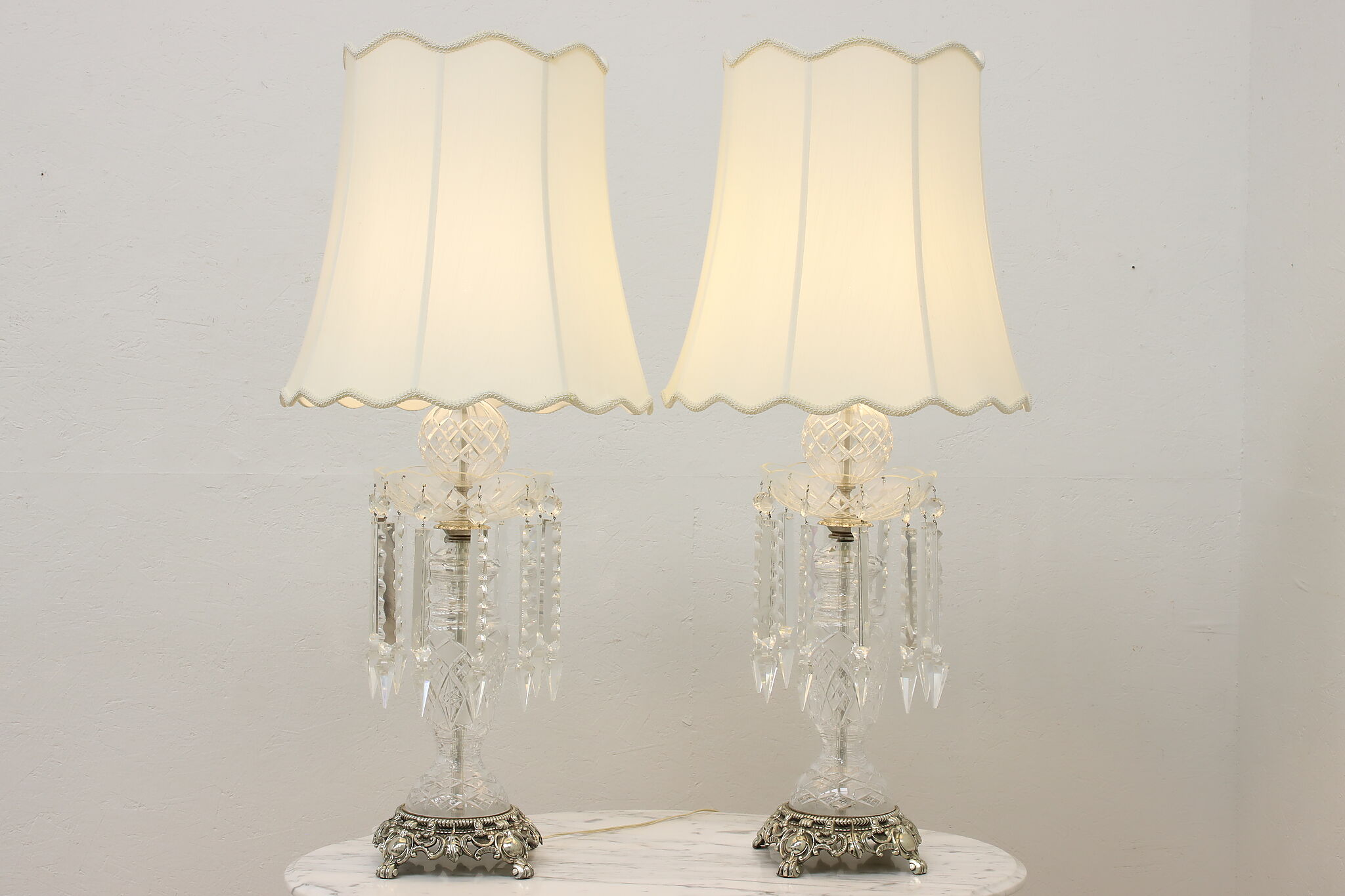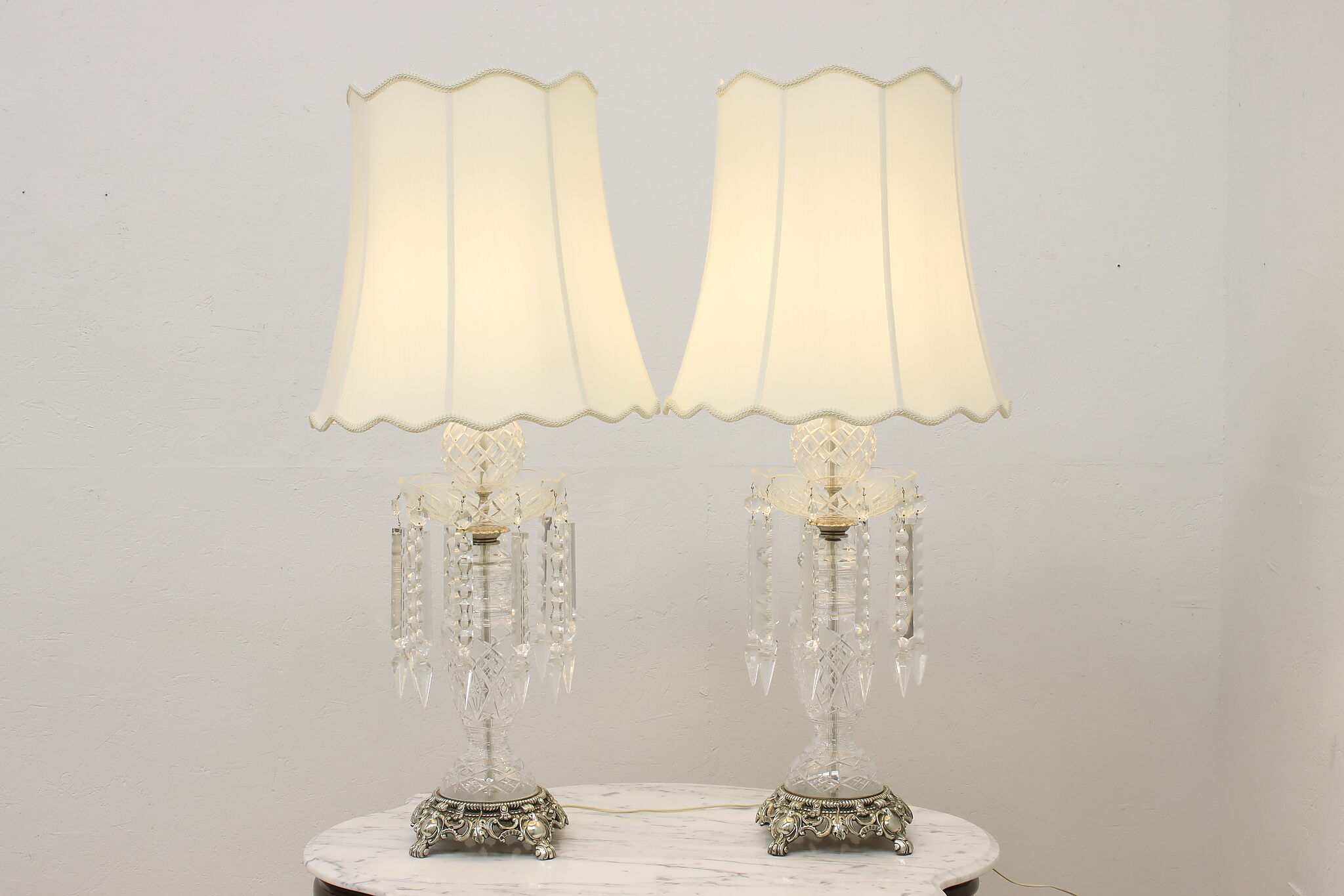 This gorgeous pair of lamps have large hanging blown and cut crystal prisms that sparkle beautifully when lit.