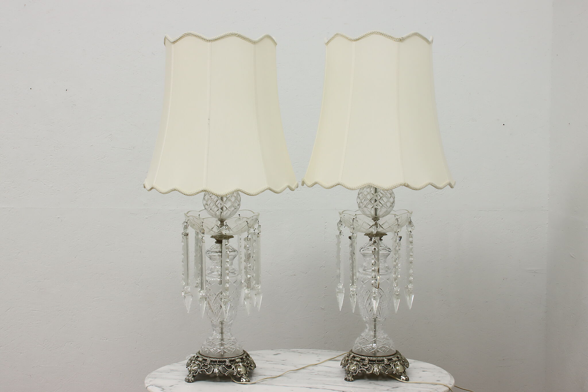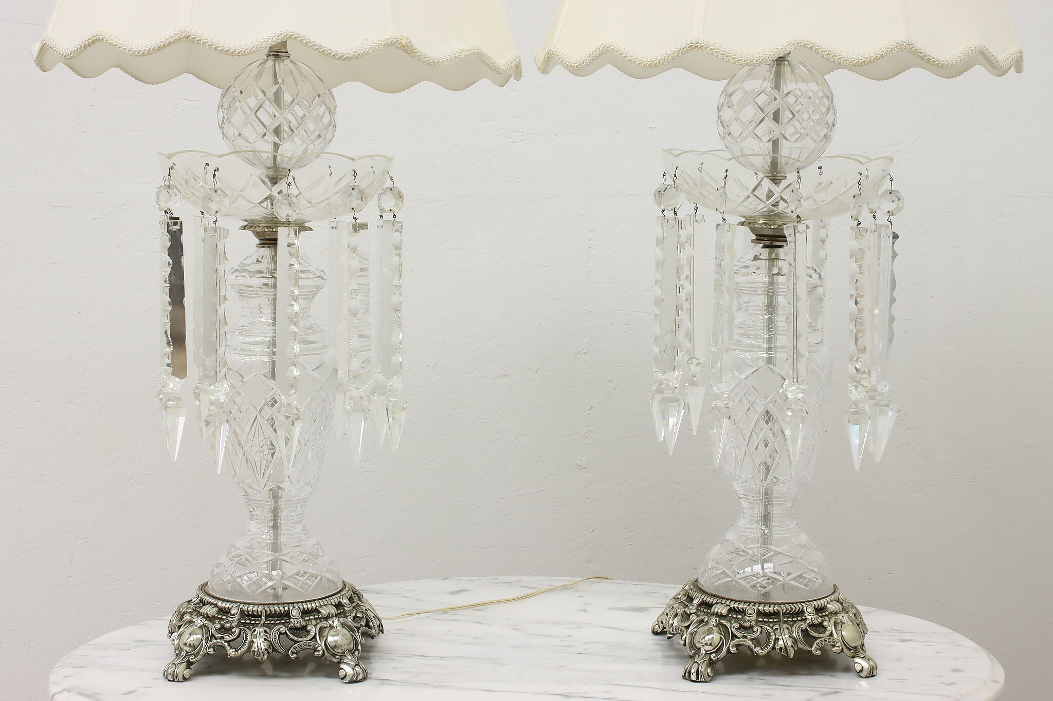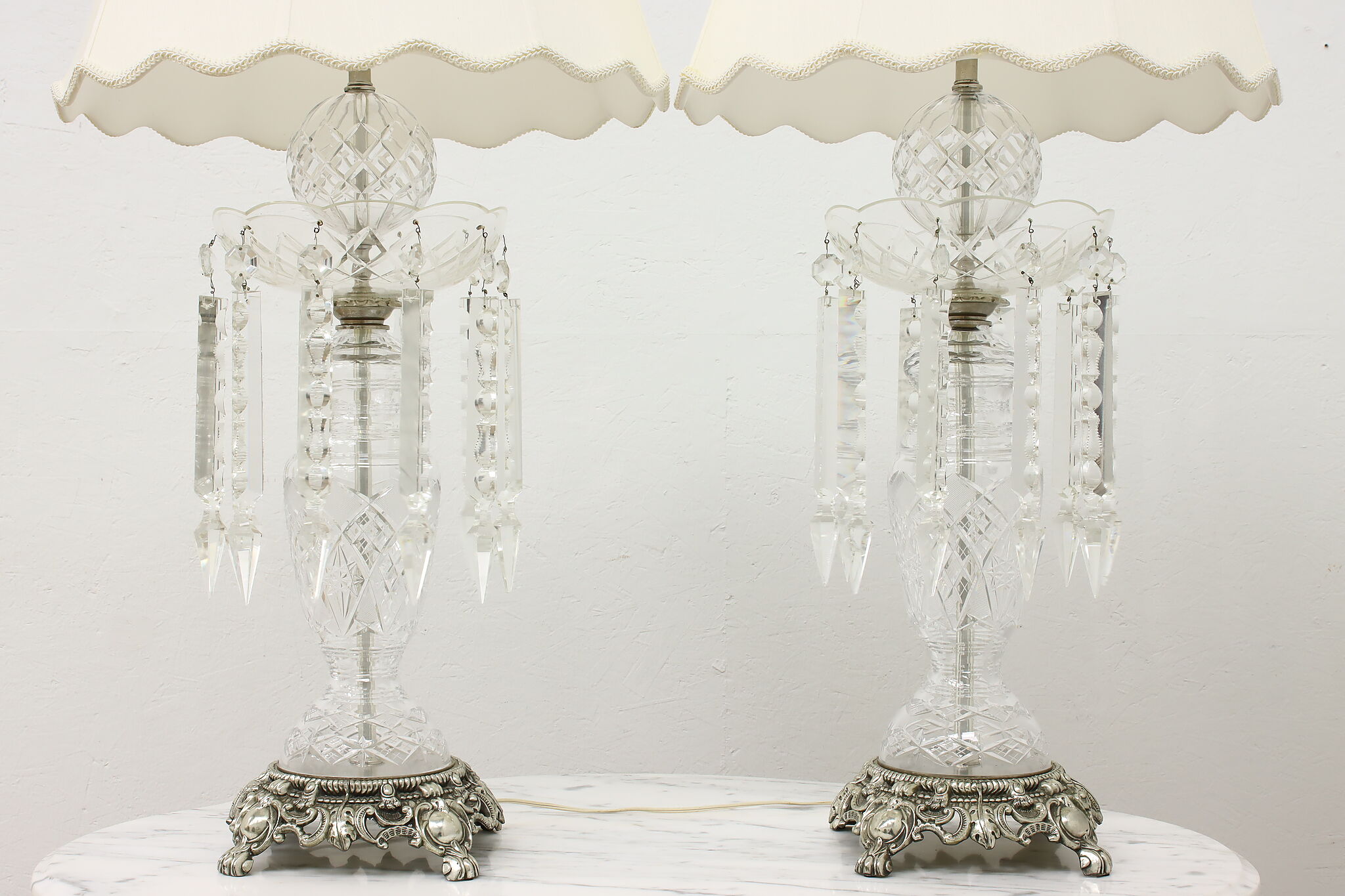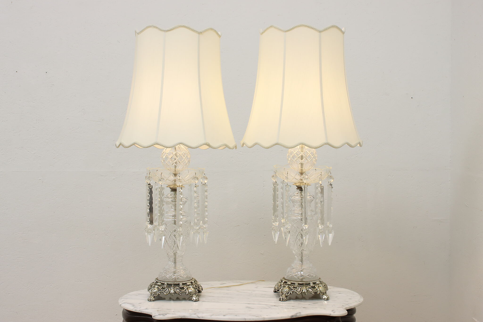 This gorgeous pair of lamps have large hanging blown and cut crystal prisms that sparkle beautifully when lit.
