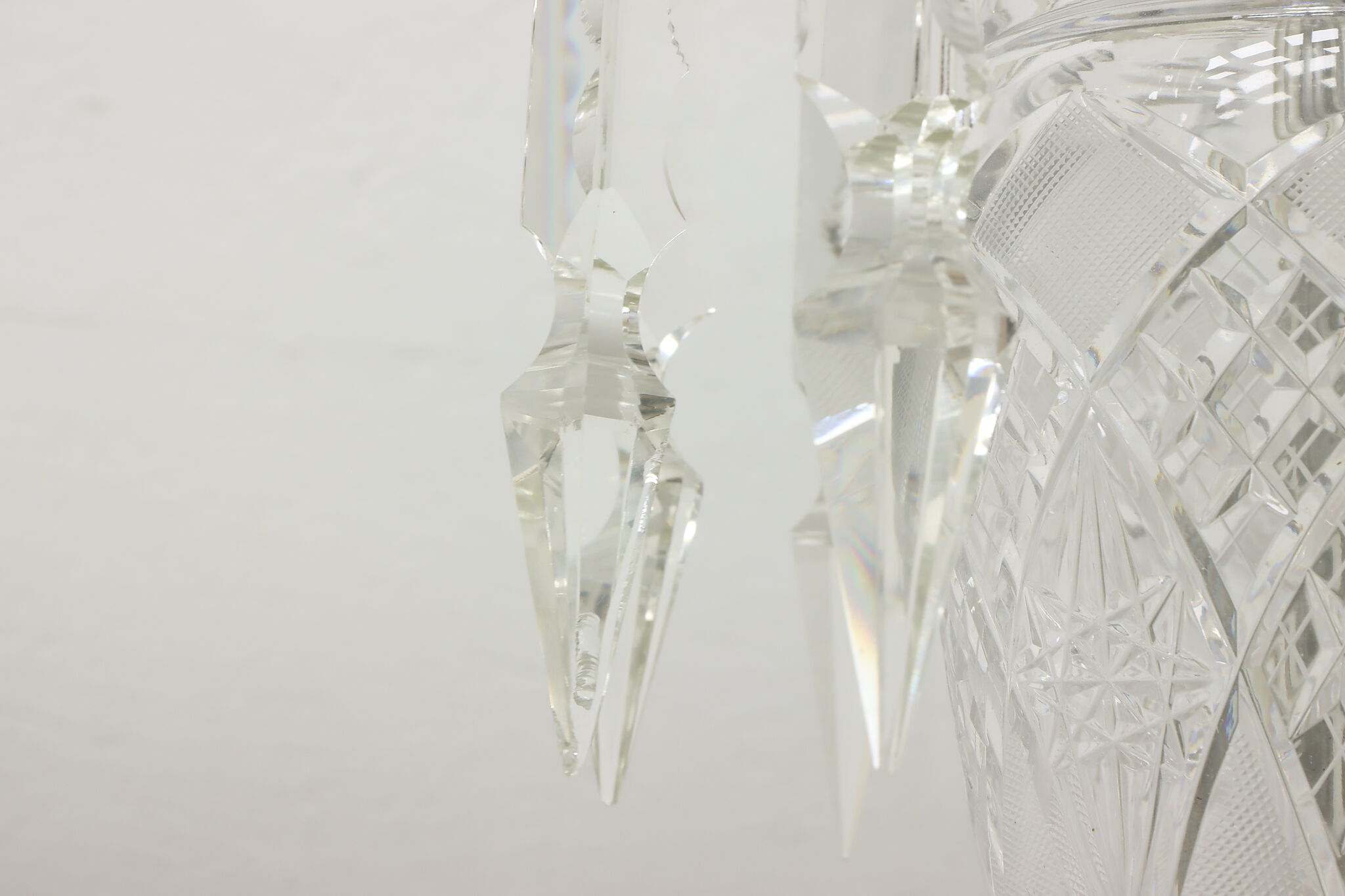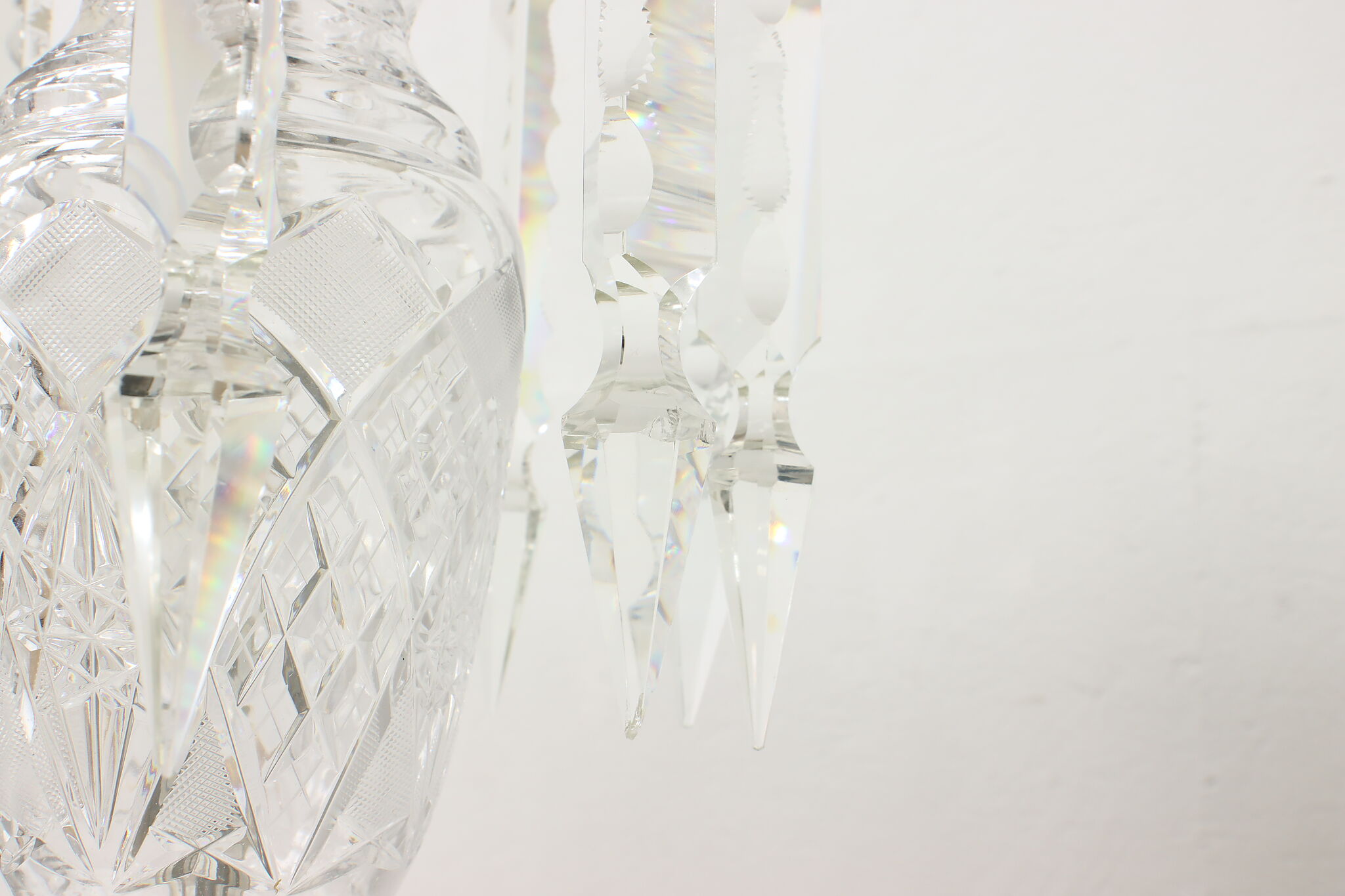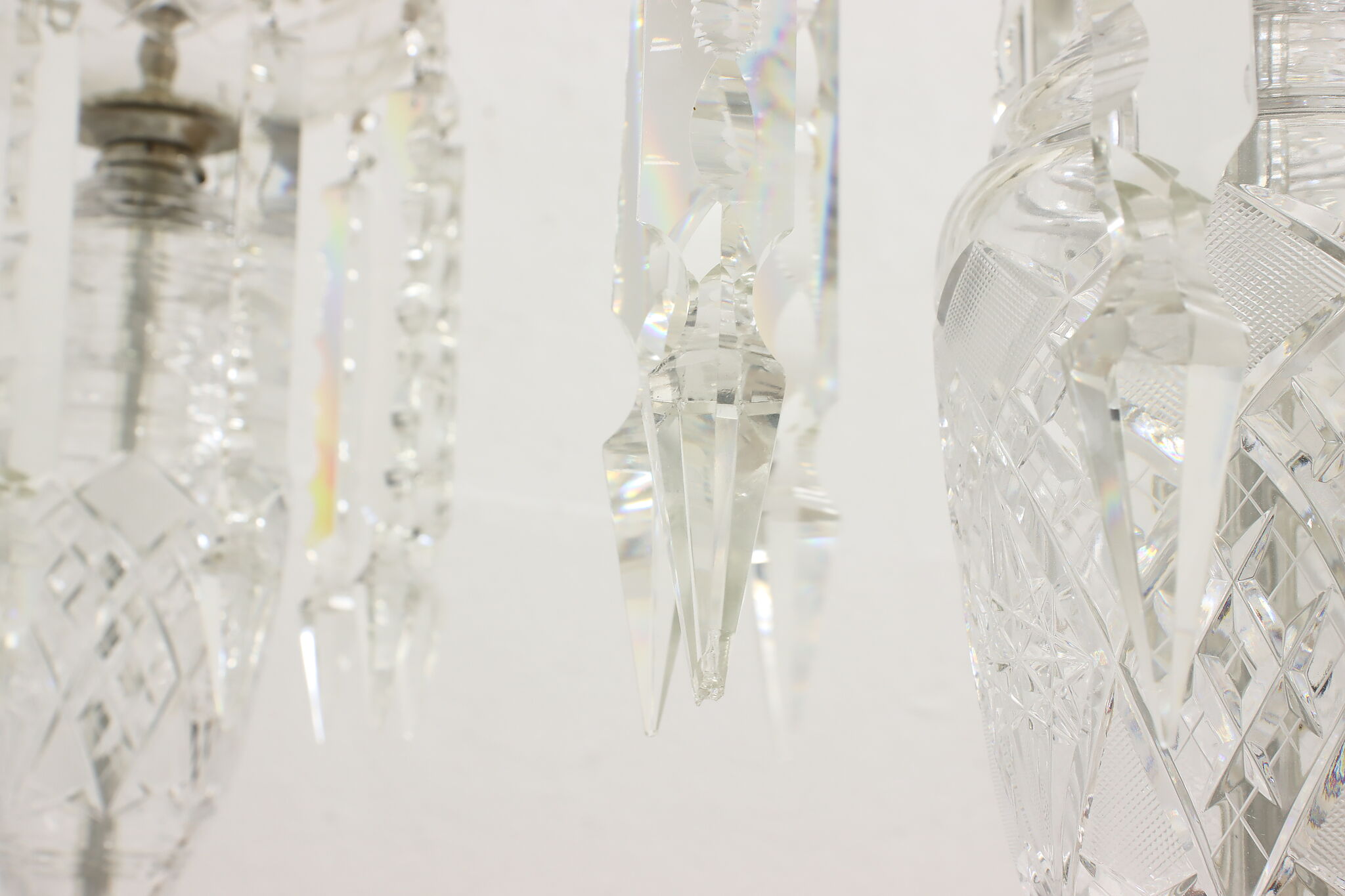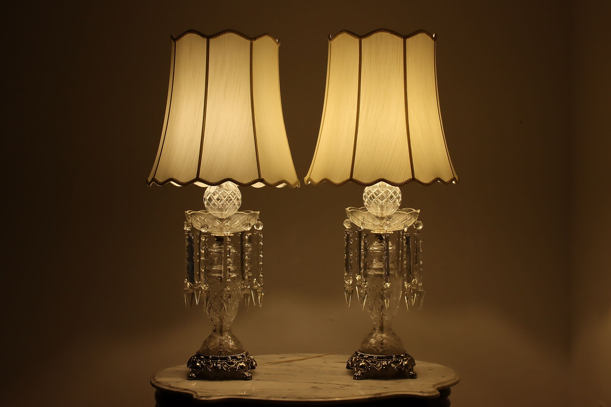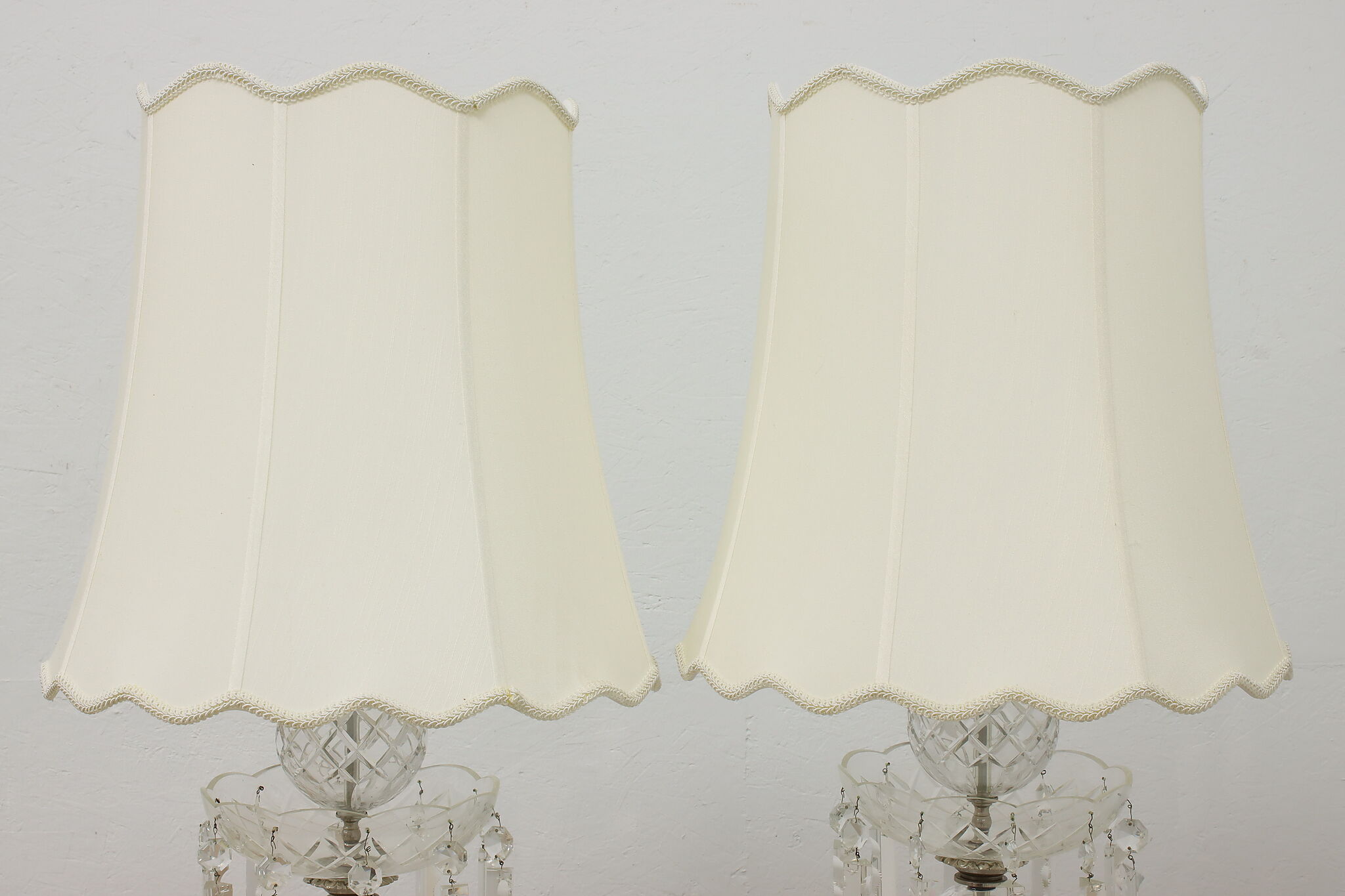 This gorgeous pair of lamps have large hanging blown and cut crystal prisms that sparkle beautifully when lit.