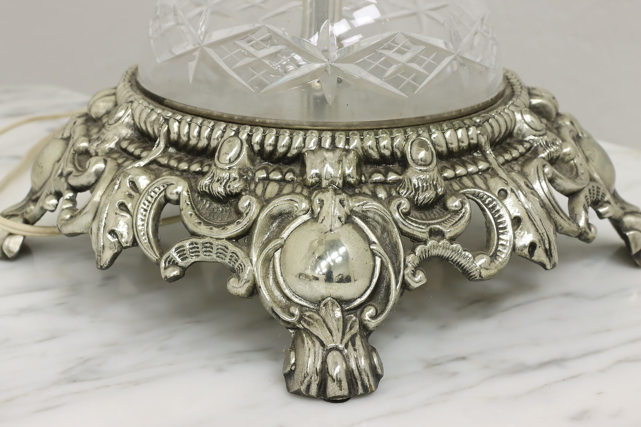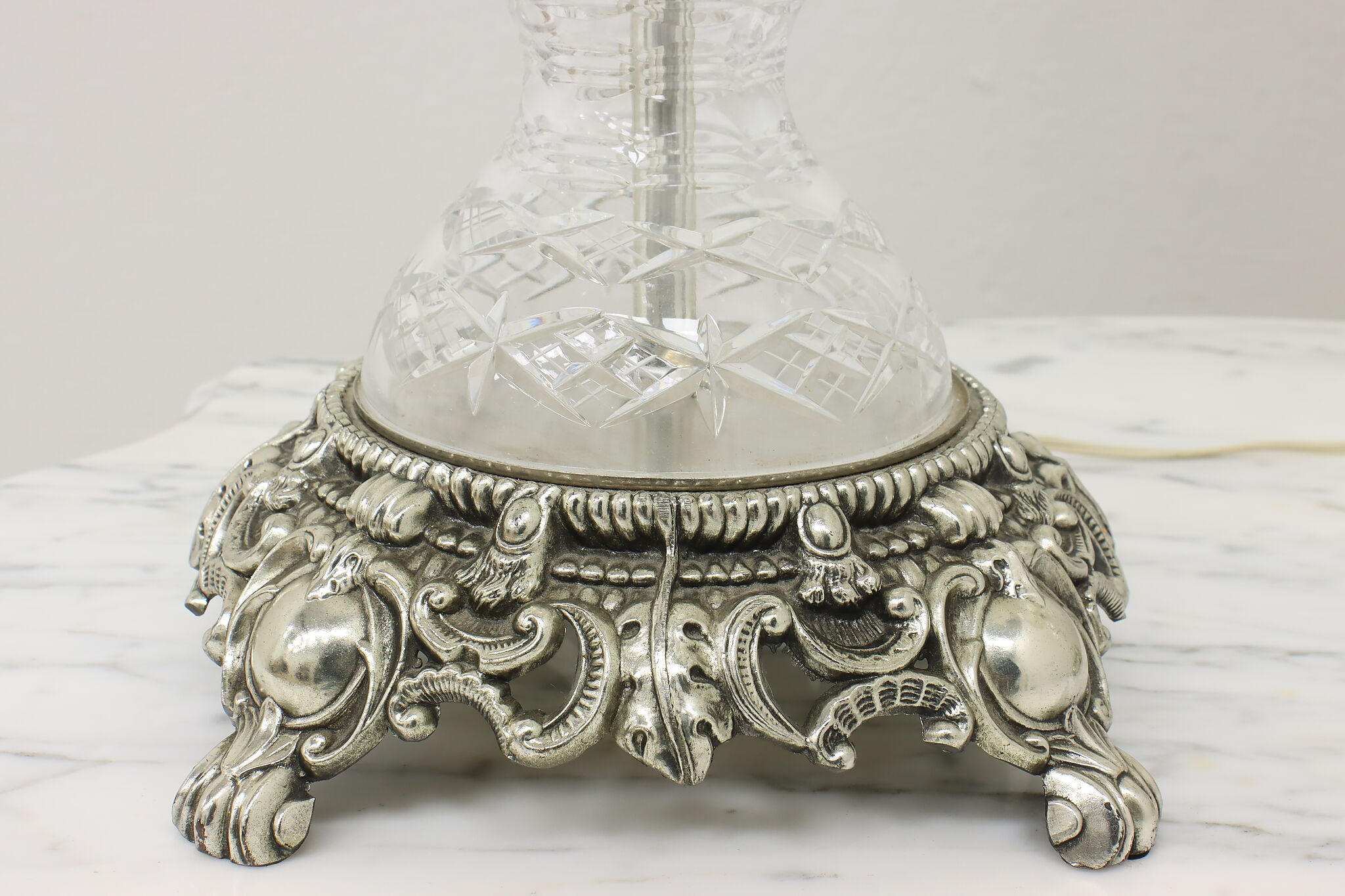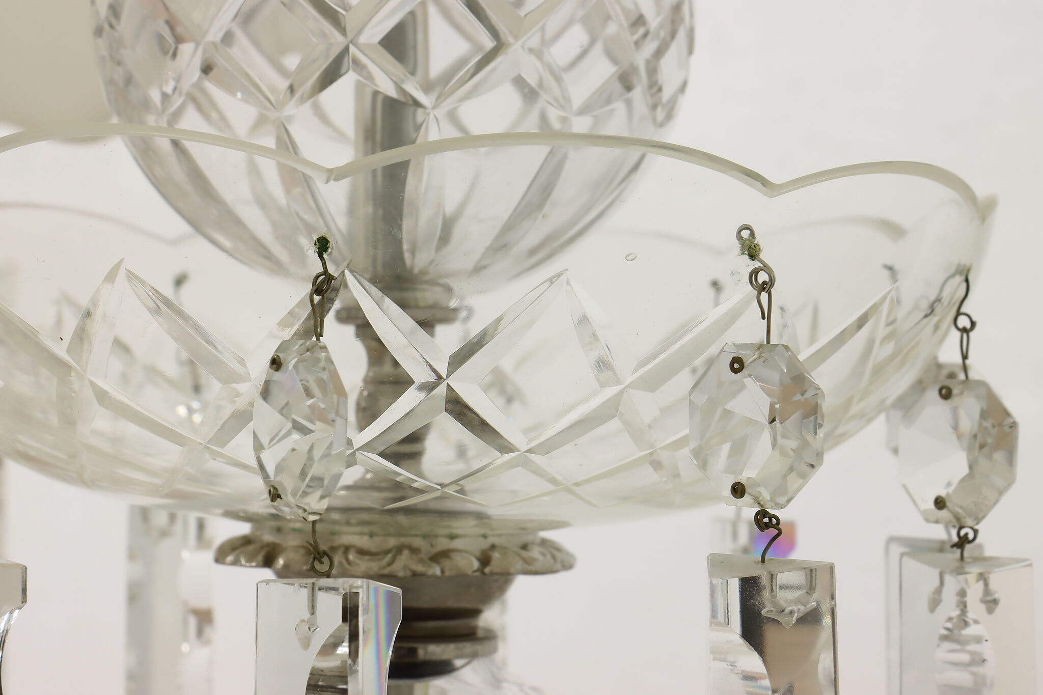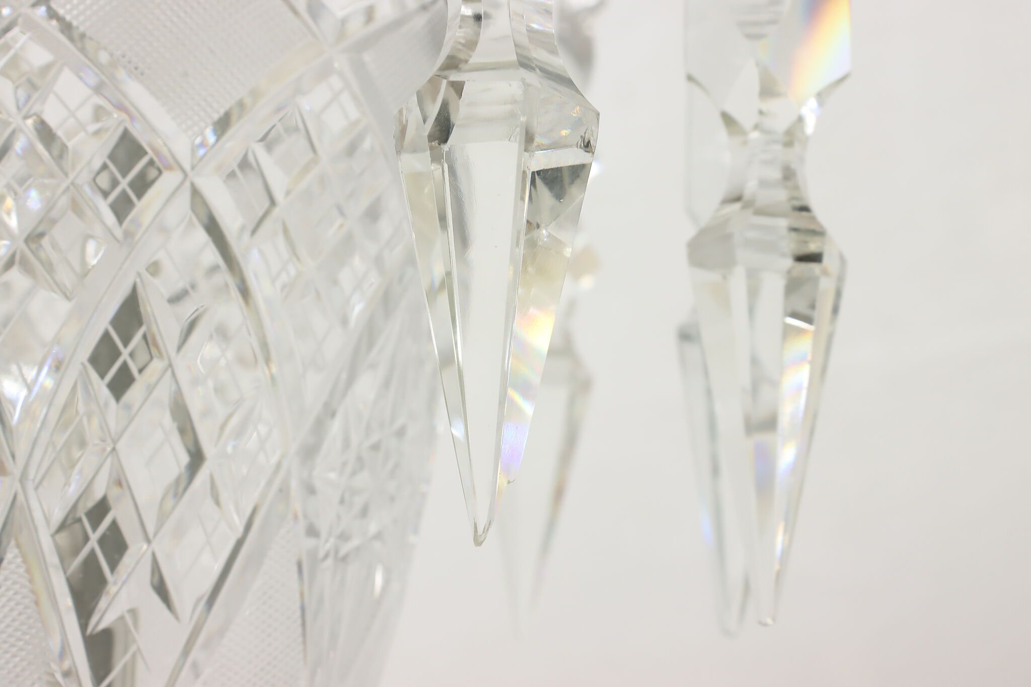 This gorgeous pair of lamps have large hanging blown and cut crystal prisms that sparkle beautifully when lit.