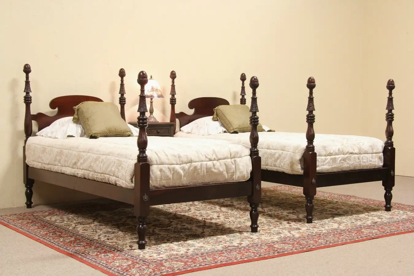 A pair of exquisitely carved mahogany "acorn" poster beds from the 1920's is signed "Pollack Bros. Colonial Reproductions, Boston, Mass."
