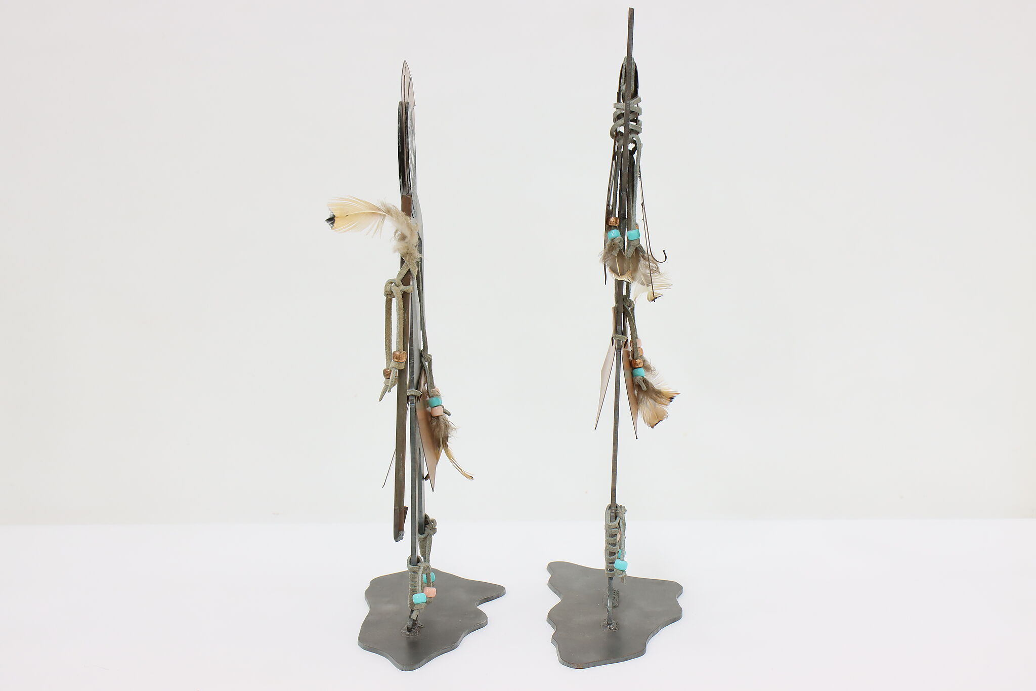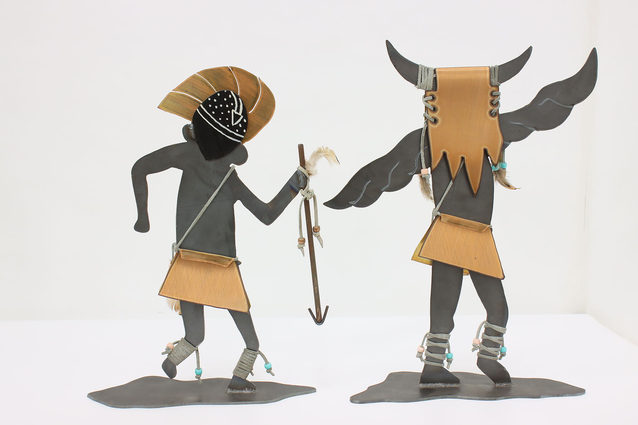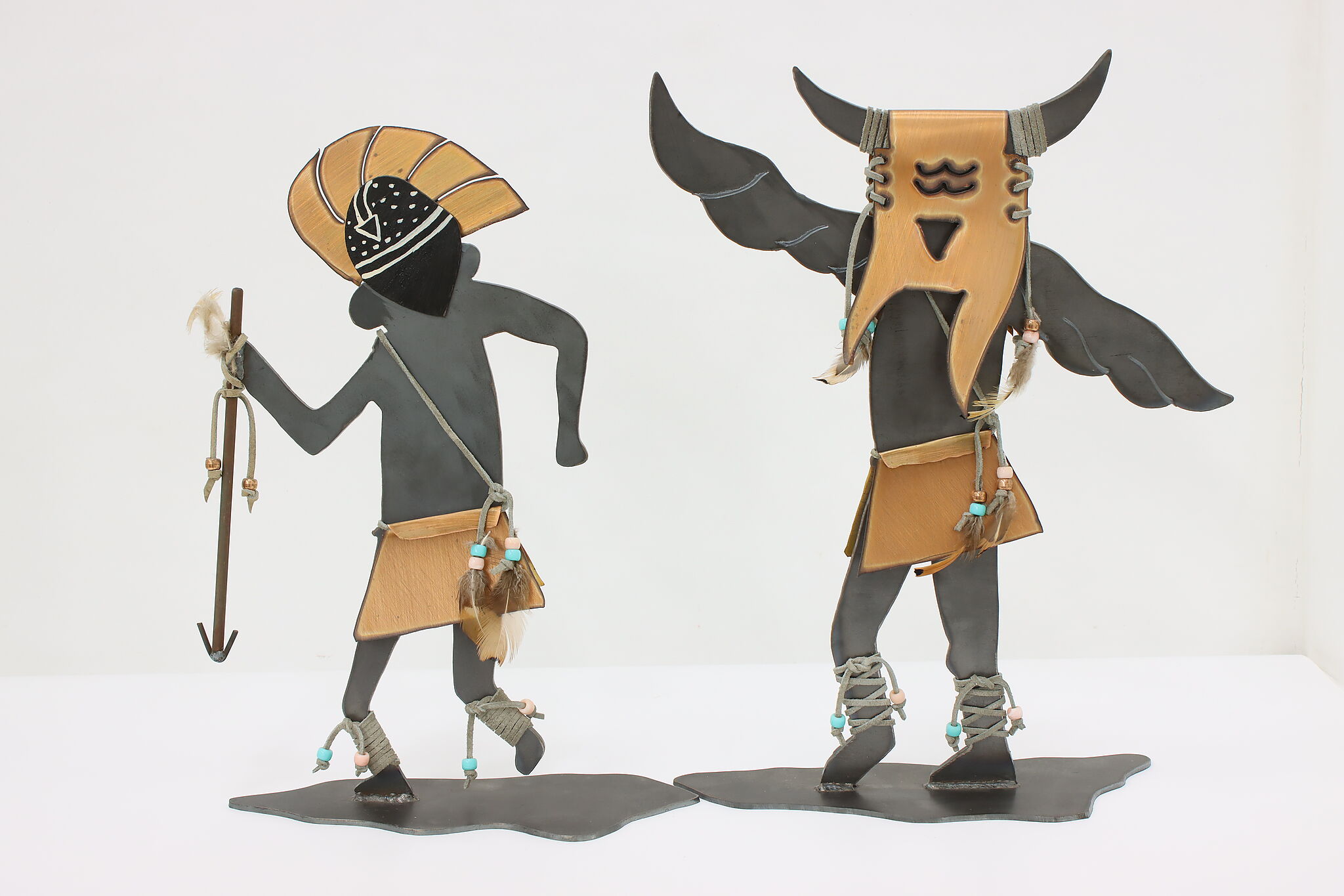 This pair of Native American sculptures are traditional Kachina figures from southwestern Pueblo tribes. Kachinas are important spirit guides to the Pueblos, offering protection and guidance.