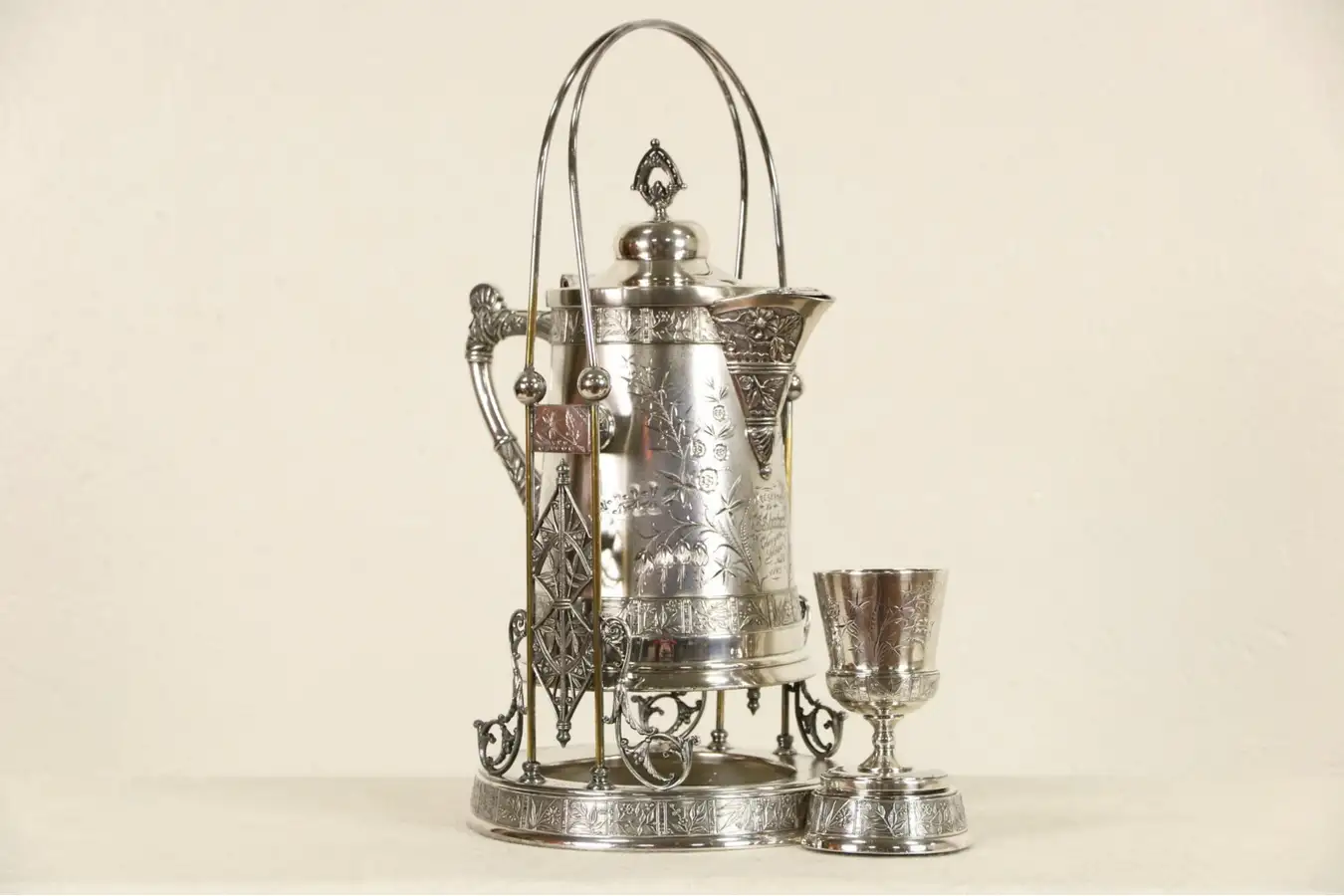 In exceptionally fine condition, this elegant serving piece is lavishly embossed. The stand has a holder for the original matching and signed goblet. American made antique Victorian serving ware, the pitcher is double walled for insulation. There is minor wear and a few dings for character, the lower parts of the handles are worn down to brass, see photos.