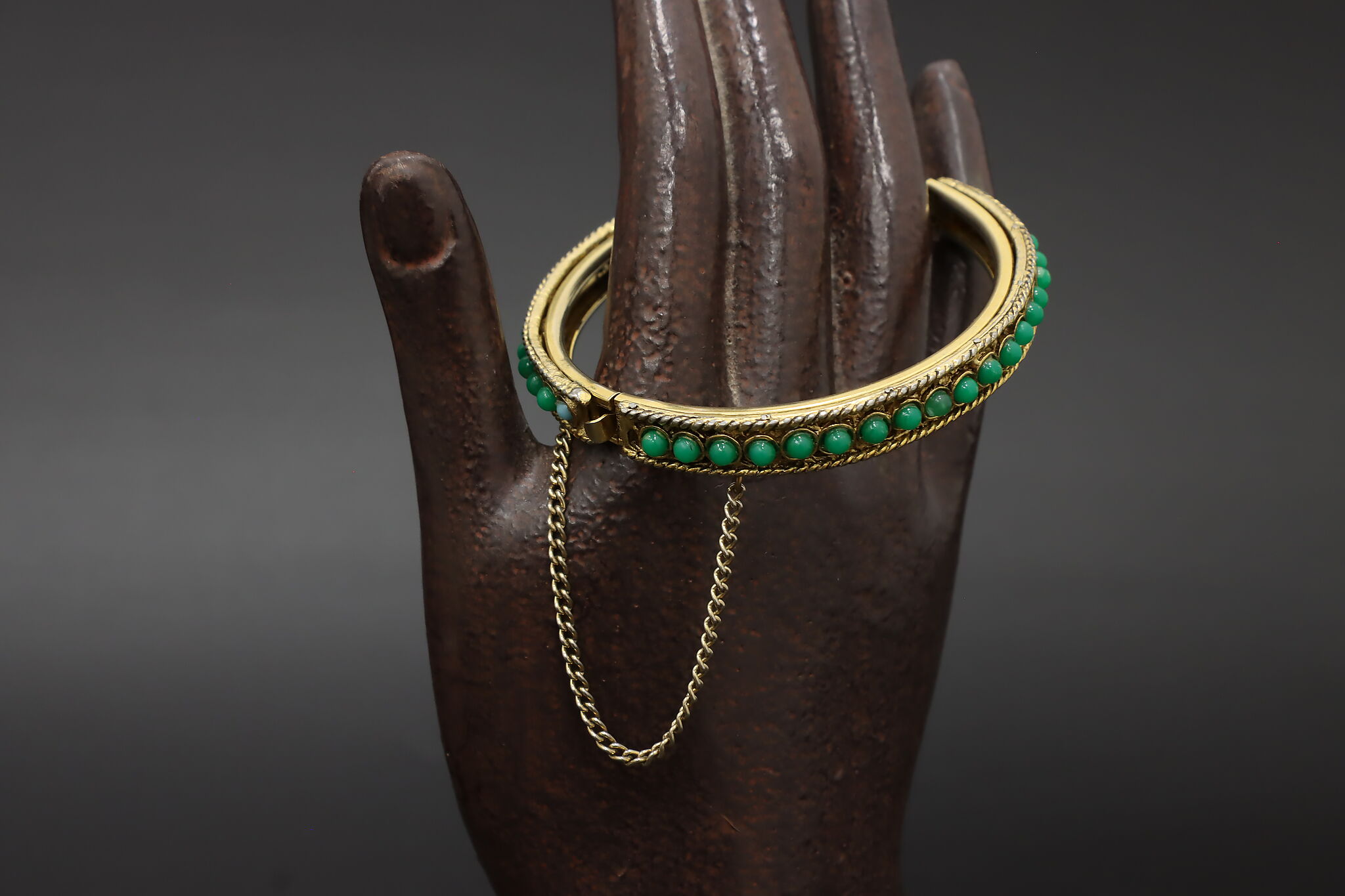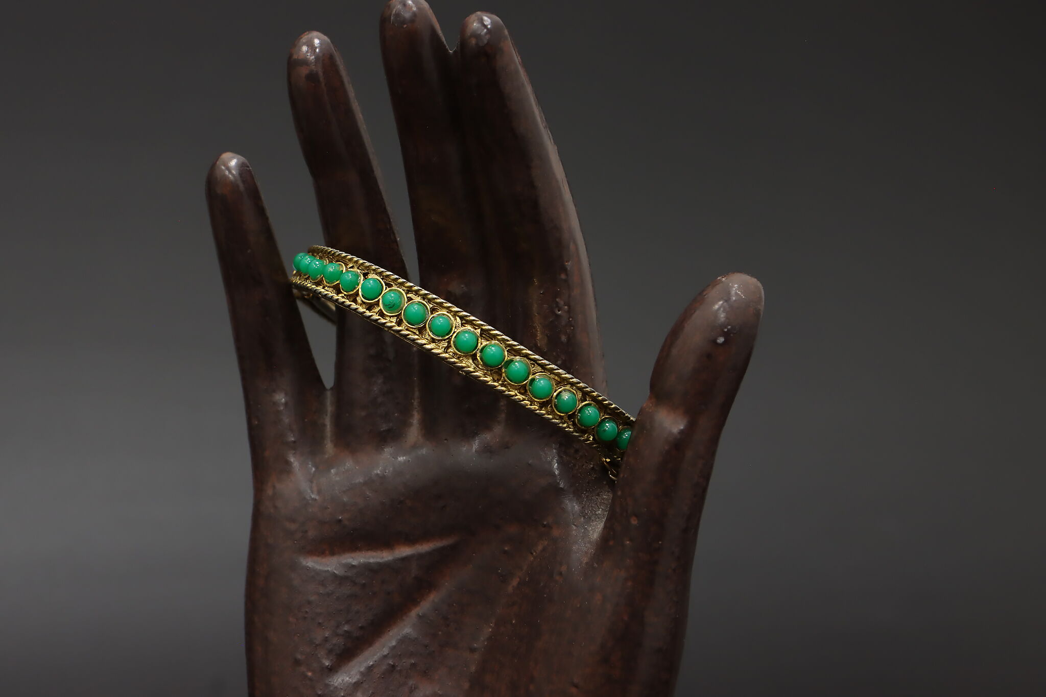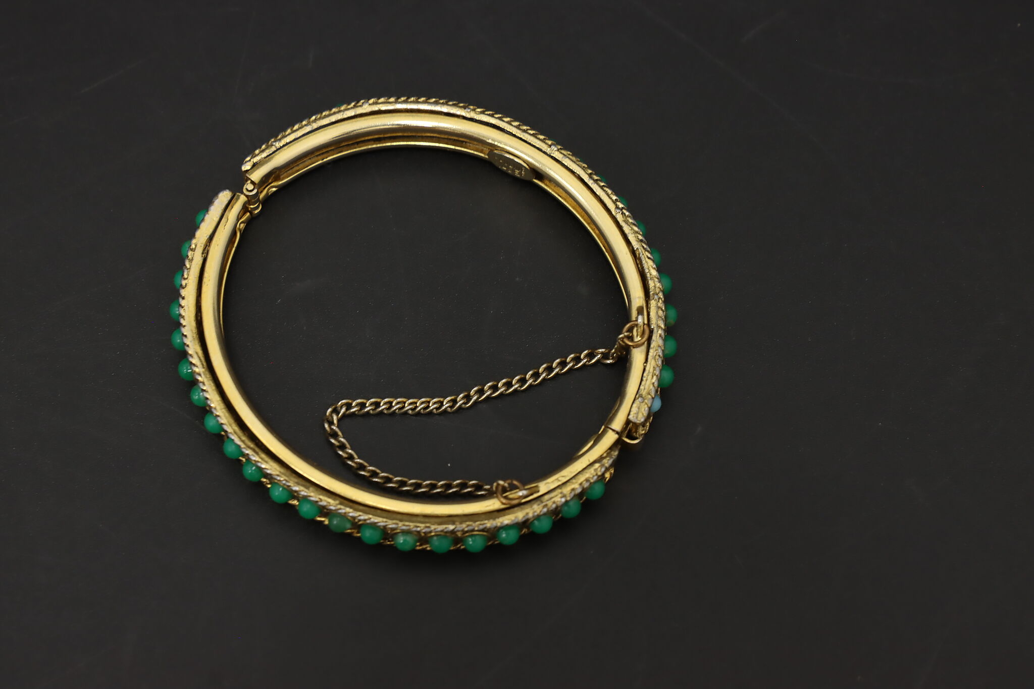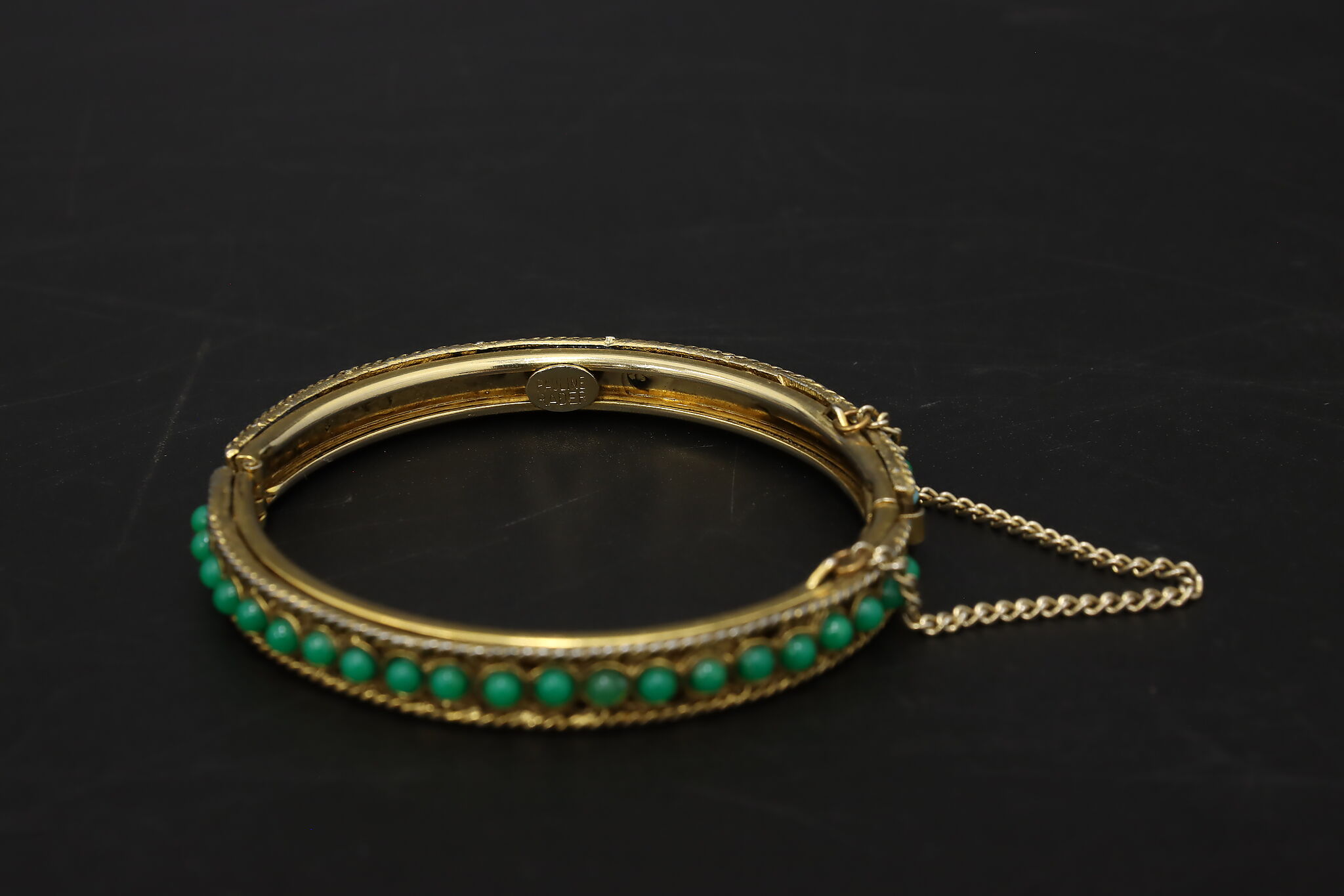 Elegant vintage bracelet by Pauline Rader featuring vibrant green cabochon stones set in richly textured gold tone metal. The raised beaded detailing and luminous green stones create a bold yet refined statement, characteristic of Rader’s high-end costume jewelry designs.