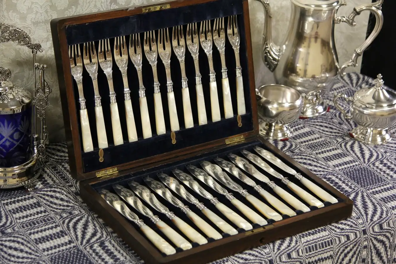 An elegant "fish" set with genuine shimmering mother-of-pearl handled flatware includes twelve forks and twelve knives, made in England around 1900.