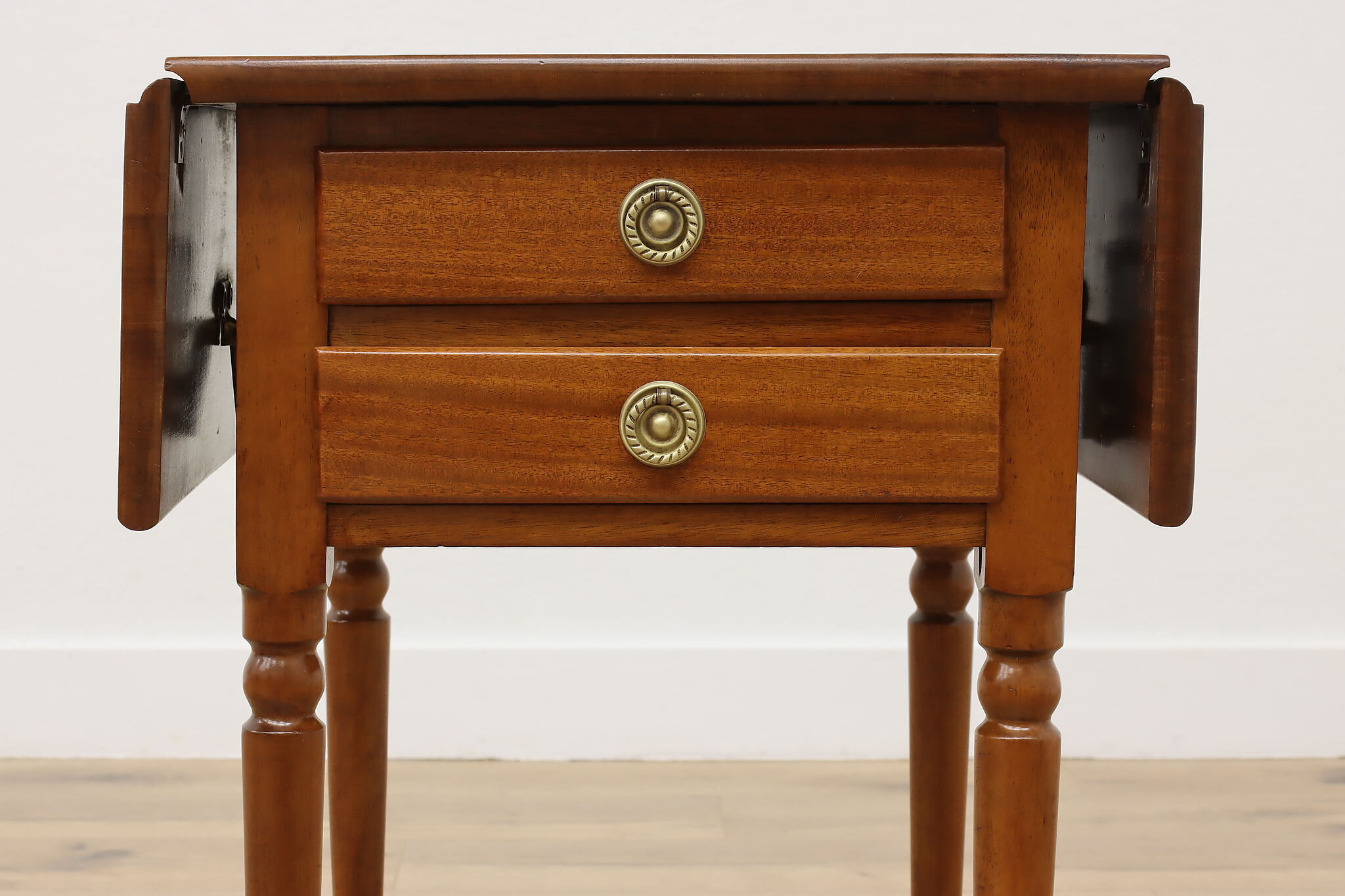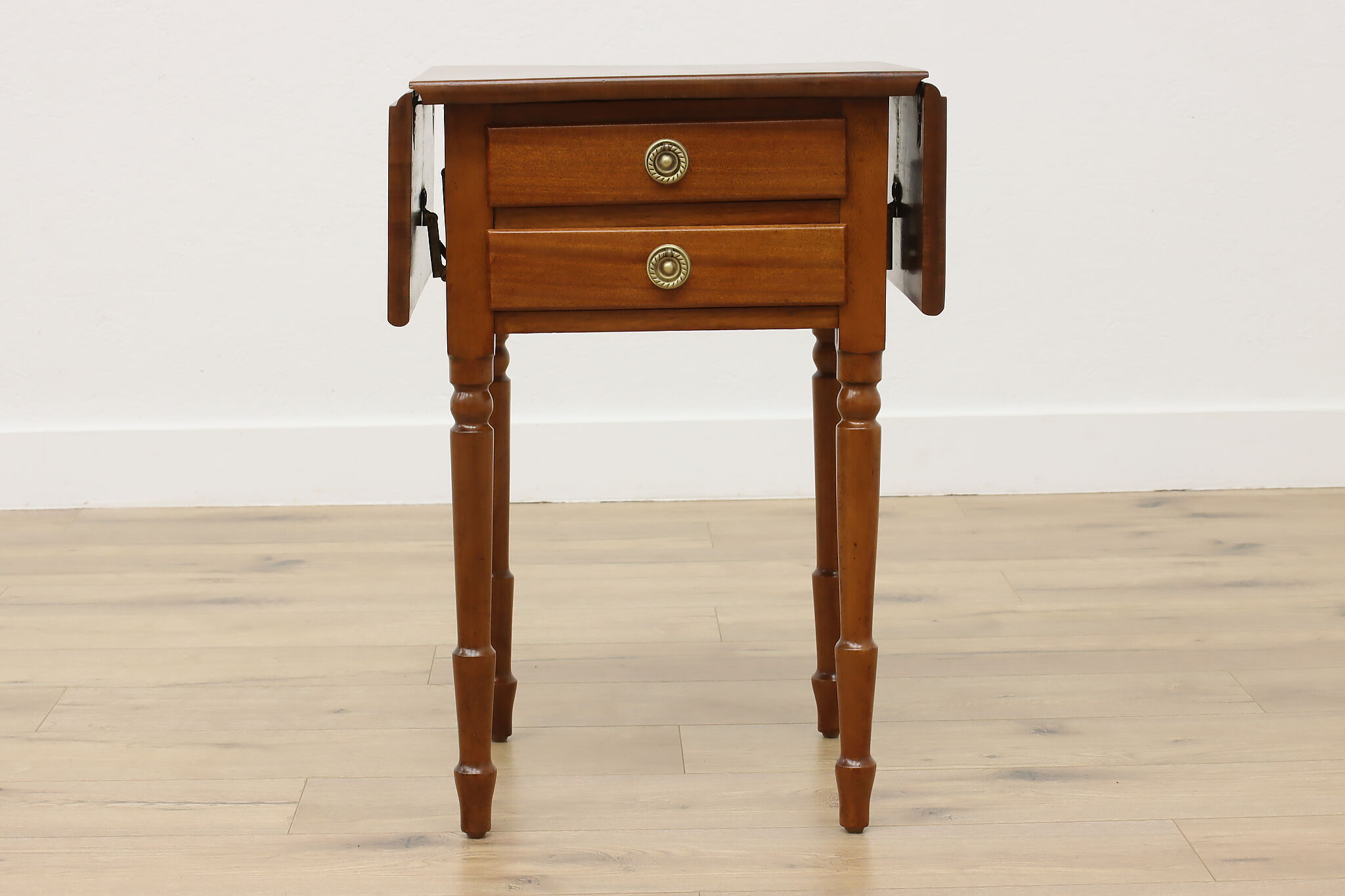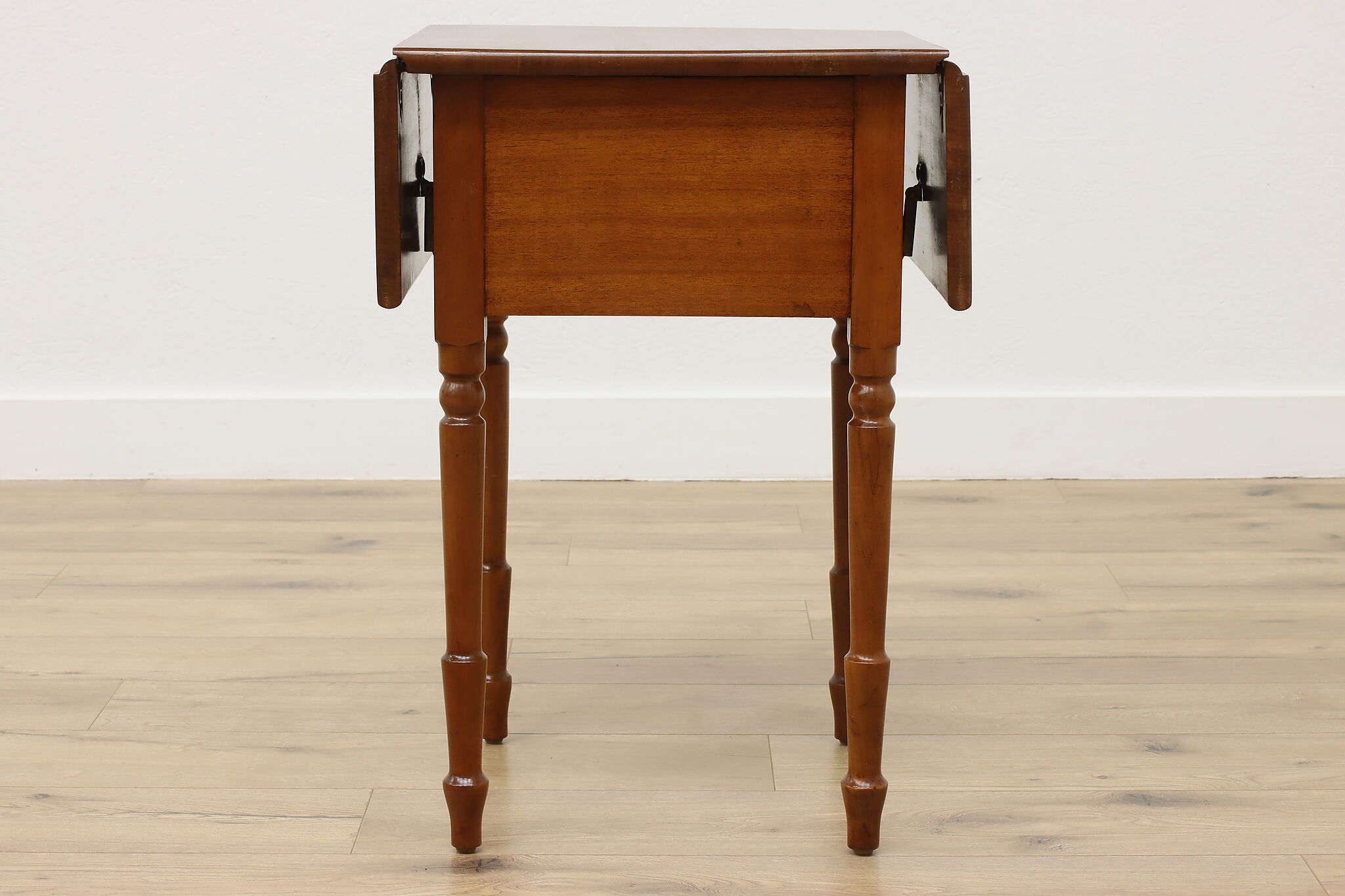Designed after the Sheraton period (1780-1820) in both Europe and America, this "Pembroke" or drop leaf table is perfect as a nightstand or for a lamp.