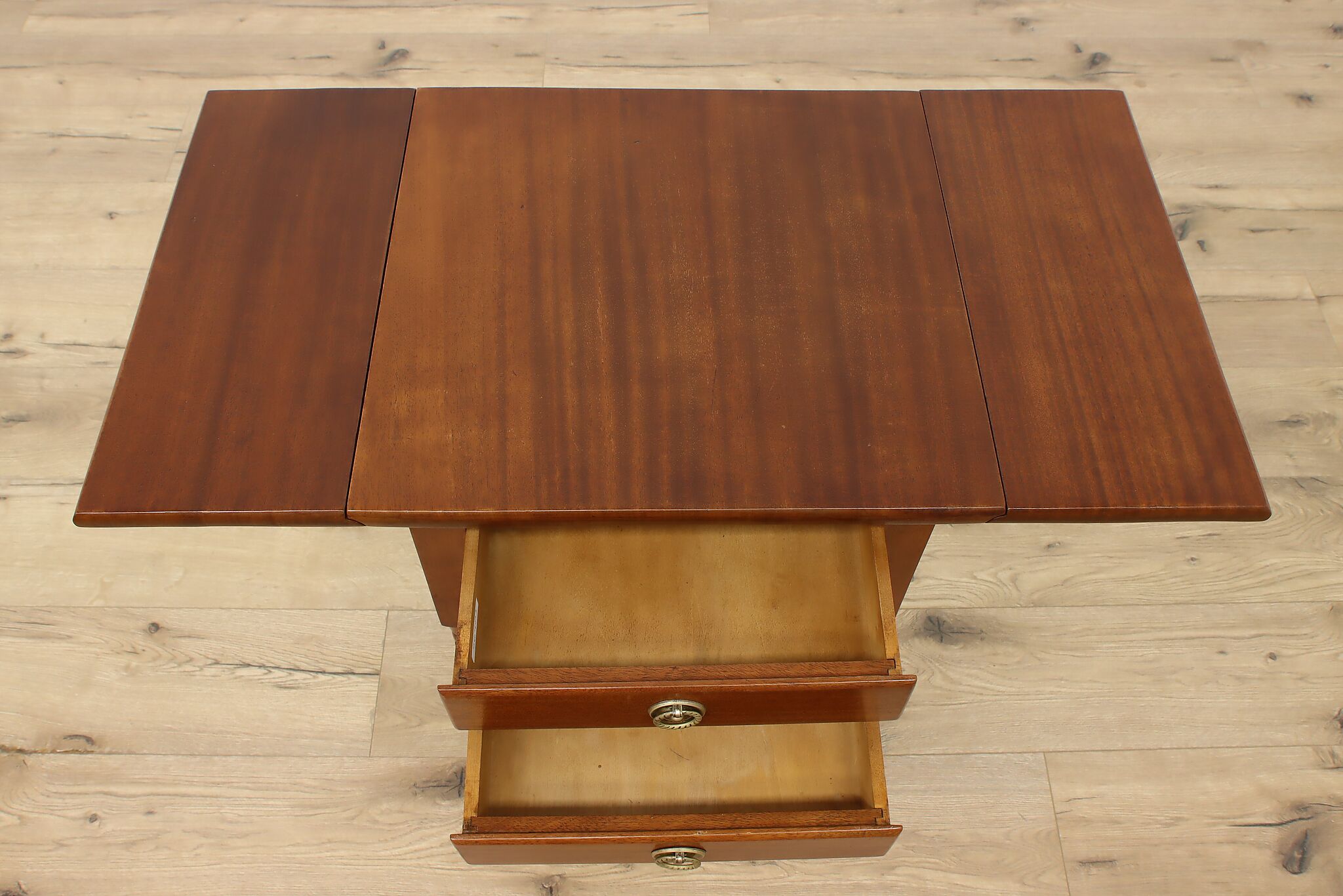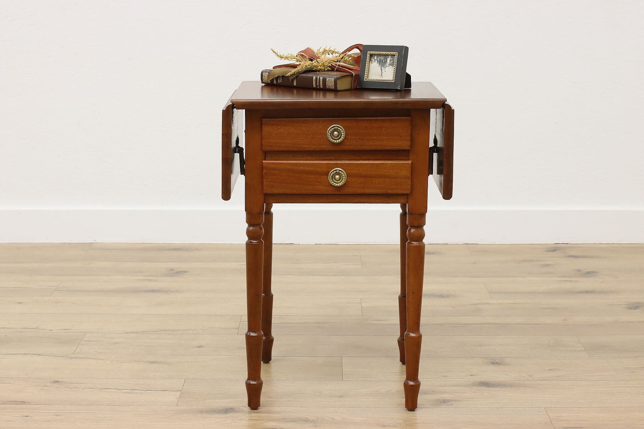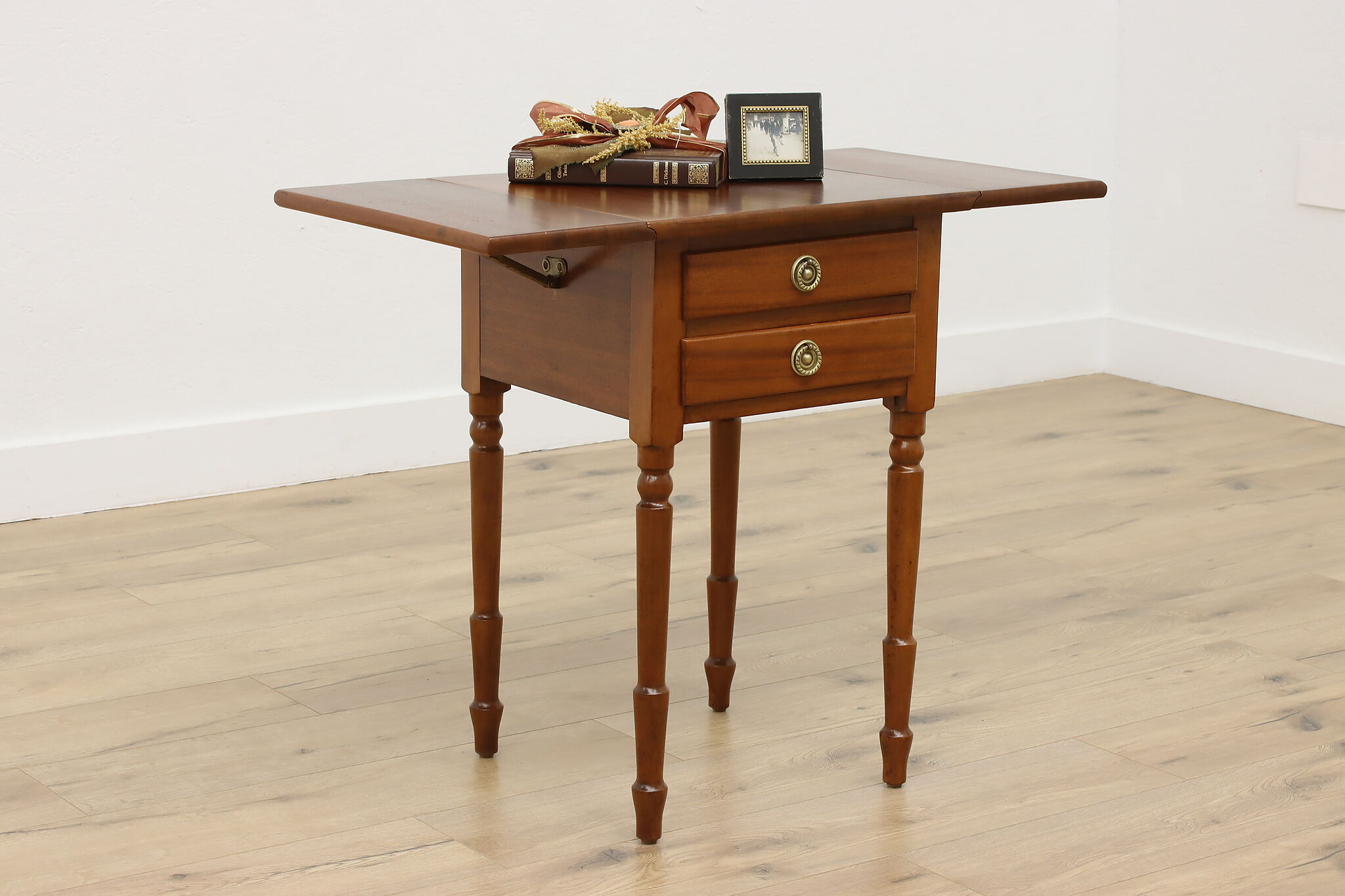 Designed after the Sheraton period (1780-1820) in both Europe and America, this "Pembroke" or drop leaf table is perfect as a nightstand or for a lamp.