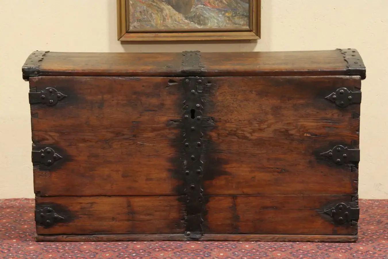 Corners have hand cut dovetails, hand planing marks are on every surface. Hand wrought iron bands and rose cut nails are authentic. Inside this picturesque northern European furniture is a small compartment for valuables.