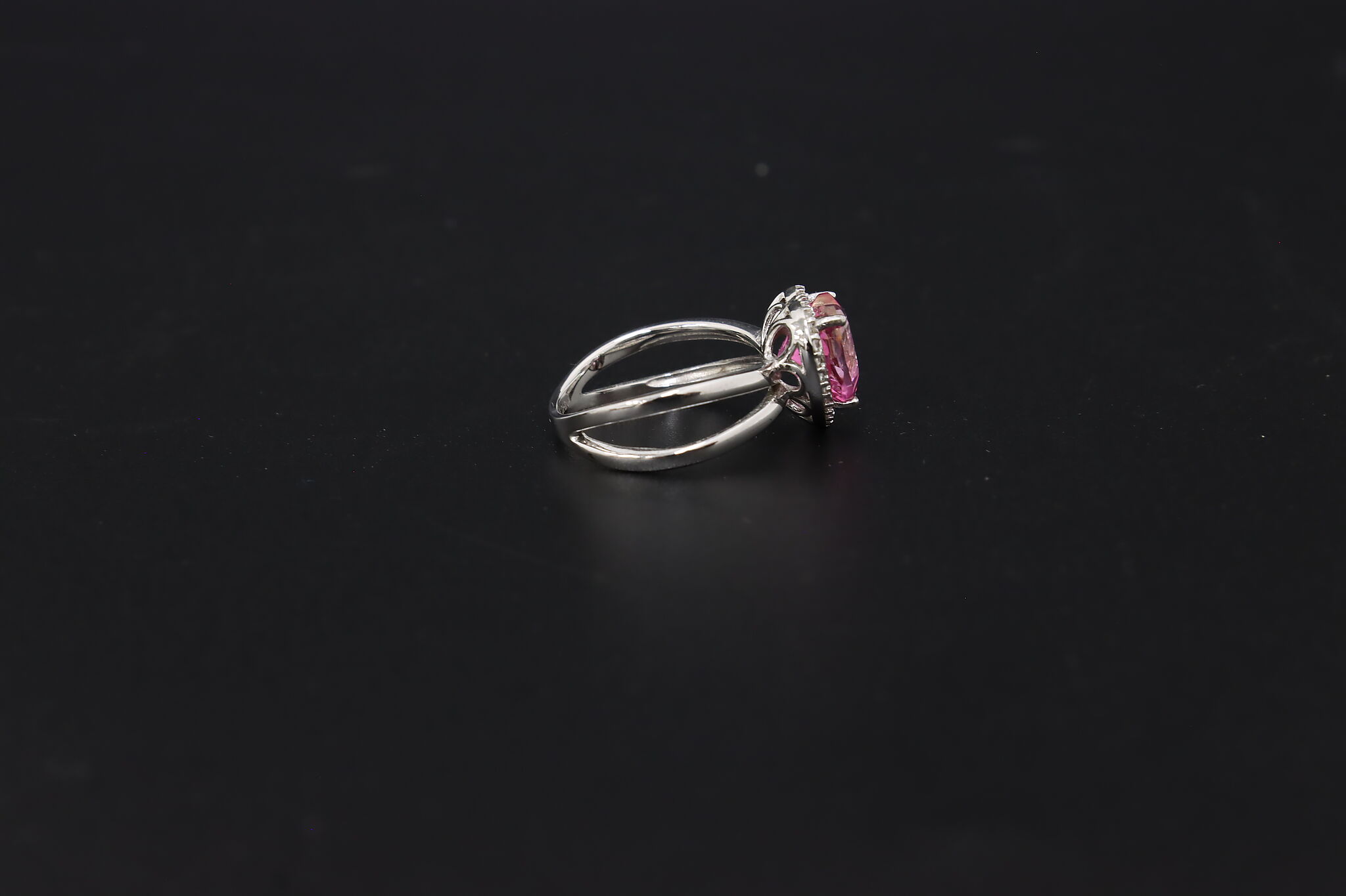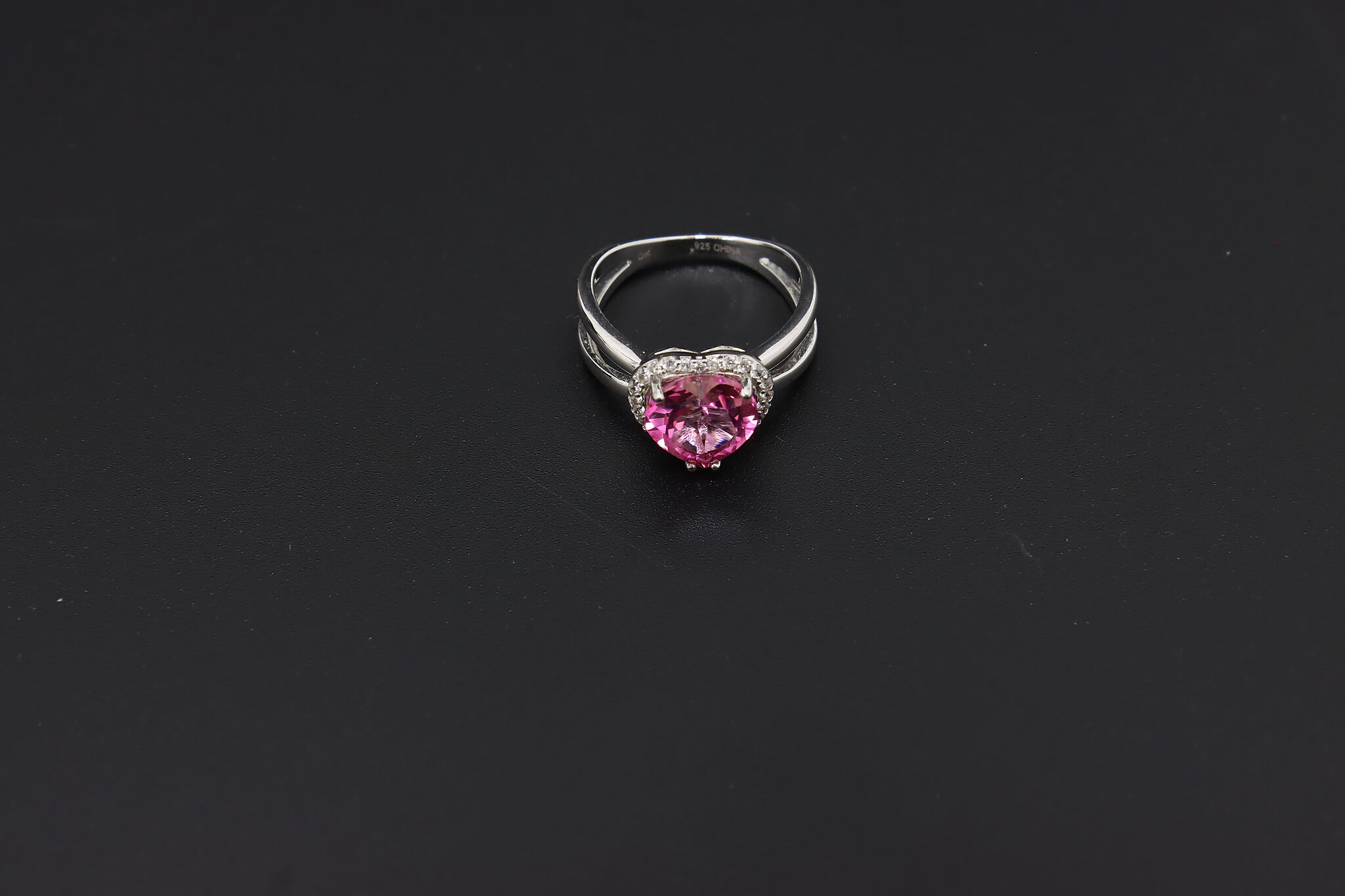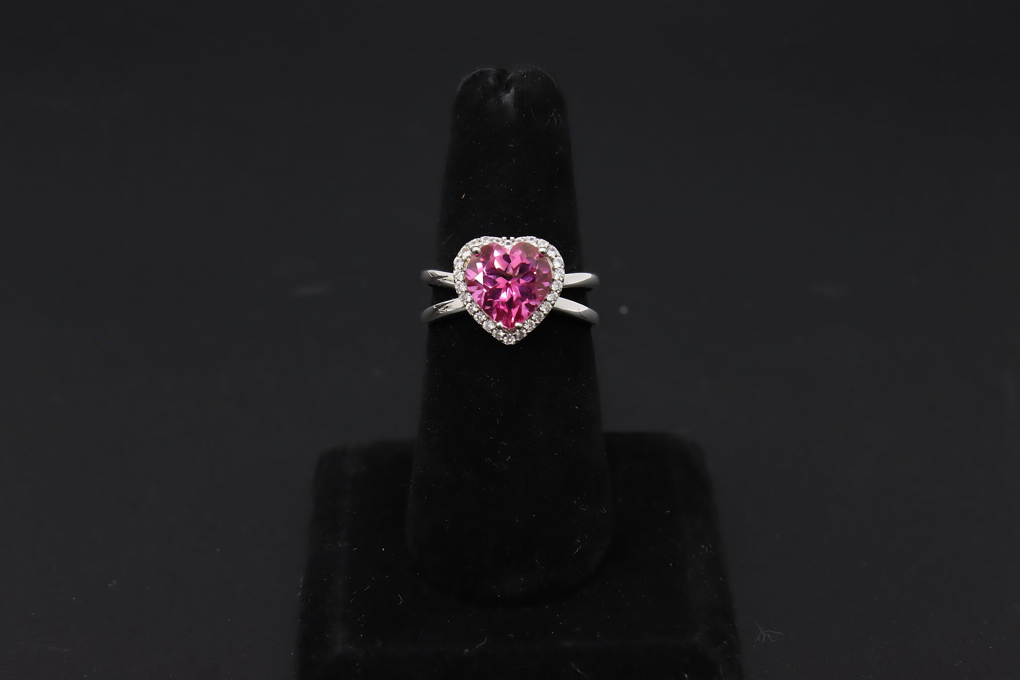 This absolute darling ring features a heart-shaped pink gemstone with an elegant band.