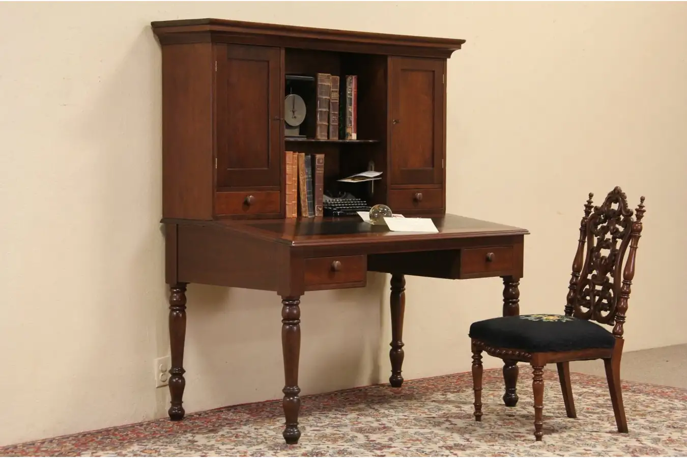 The finish is in excellent condition on solid walnut, there are a few stains and mars for antique character, see photos. An upper section has locking doors and is removable for easier delivery.
