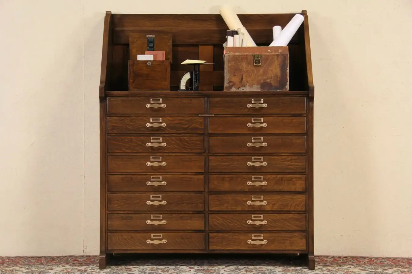 This 16 drawer file cabinet or map chest was made to hold prints or manuscripts in a library and was made about 1910.