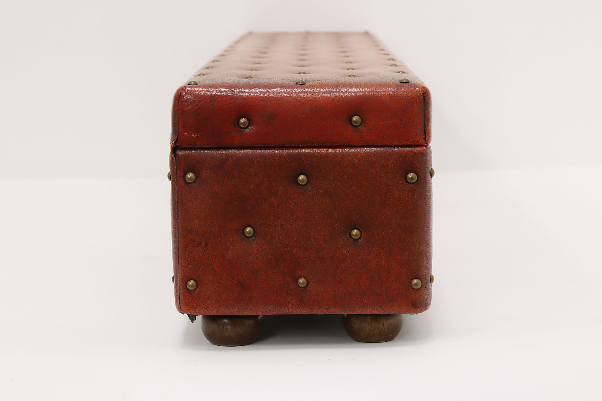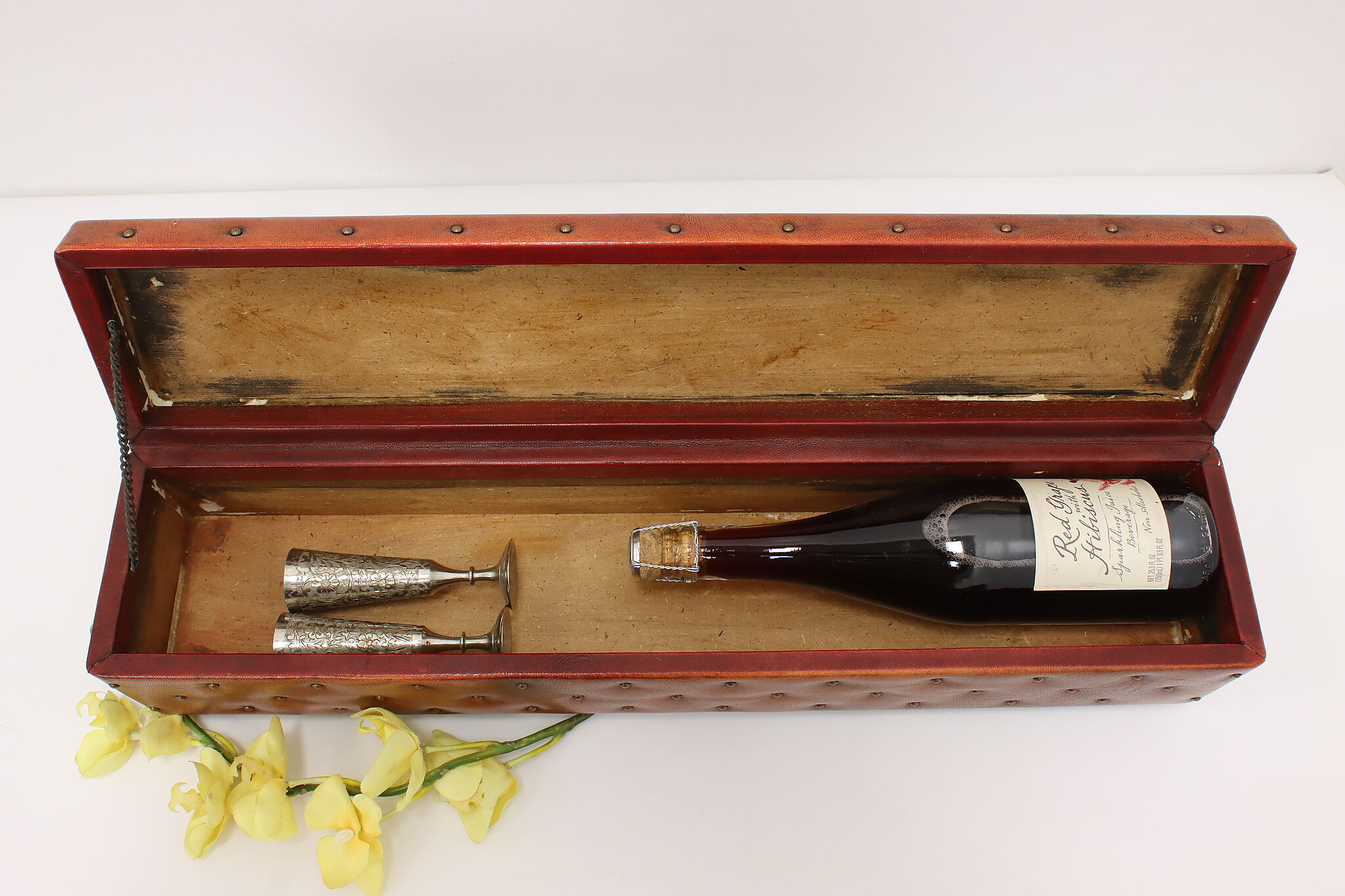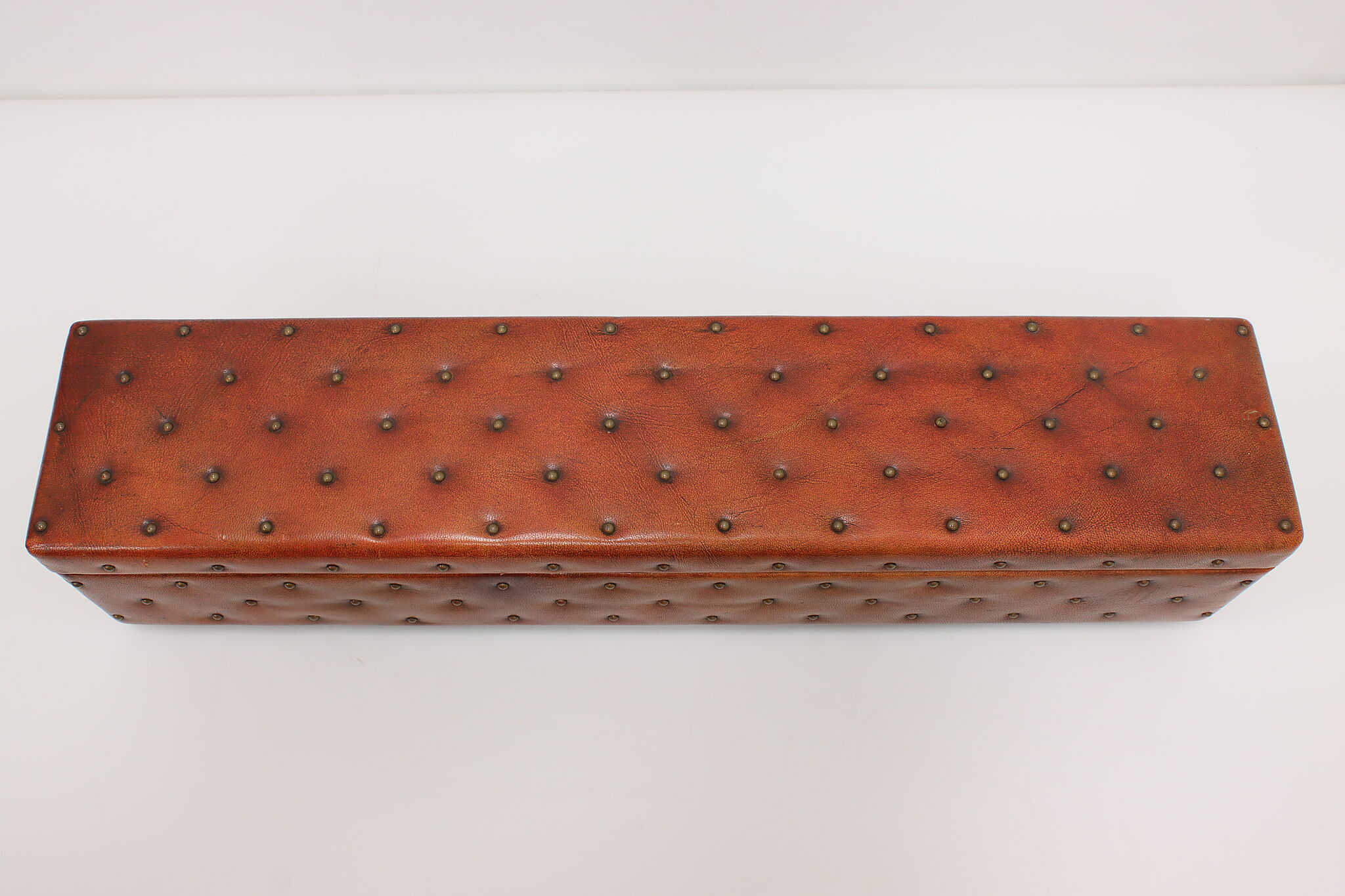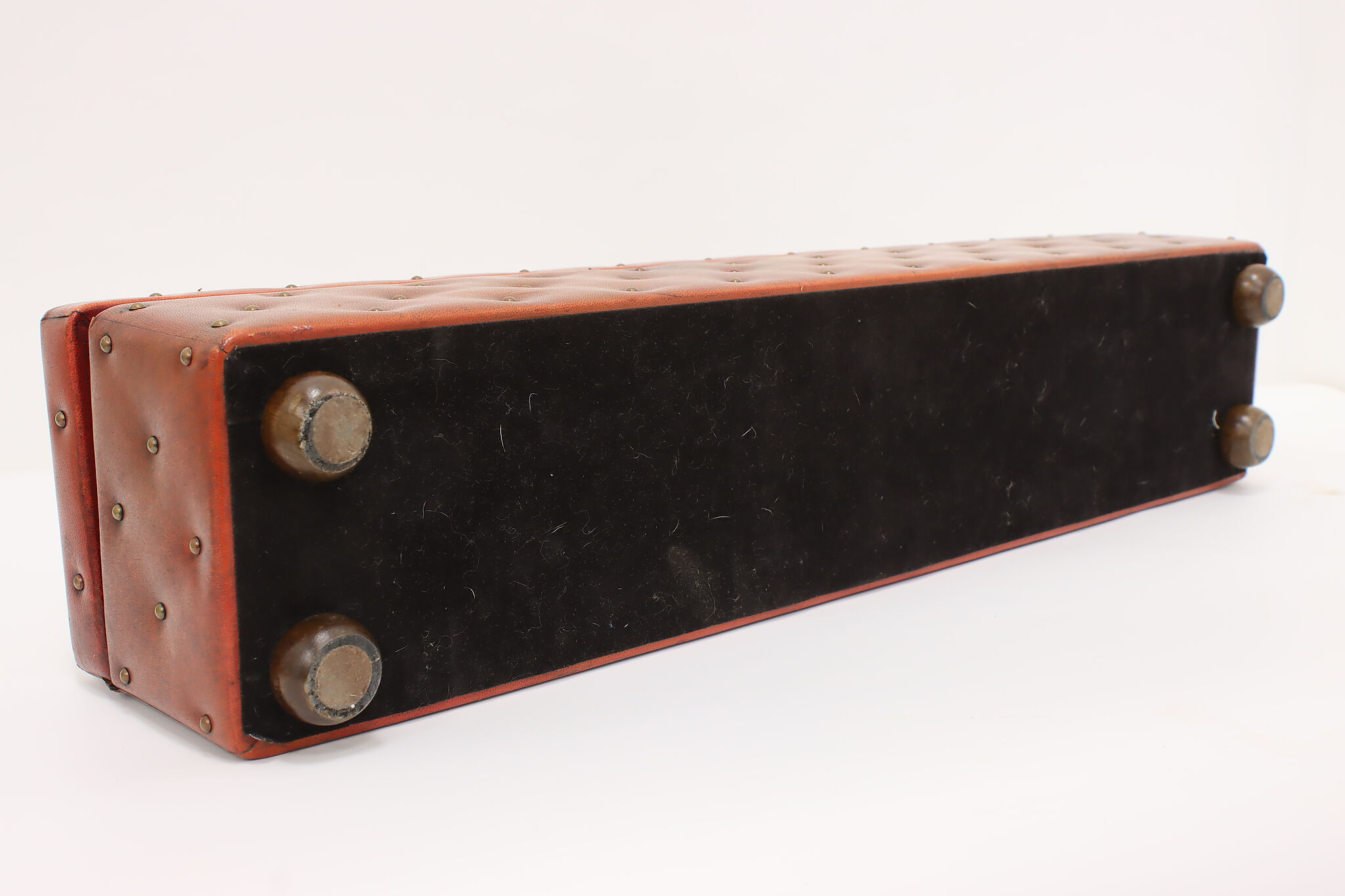This gun, keepsake, collector, or jewelry box has wonderful rustic charm with its worn red leather upholstery.