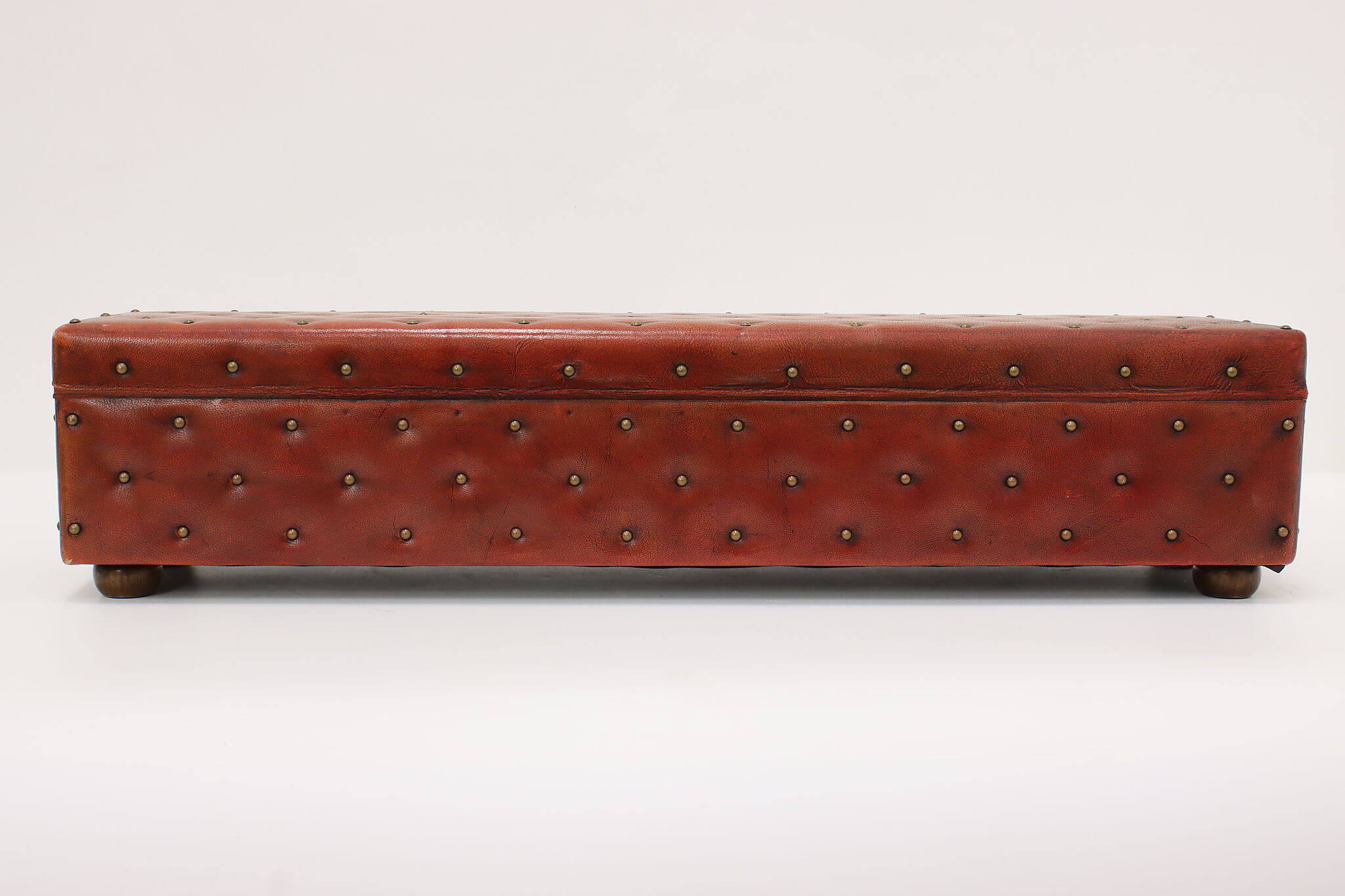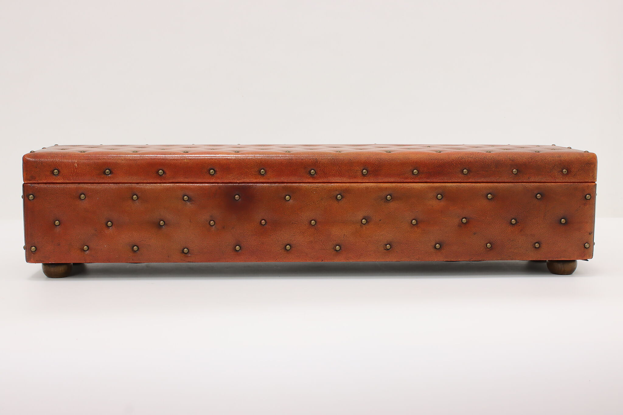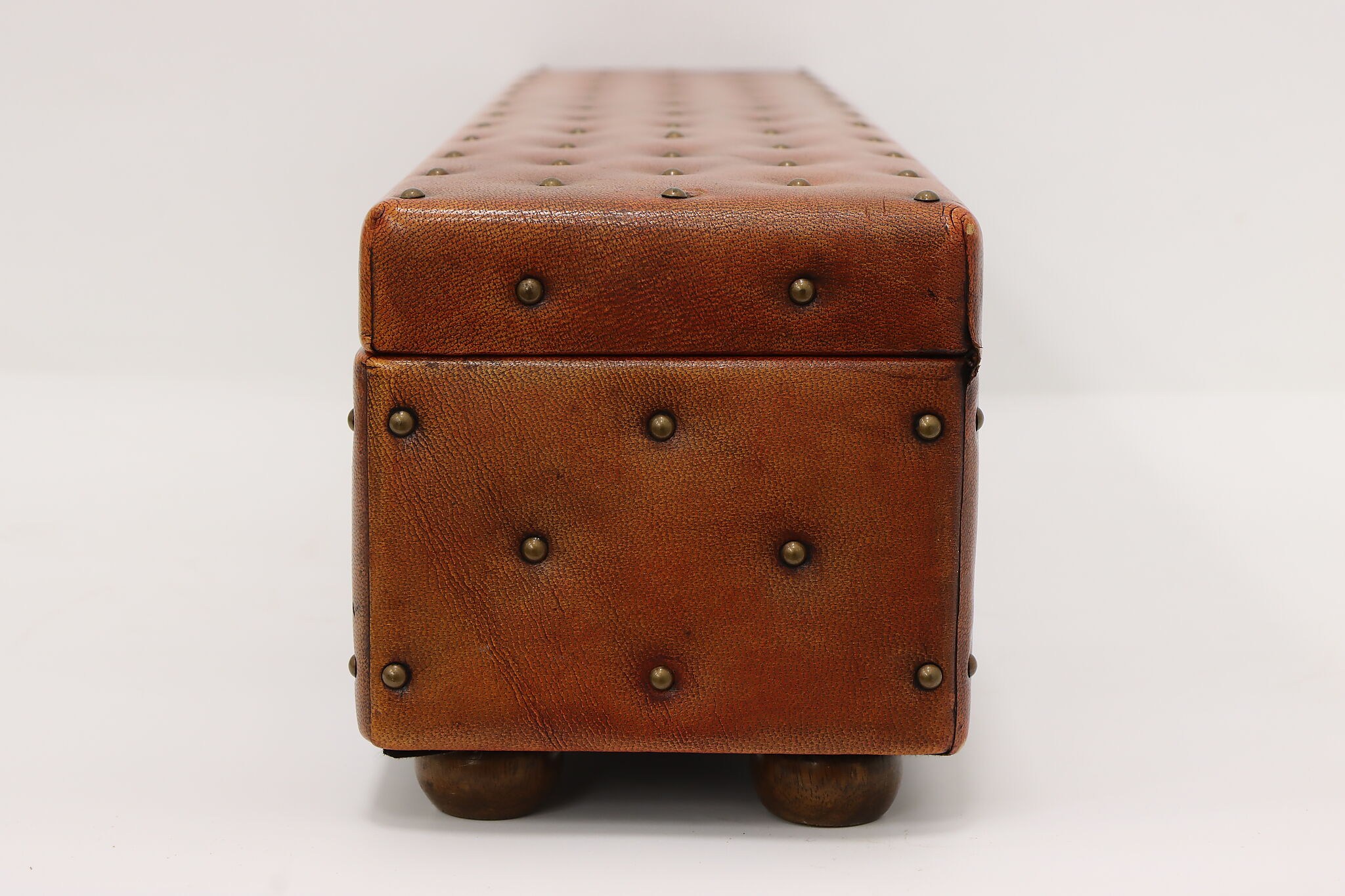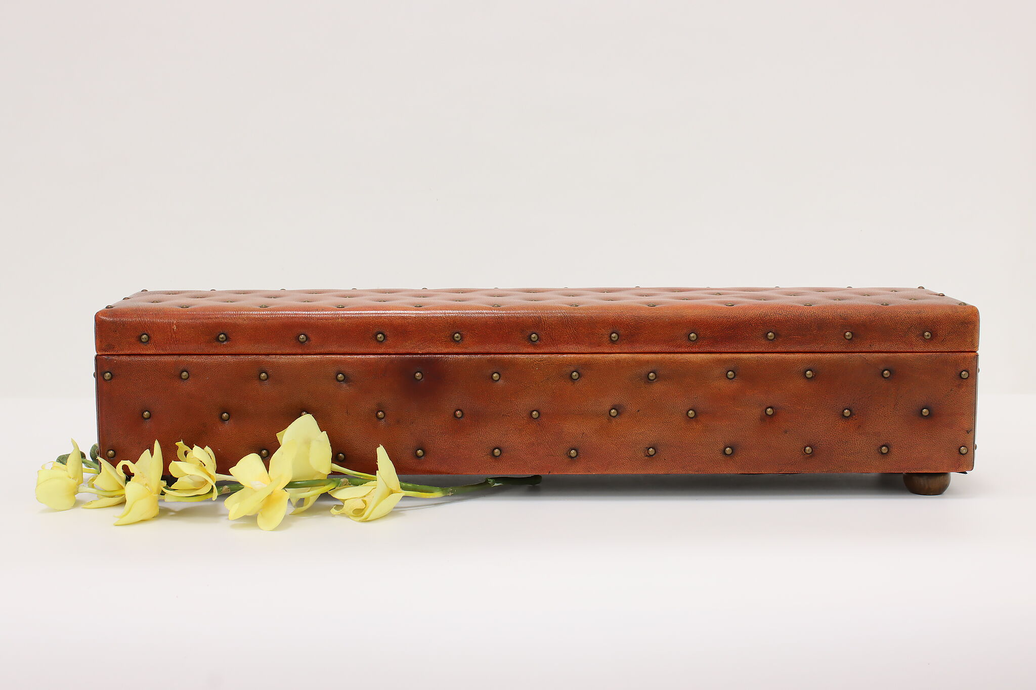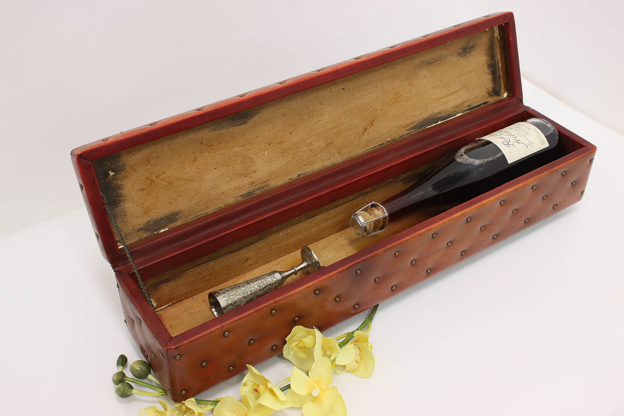 This gun, keepsake, collector, or jewelry box has wonderful rustic charm with its worn red leather upholstery.