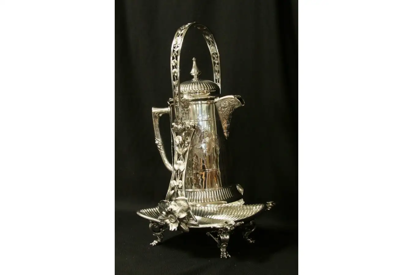 Signed by famous silversmith, "Reed and Barton," an exquisite silverplate tilting pitcher and stand is engraved "Pat. May 10, 1878."