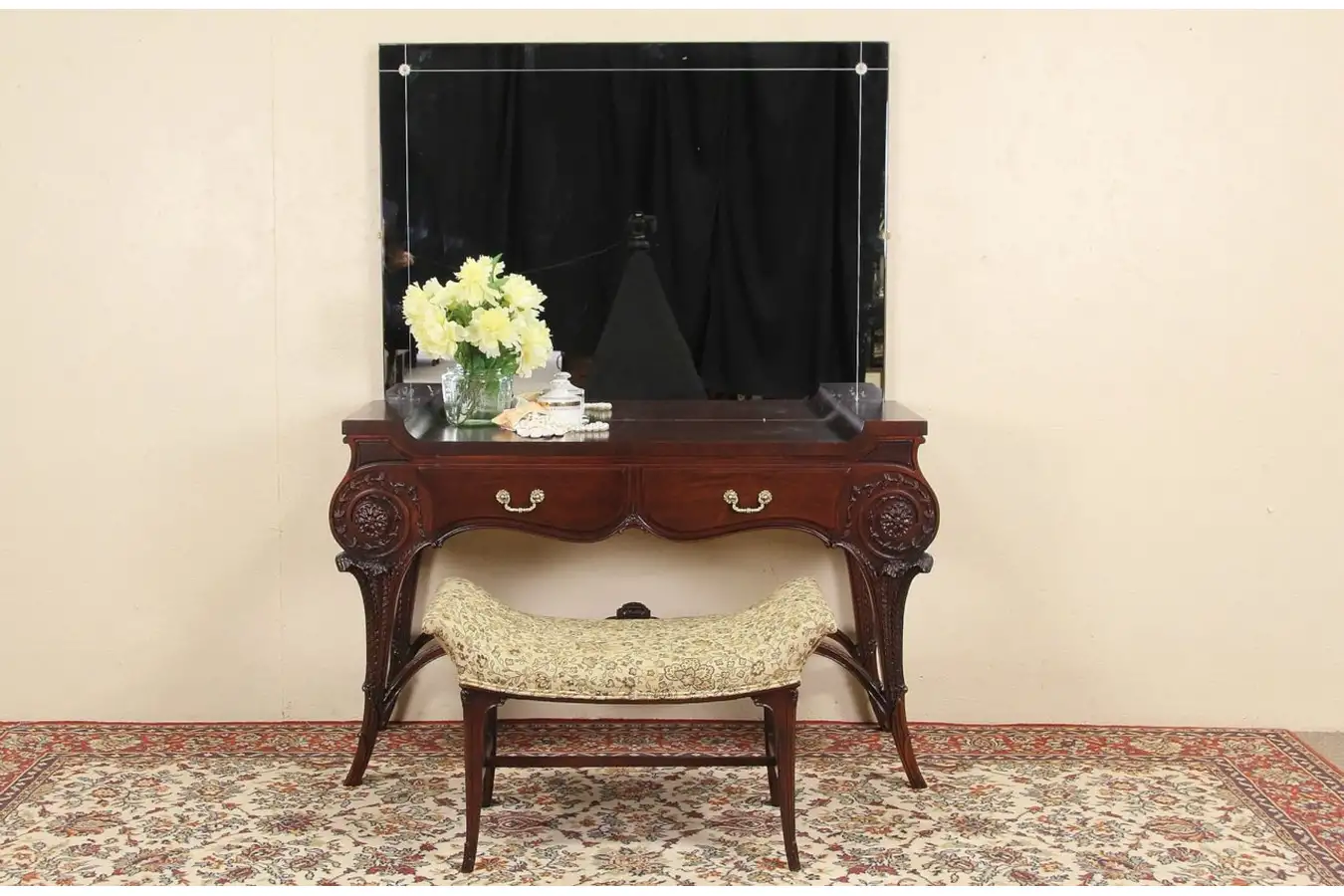 An elegant Regency style dressing table or vanity desk and bench date from the 1940's.
