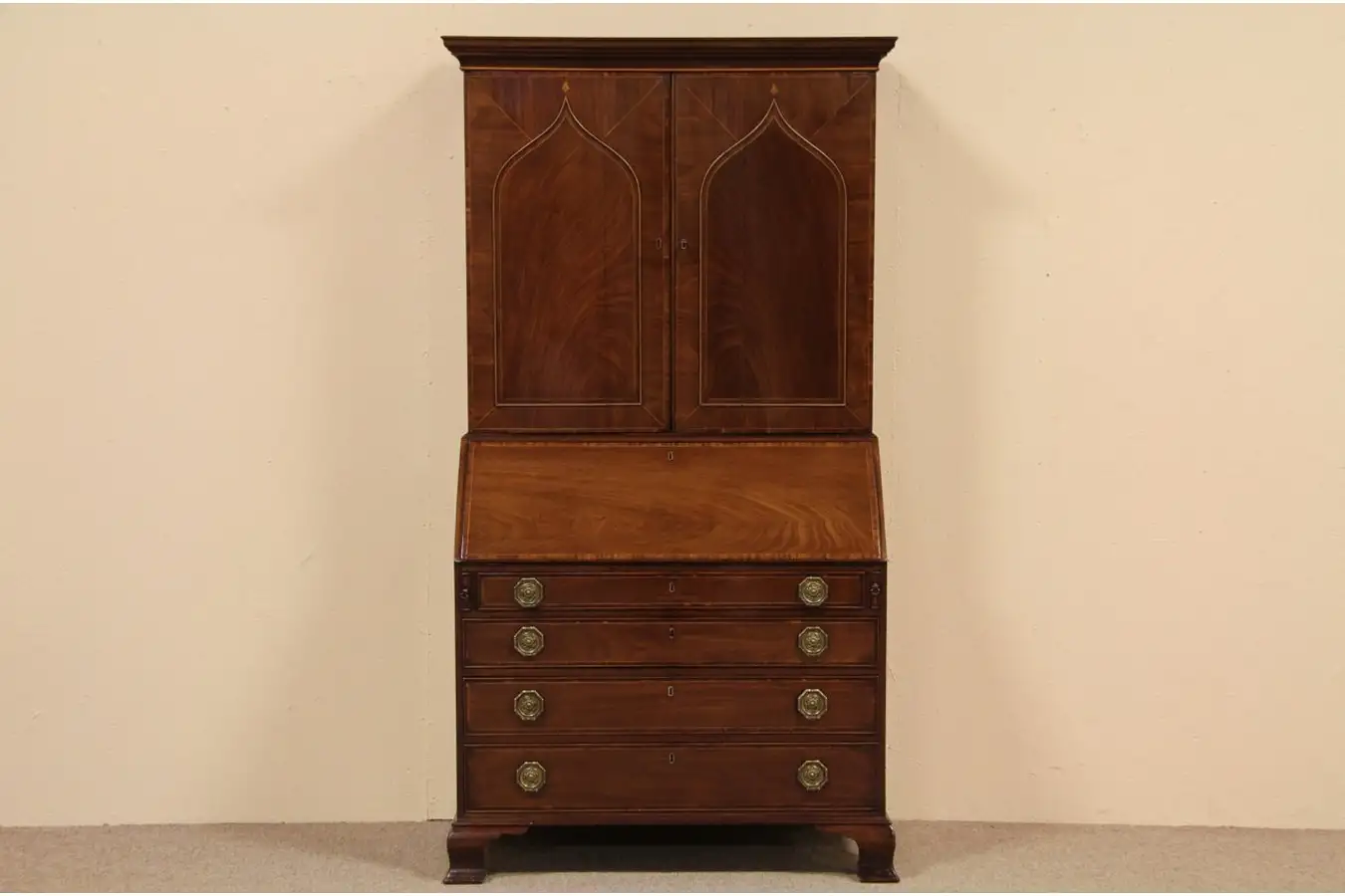 Hand made about 1825, an English Regency period secretary desk has a bookcase top with Gothic arched doors. The polished old finish is in wonderful condition with warm antique patina on gorgeously figured mahogany. The subtle inlaid satinwood banding is exceptional. There is lots of character - stains, shrinkage separations from age, warps - see photos.