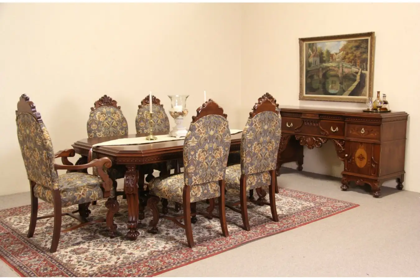A magnificent 1920's dining set in the Renaissance manner includes a table with four 12" leaves, six upholstered chairs and a sideboard or server with inlaid marquetry.
