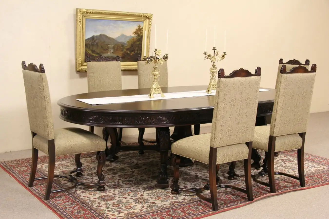 Grandly carved in the Renaissance manner around 1925, this imposing dining set includes an oval table with 5 leaves and six chairs.