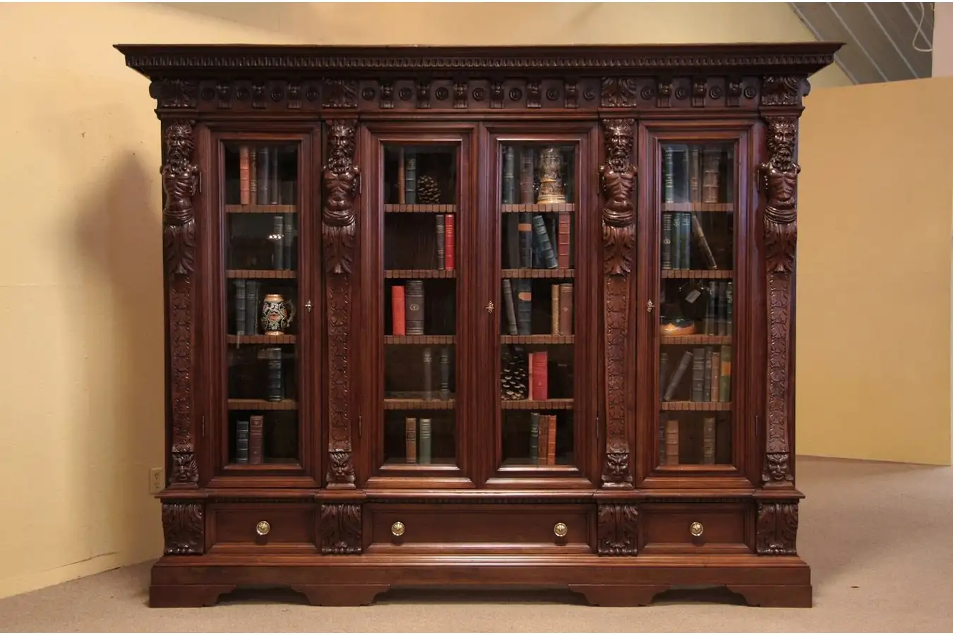 Richly hand carved in the Renaissance manner, a walnut bookcase has hand carved figural statues and lion heads. All four doors have beveled glass.