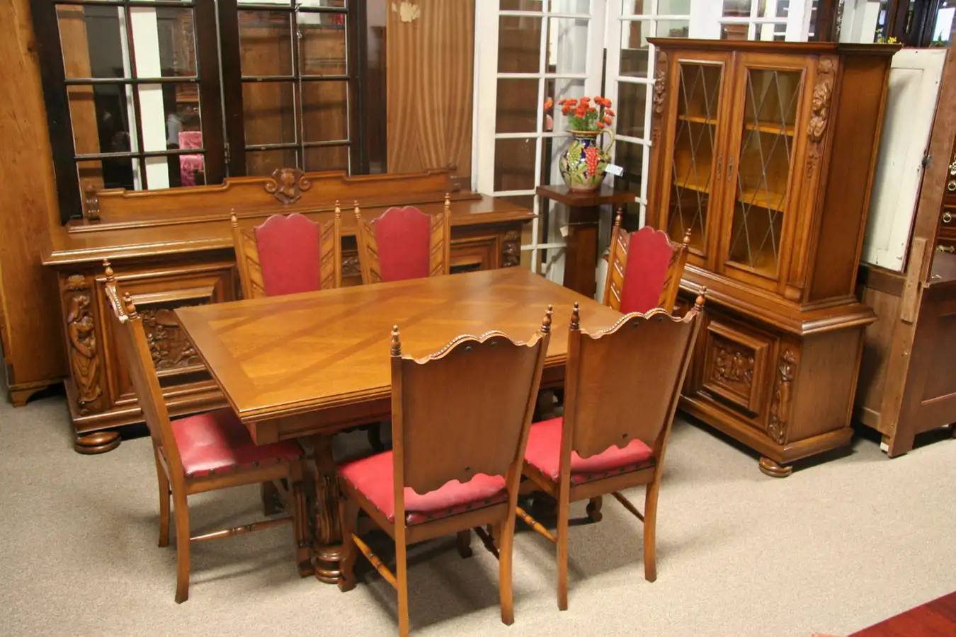 We present this gracious dining set including a table, a large sideboard or buffet carved of oak with high relief figures, 6 chairs, and china cabinet with leaded glass doors. Dating from about 1935, the finish is excellent everywhere in a golden brown. Deep moldings and richly carved figures are all in fine grained oak.