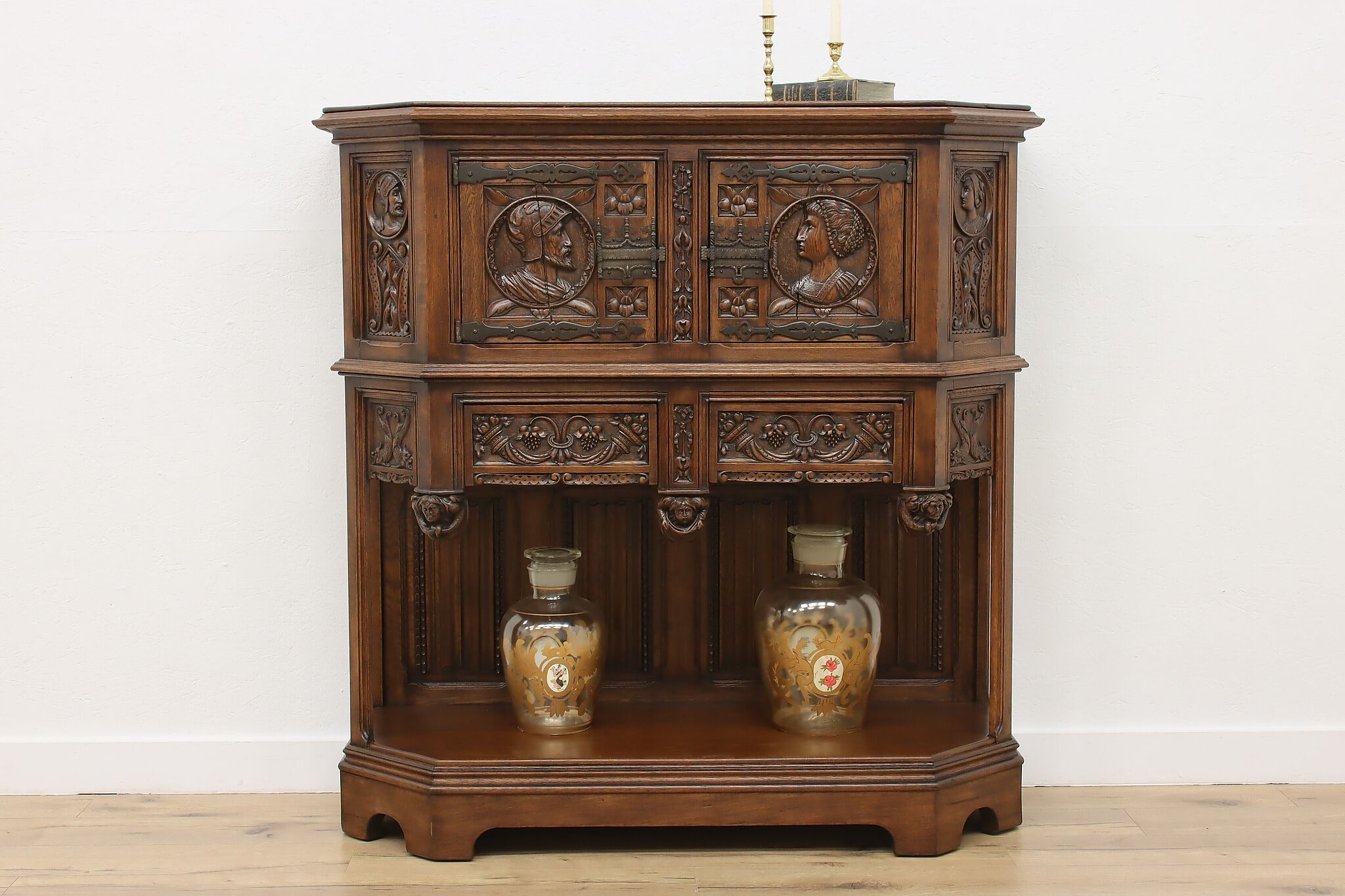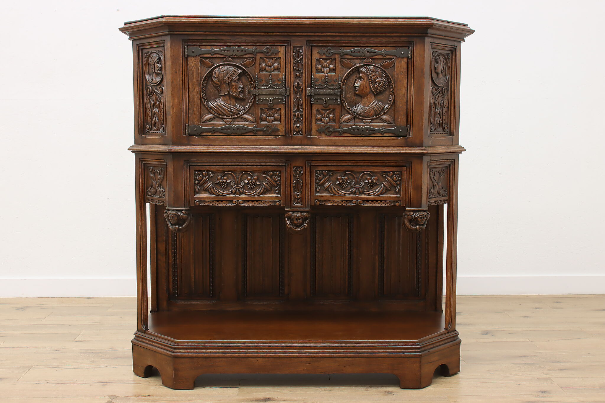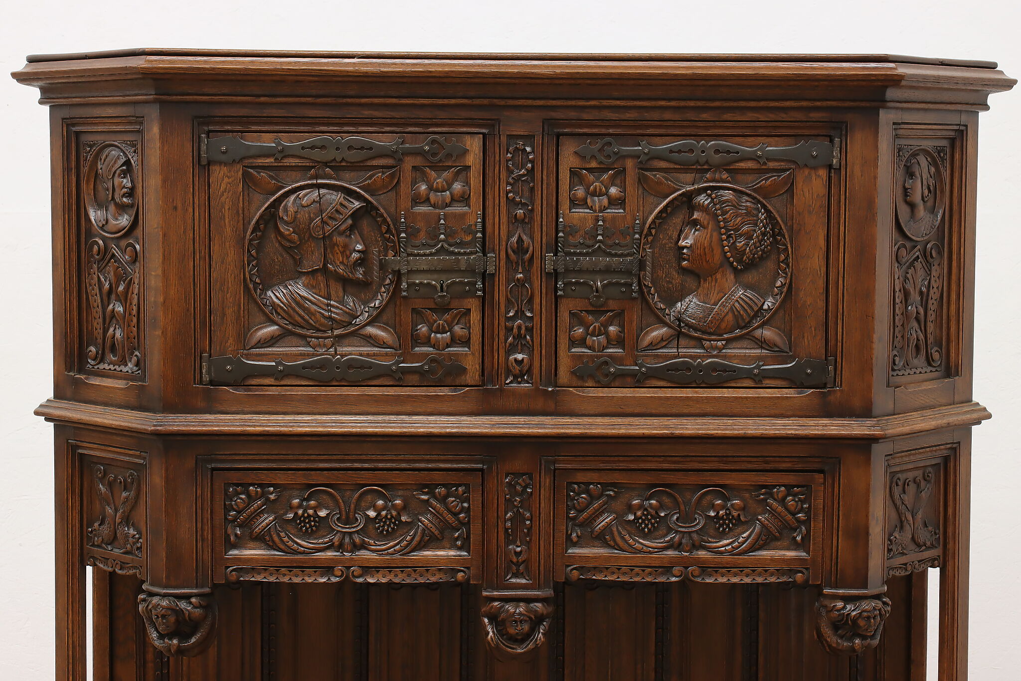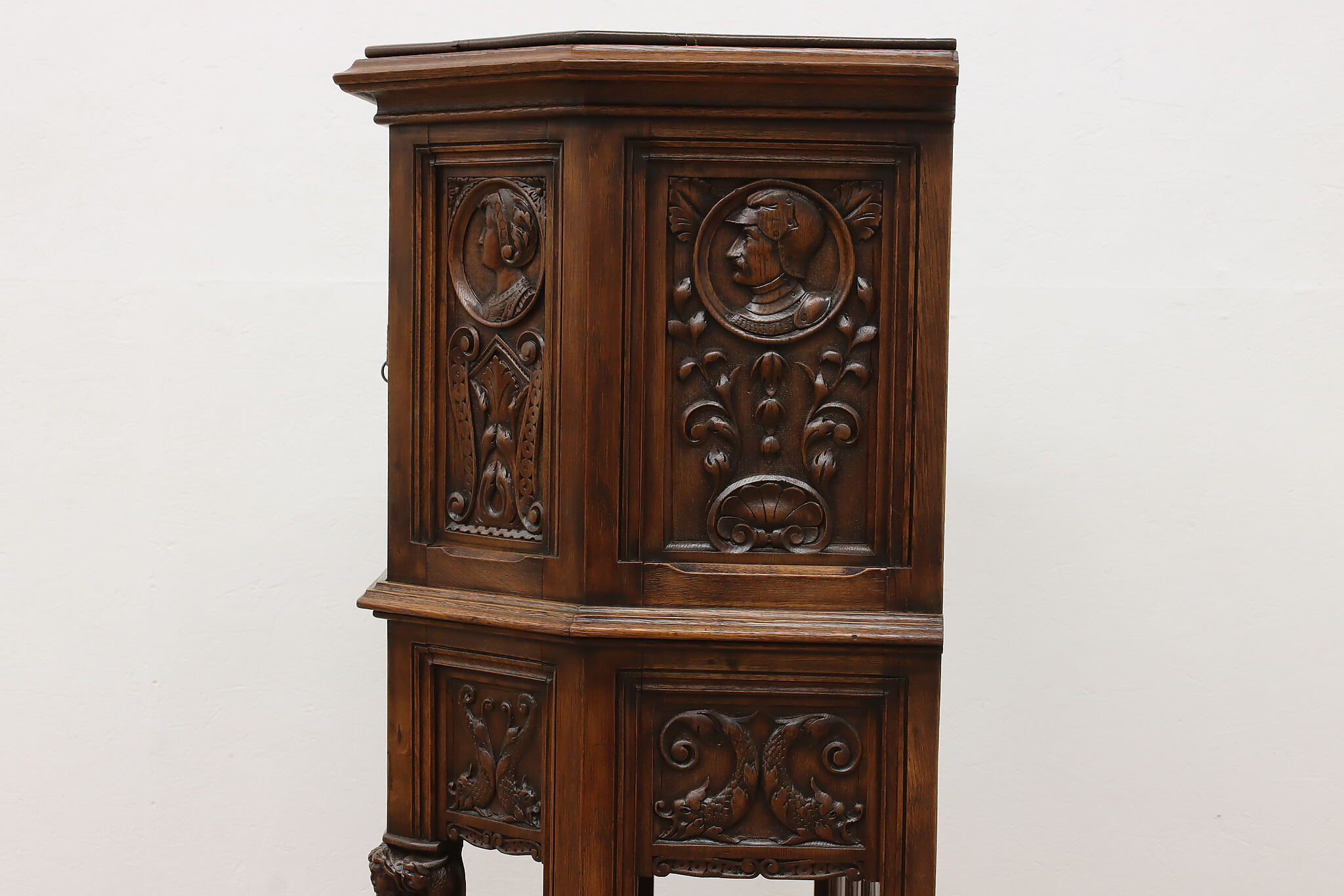 The romantic story of a knight and his beloved lady is beautifully preserved forever on this fantastic Renaissance hall or bar cabinet.