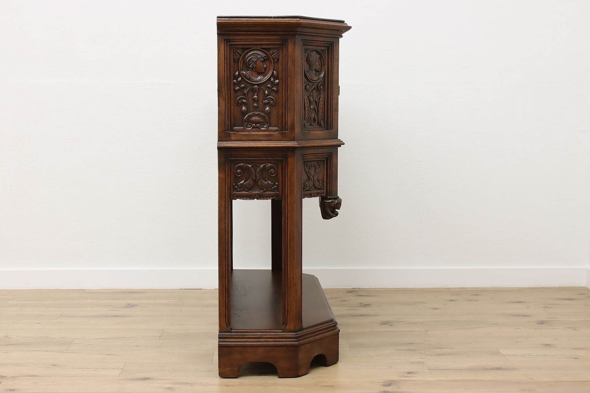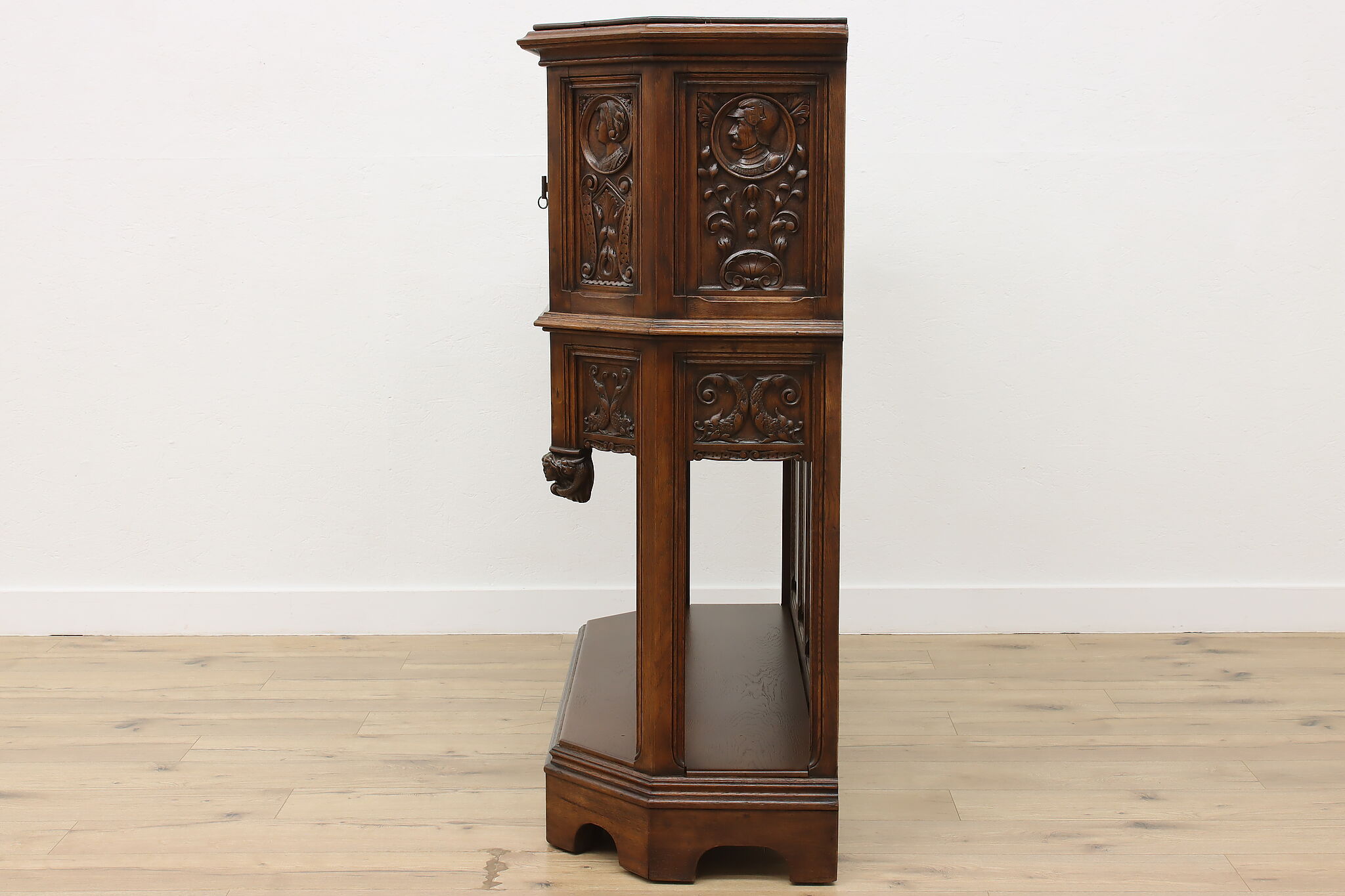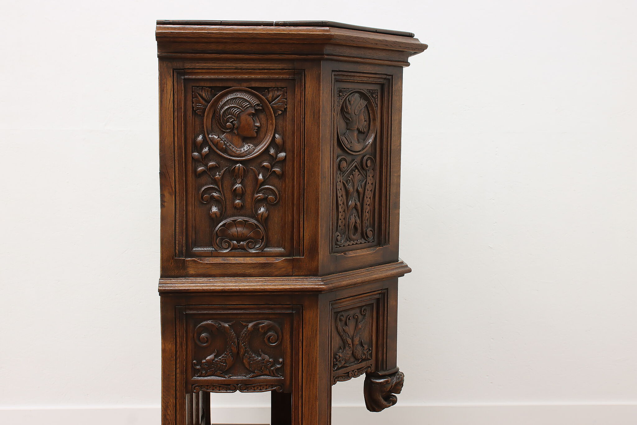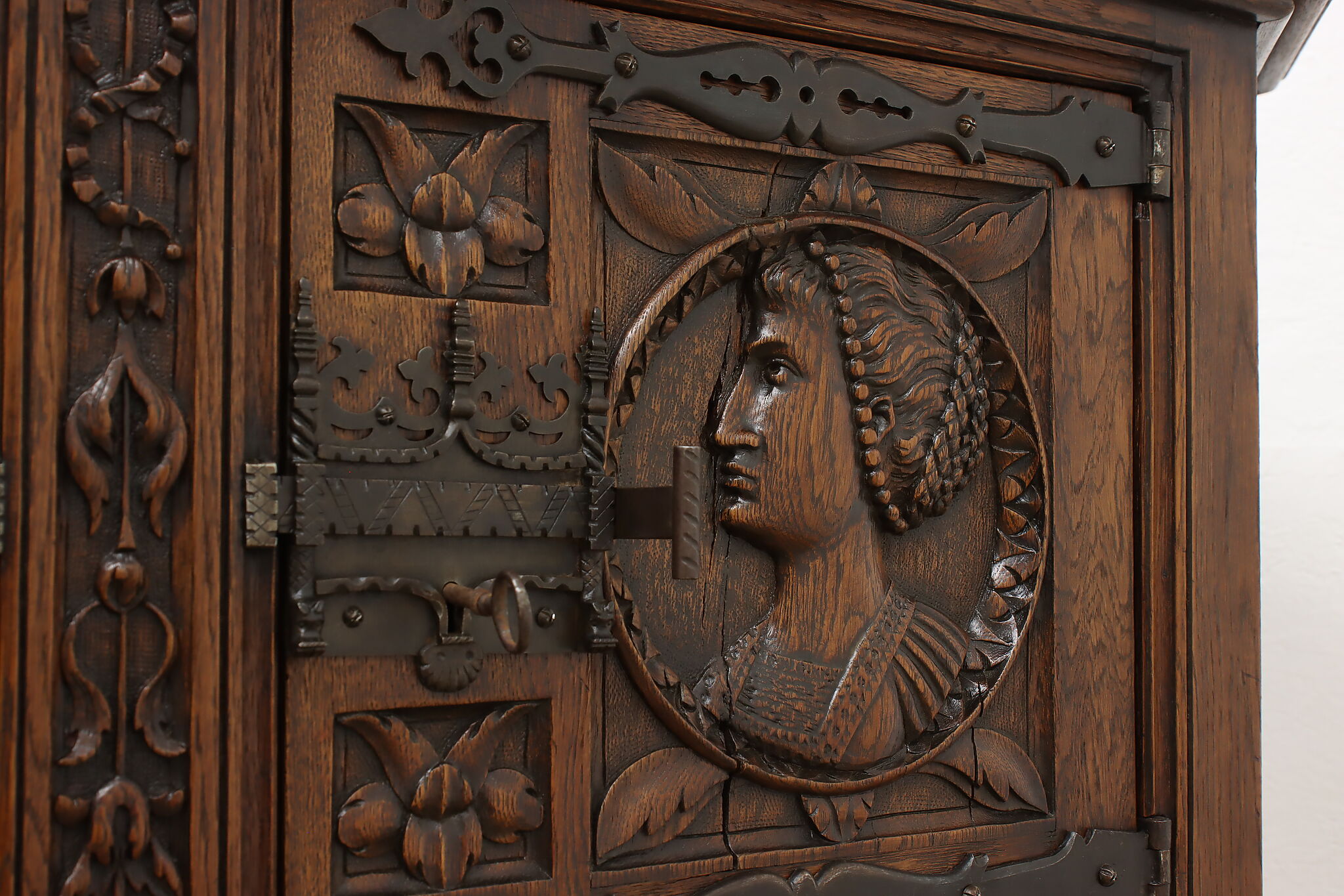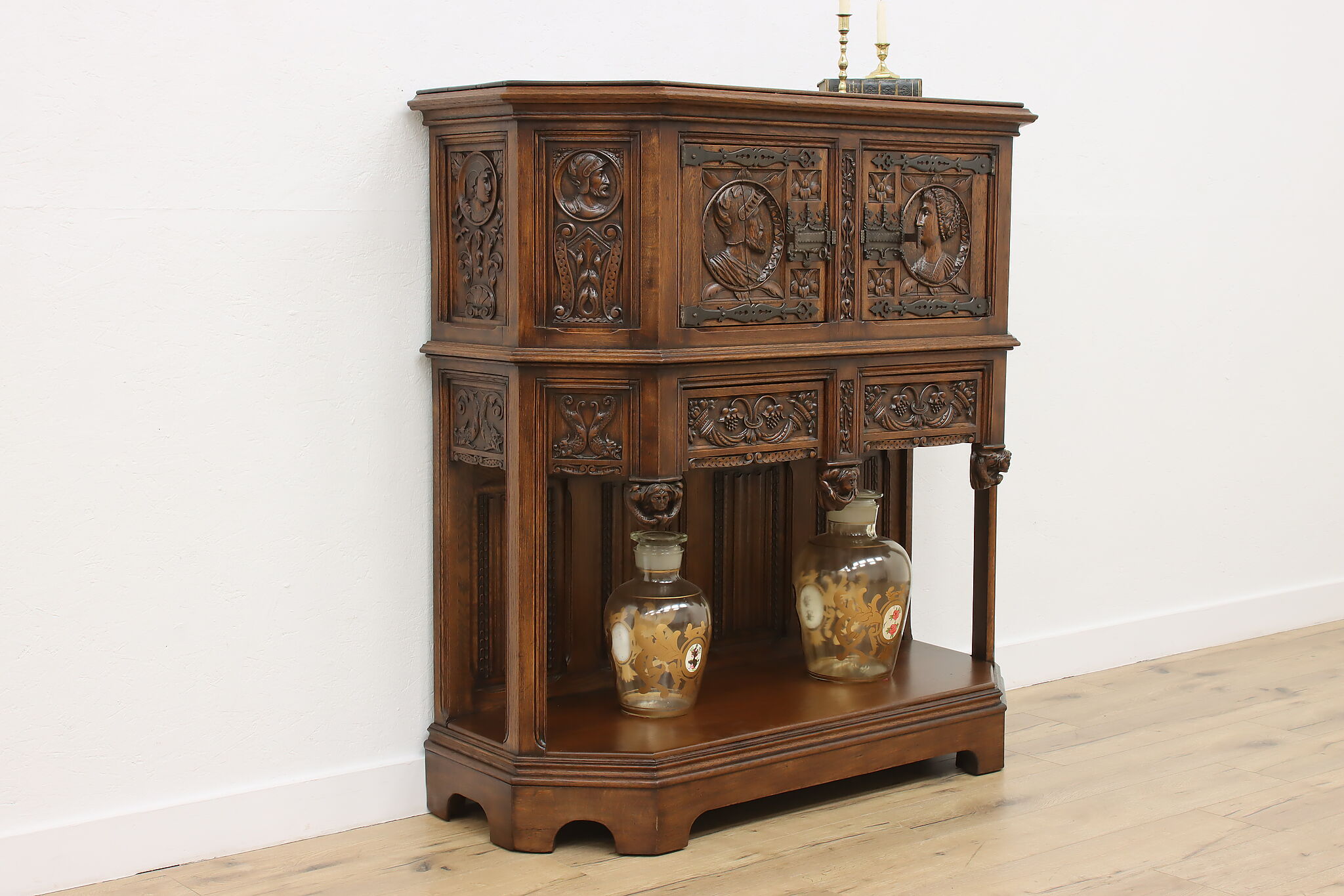 The romantic story of a knight and his beloved lady is beautifully preserved forever on this fantastic Renaissance hall or bar cabinet.