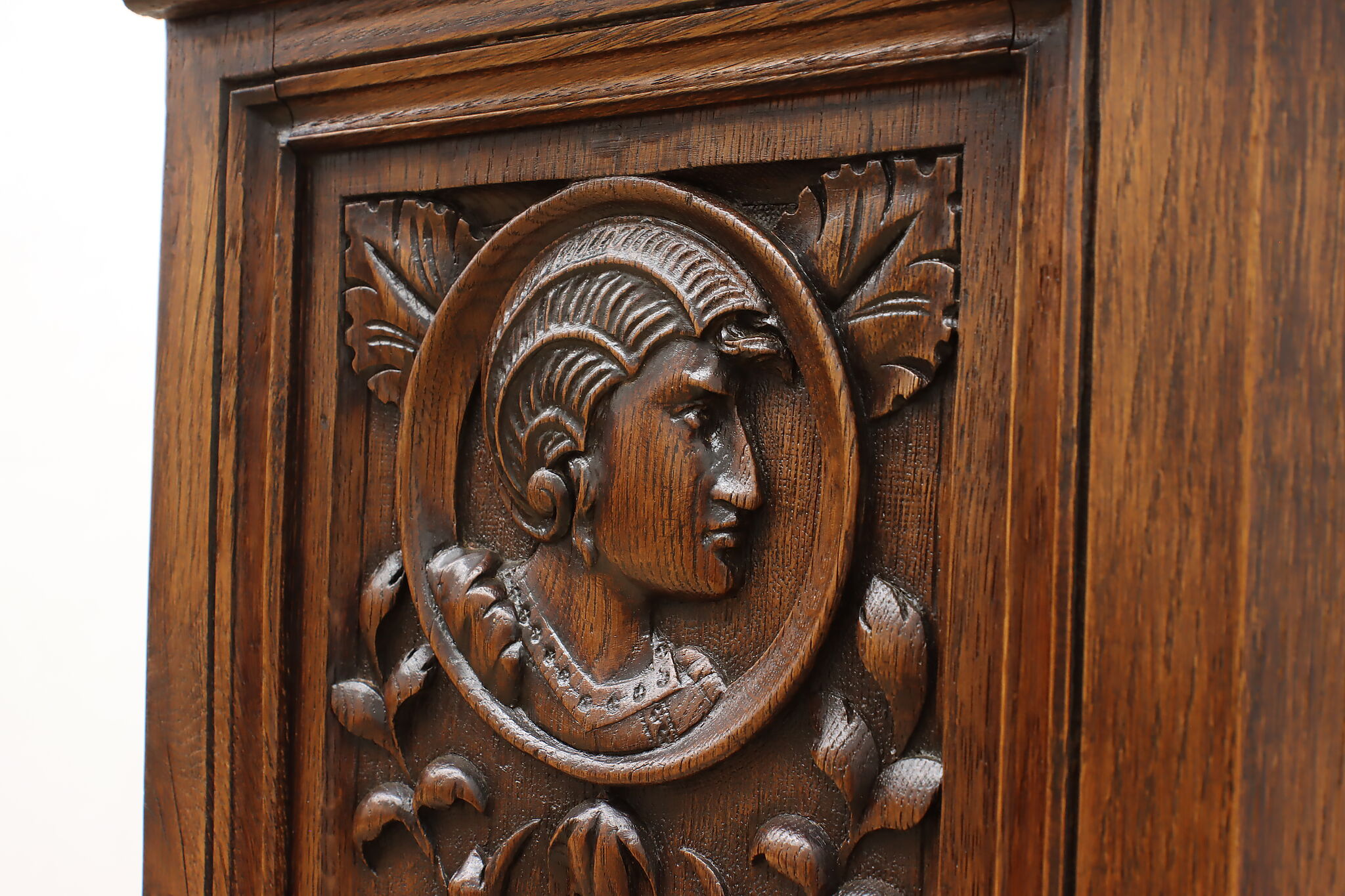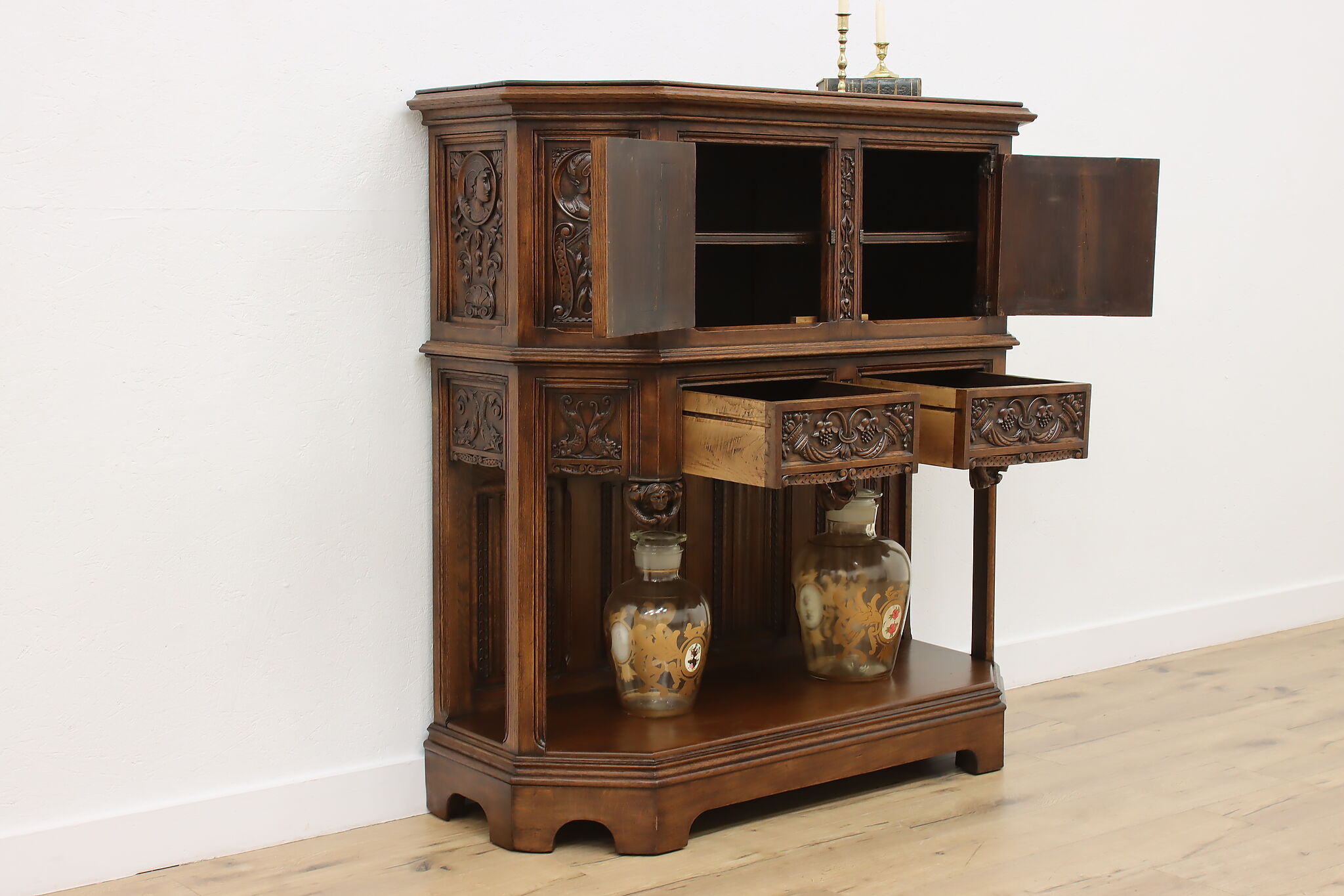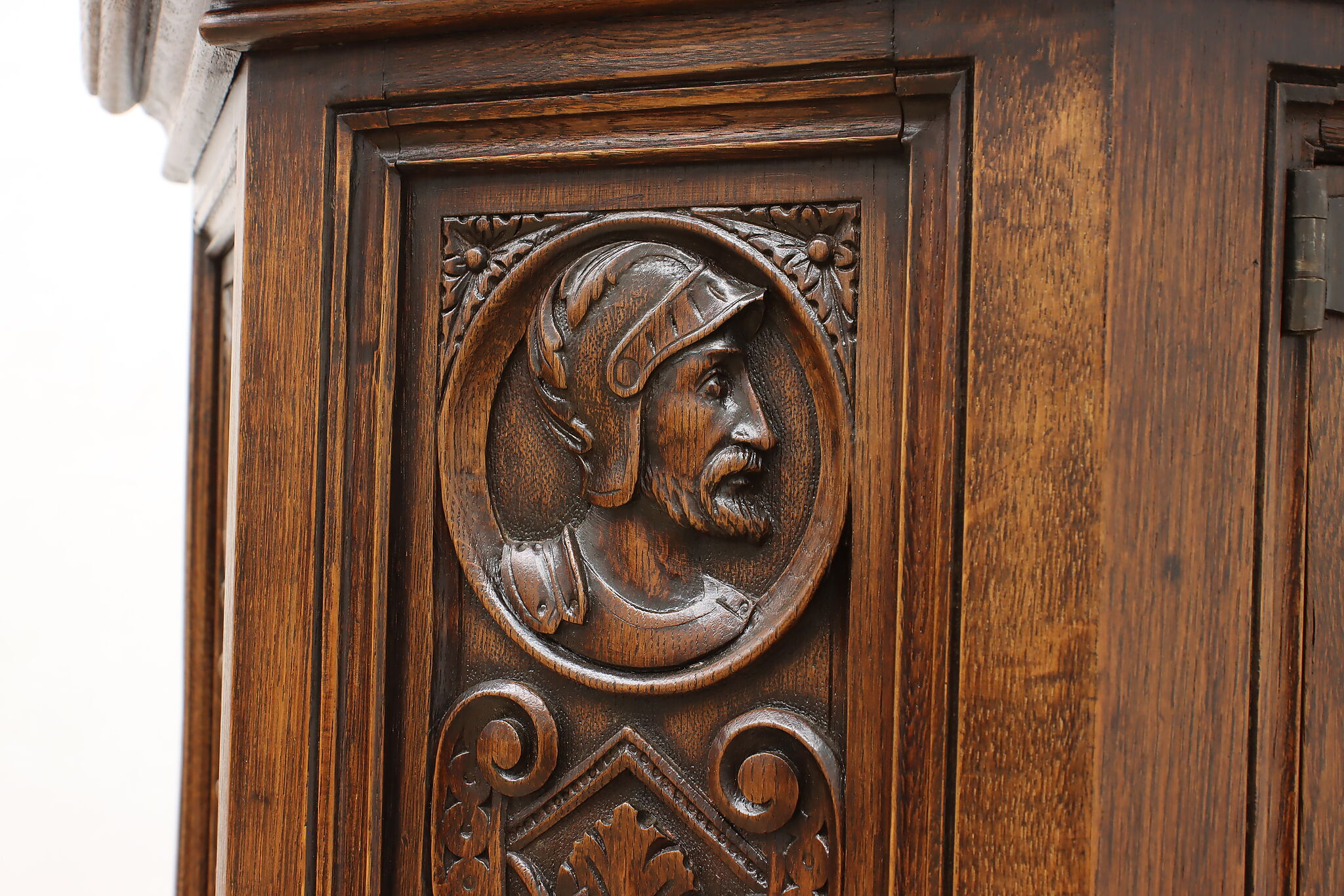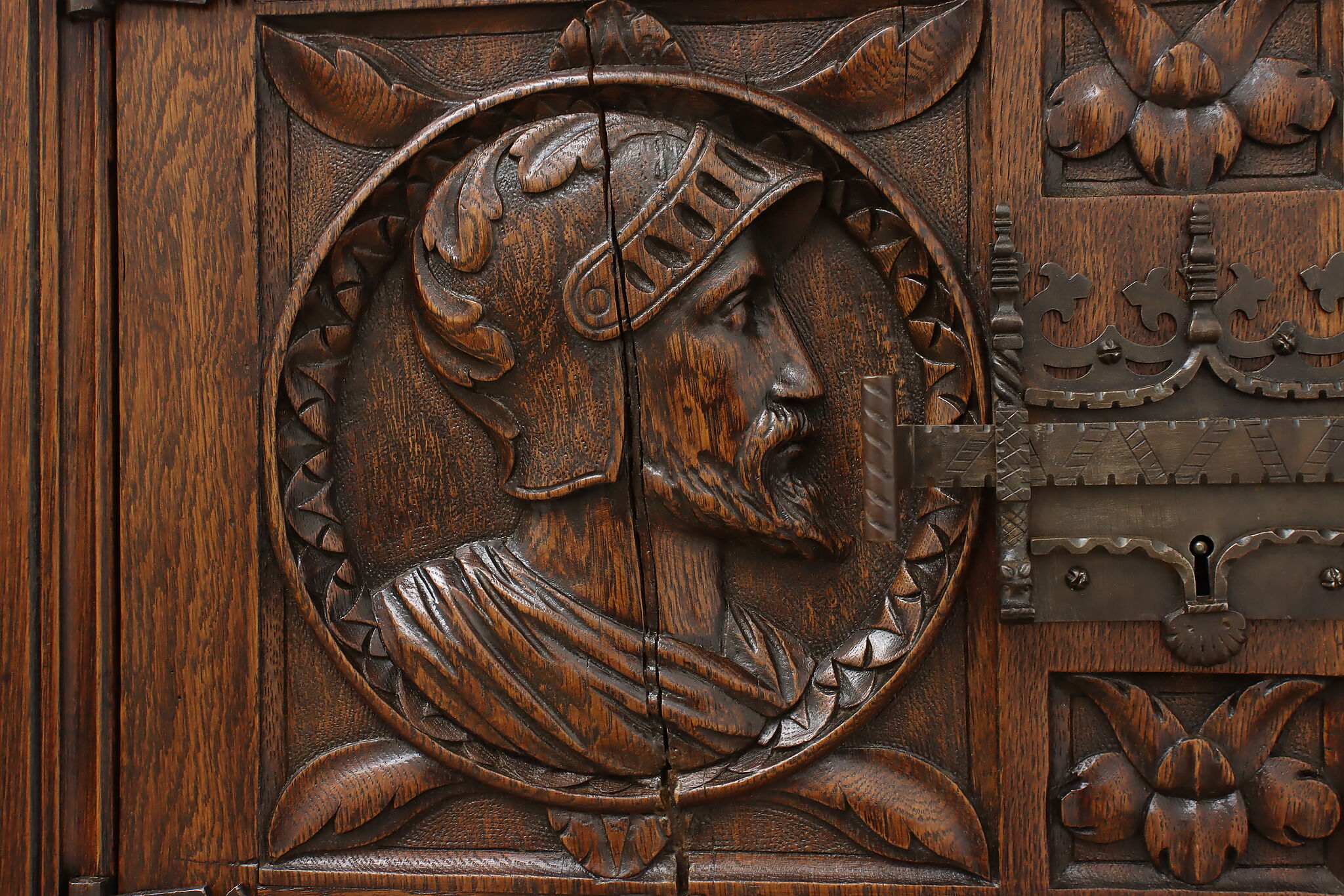 The romantic story of a knight and his beloved lady is beautifully preserved forever on this fantastic Renaissance hall or bar cabinet.