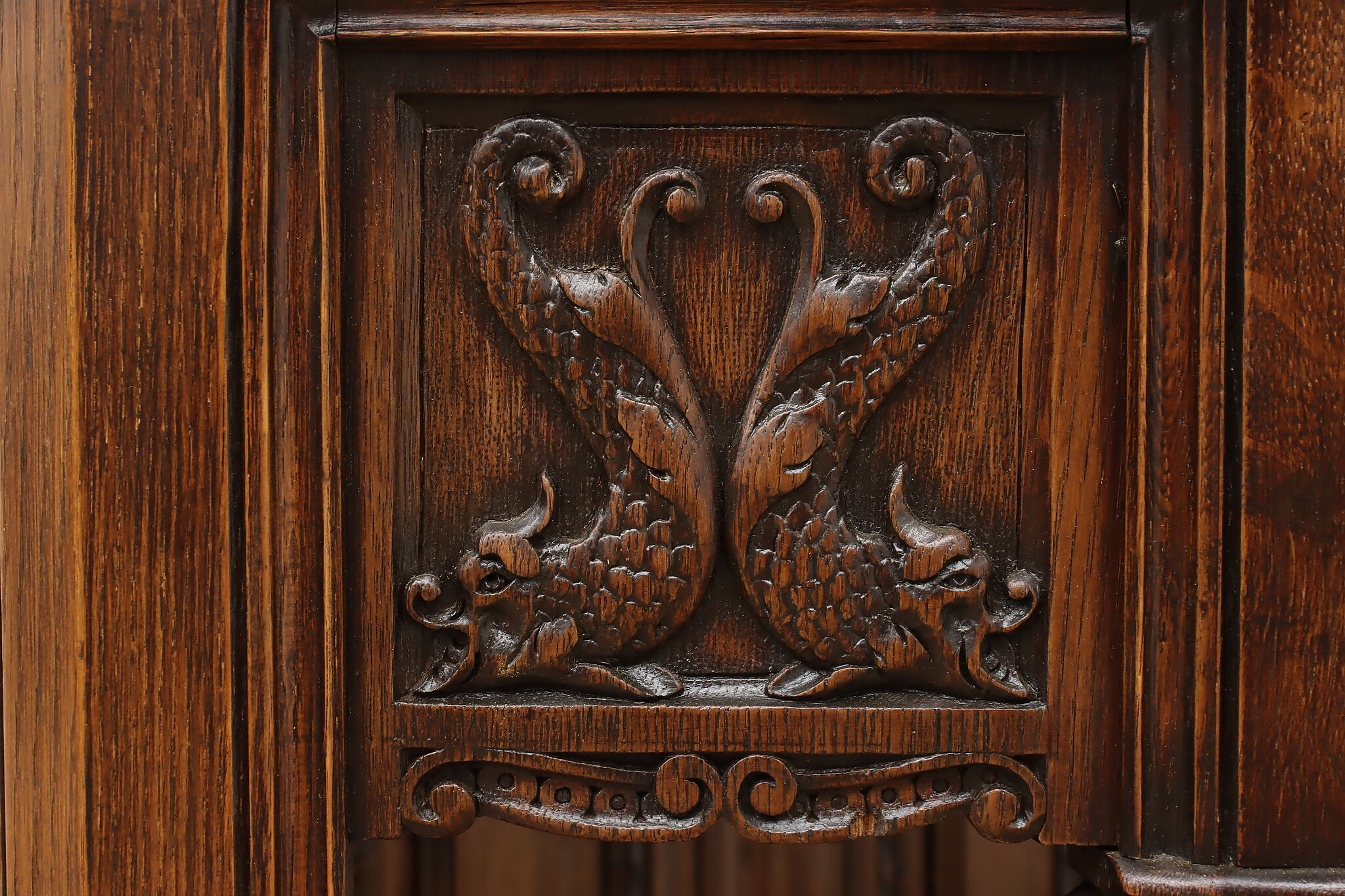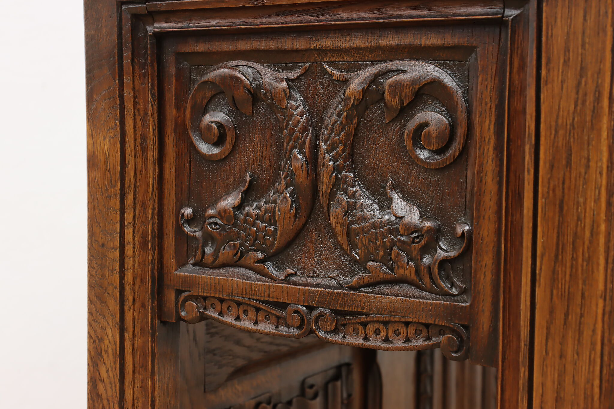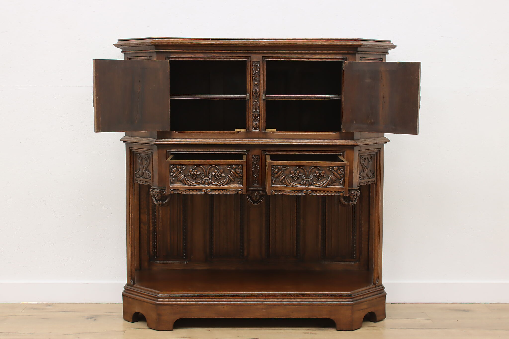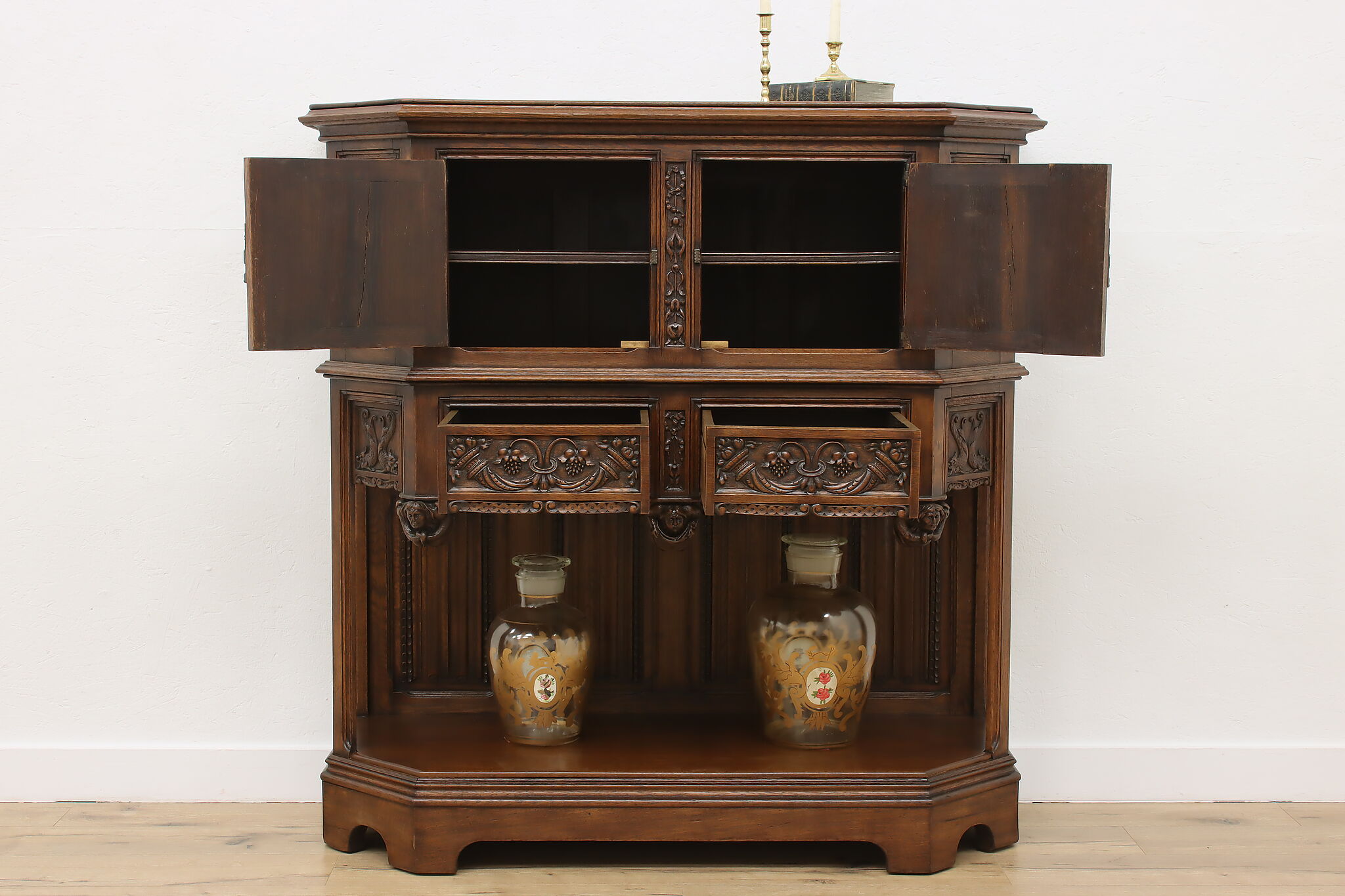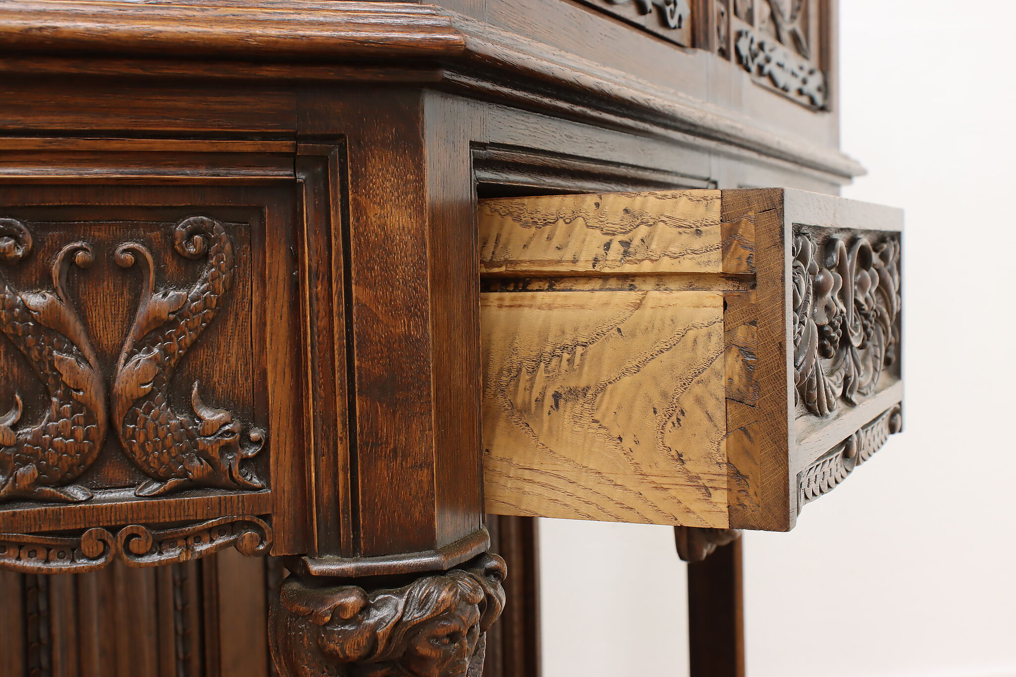 The romantic story of a knight and his beloved lady is beautifully preserved forever on this fantastic Renaissance hall or bar cabinet.