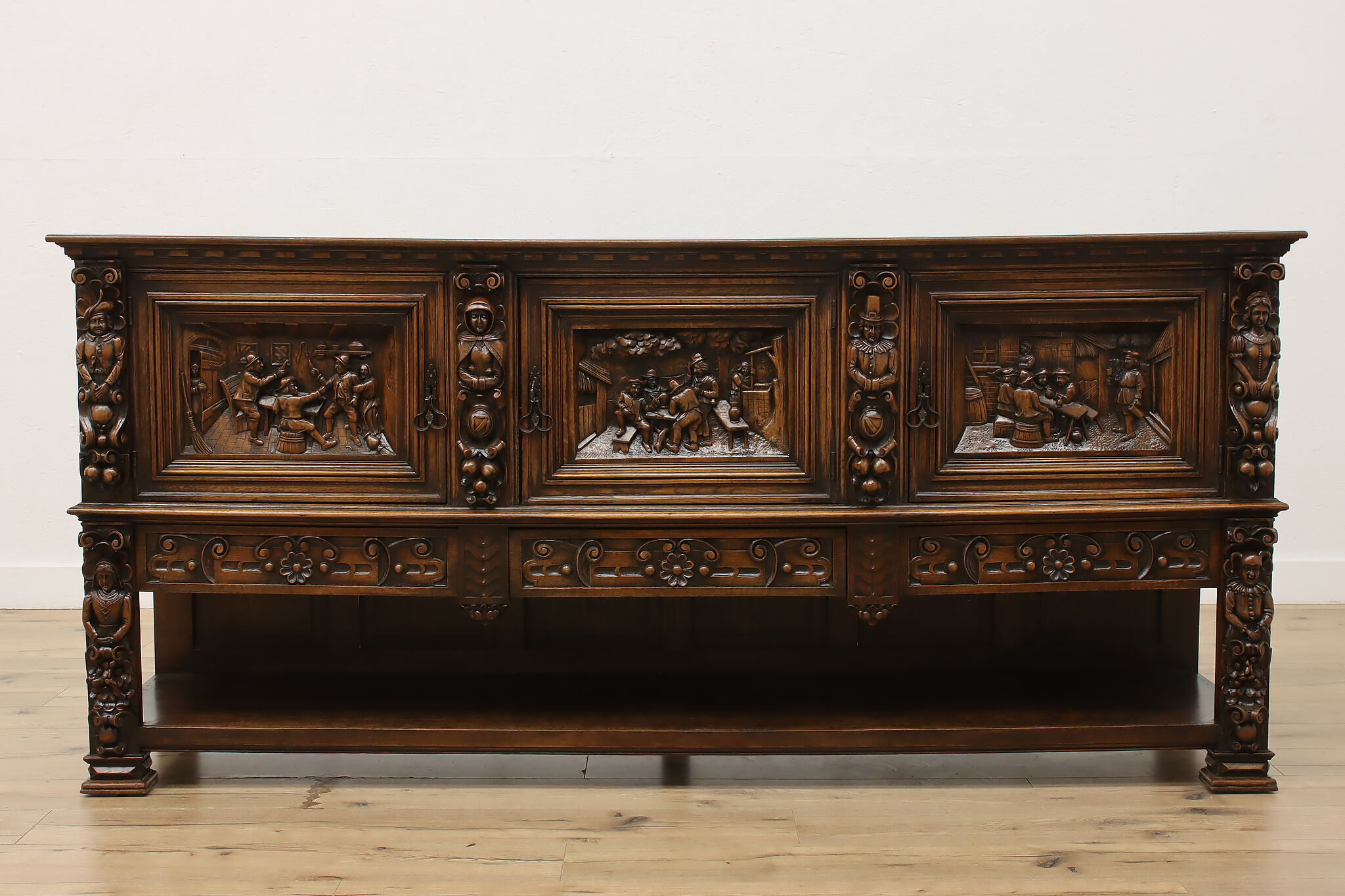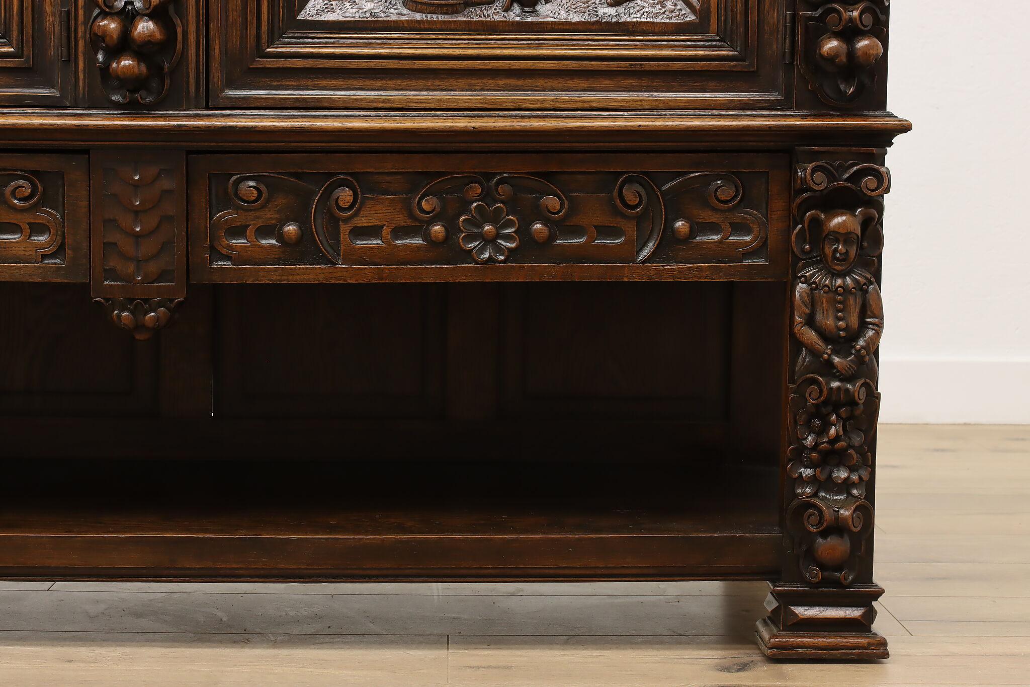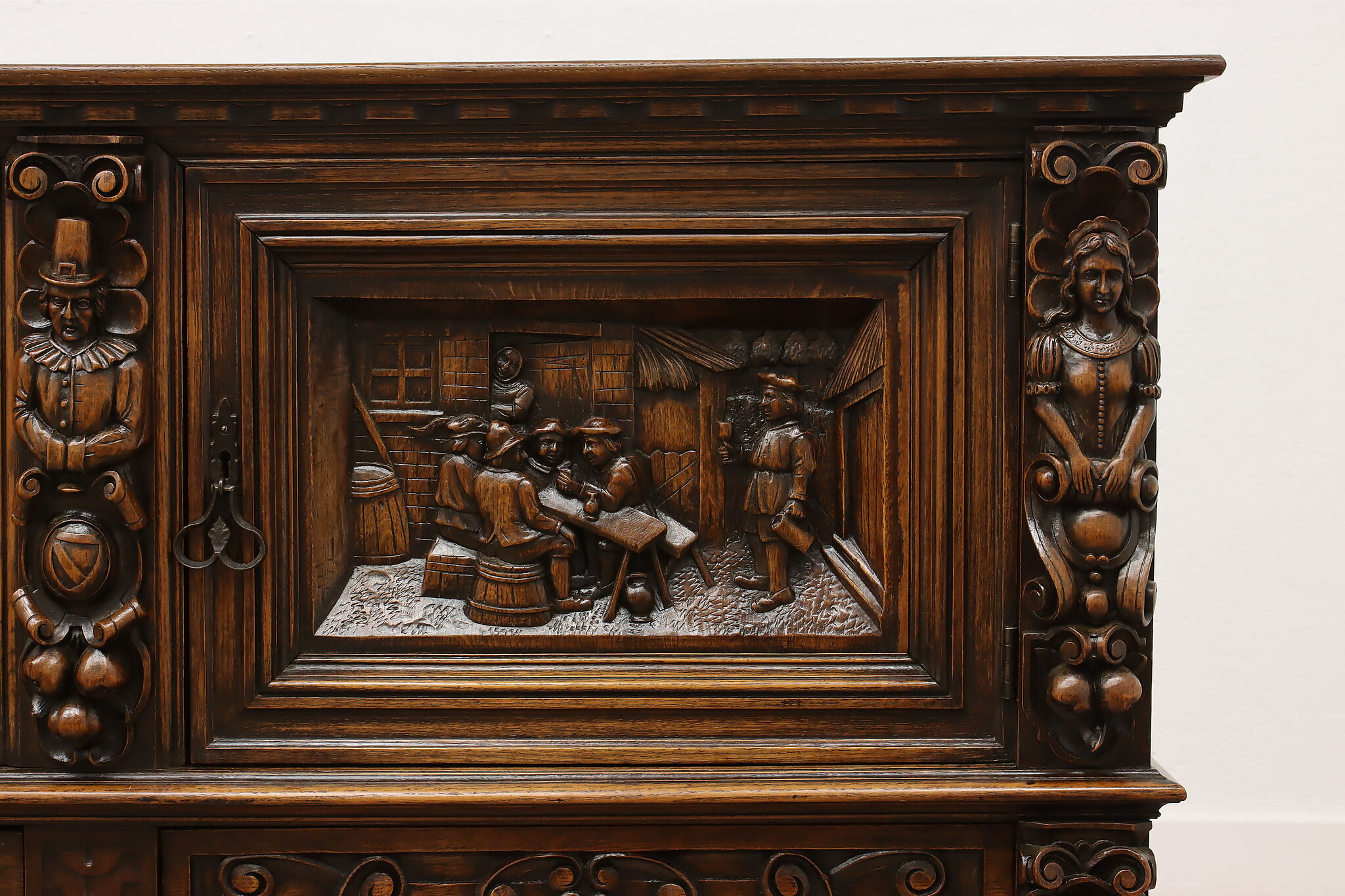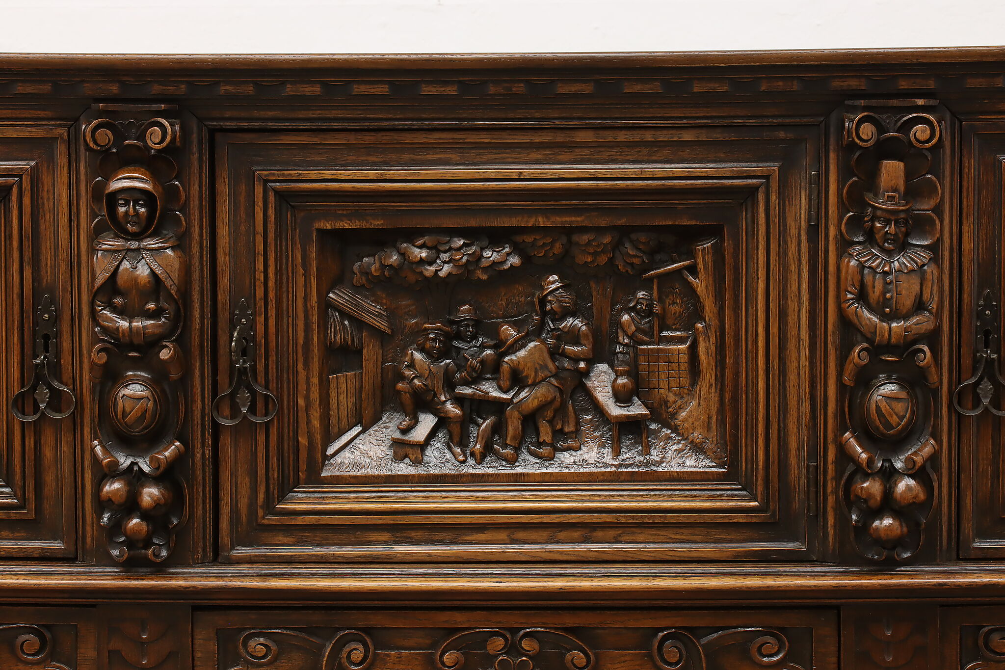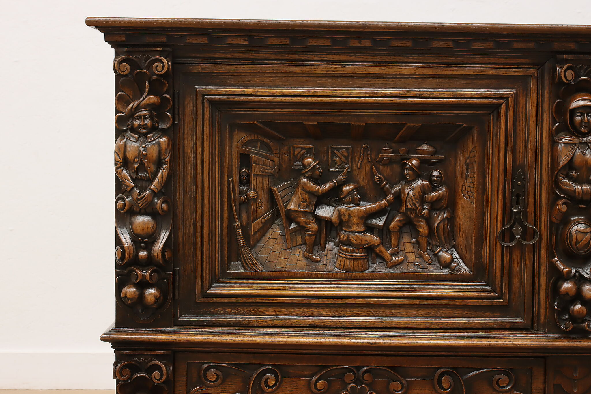 This Renaissance design buffet or sideboard has fantastically carved village pub scenes and figures, including a court jester!