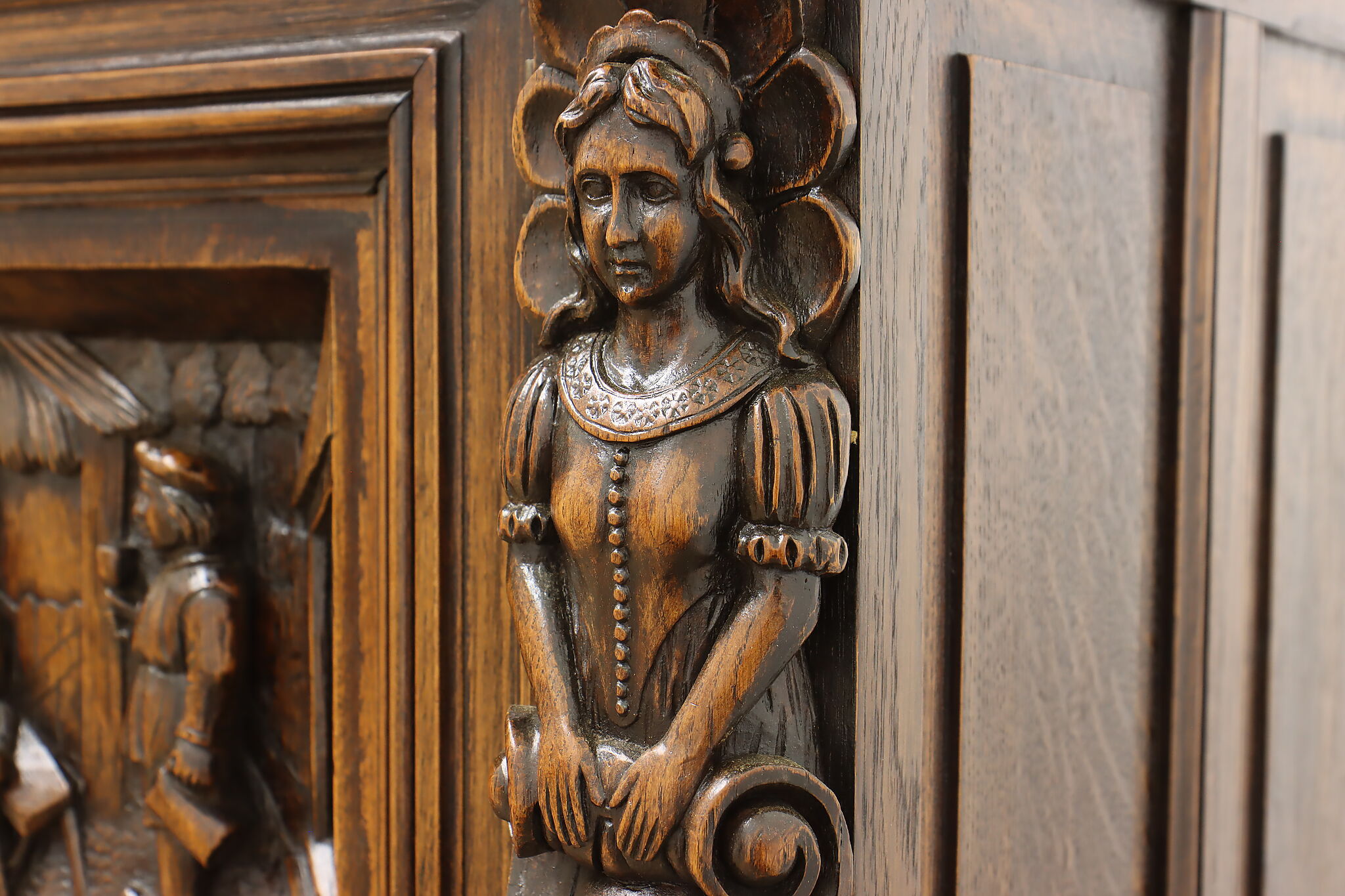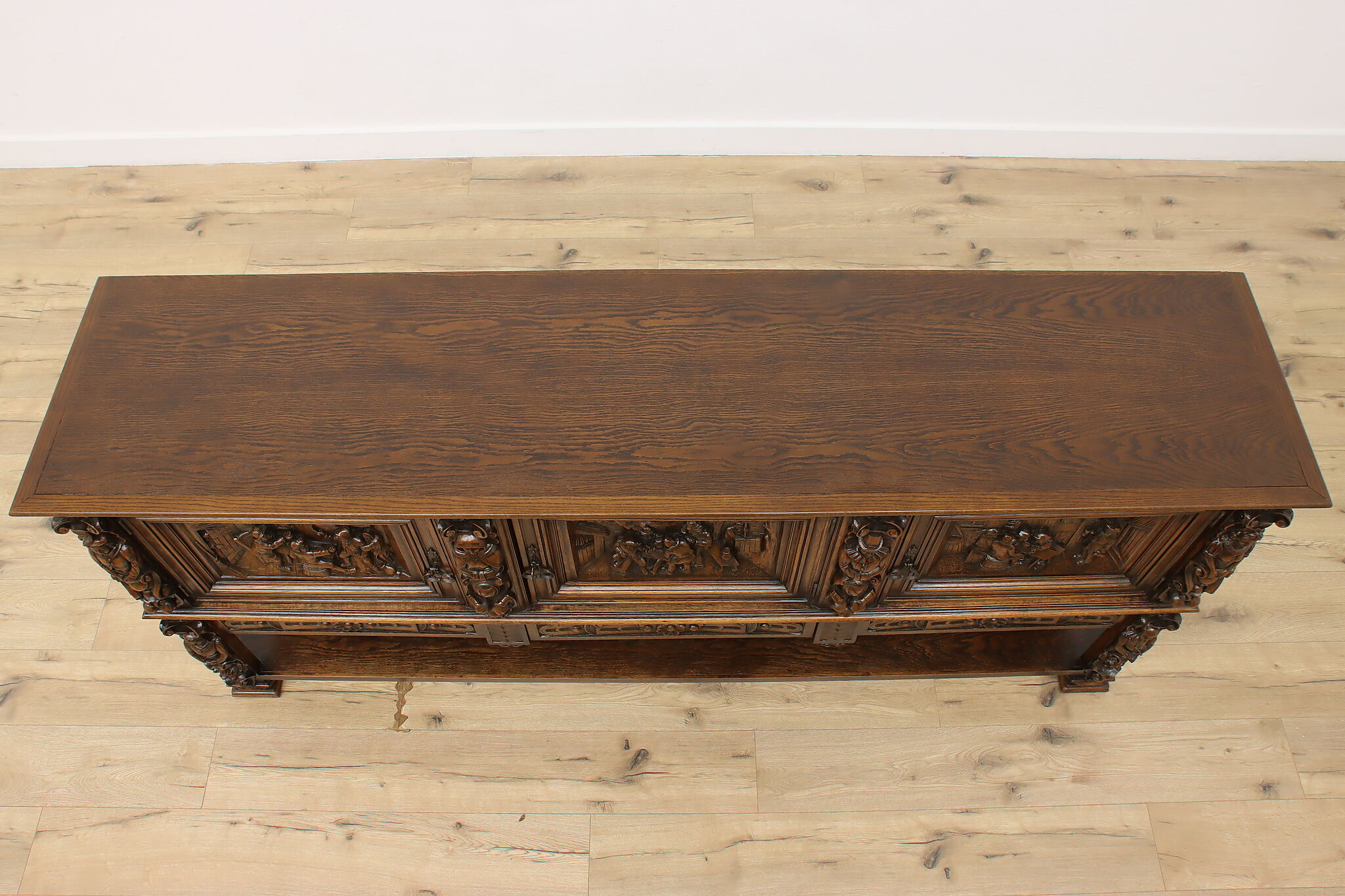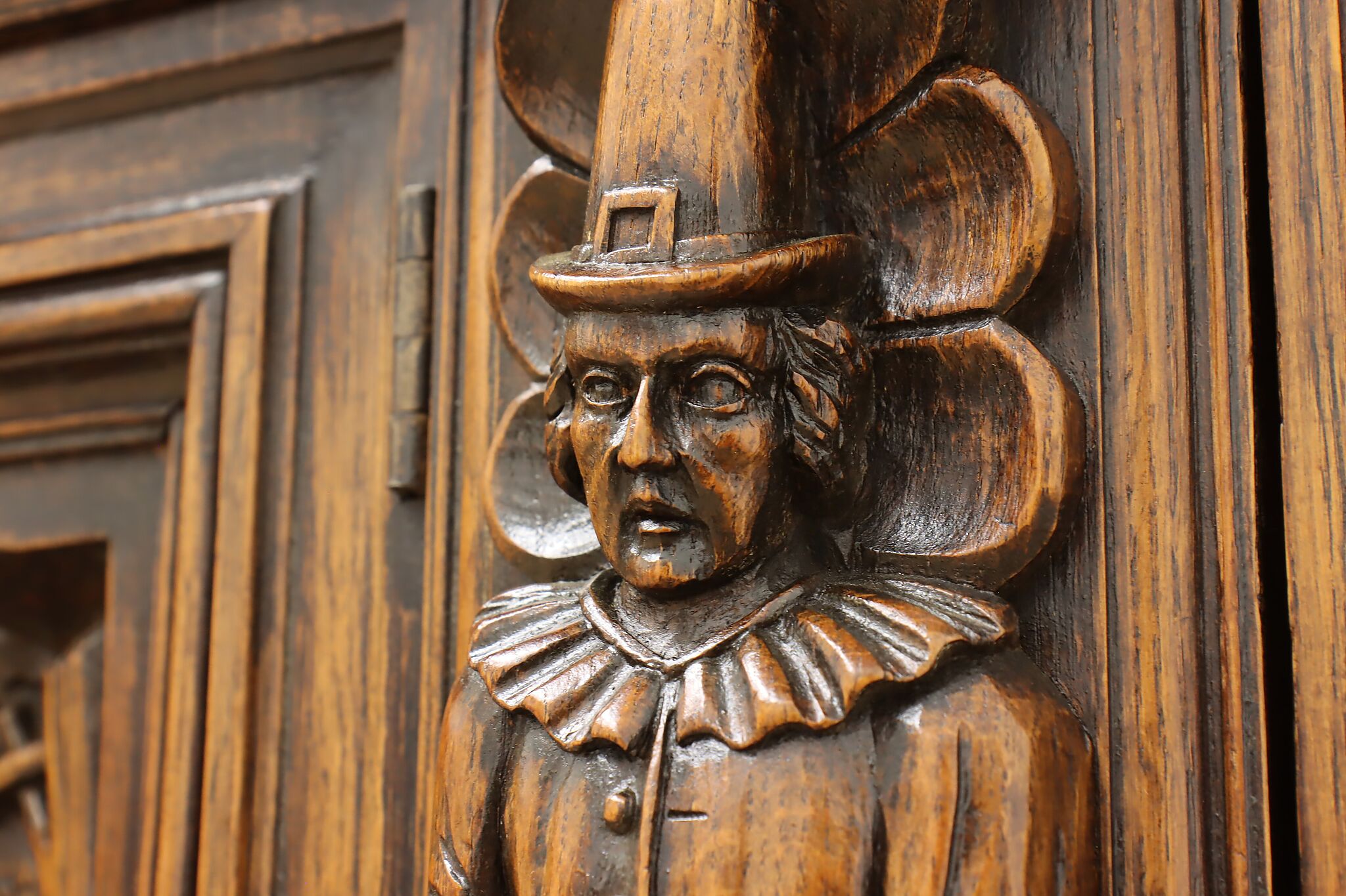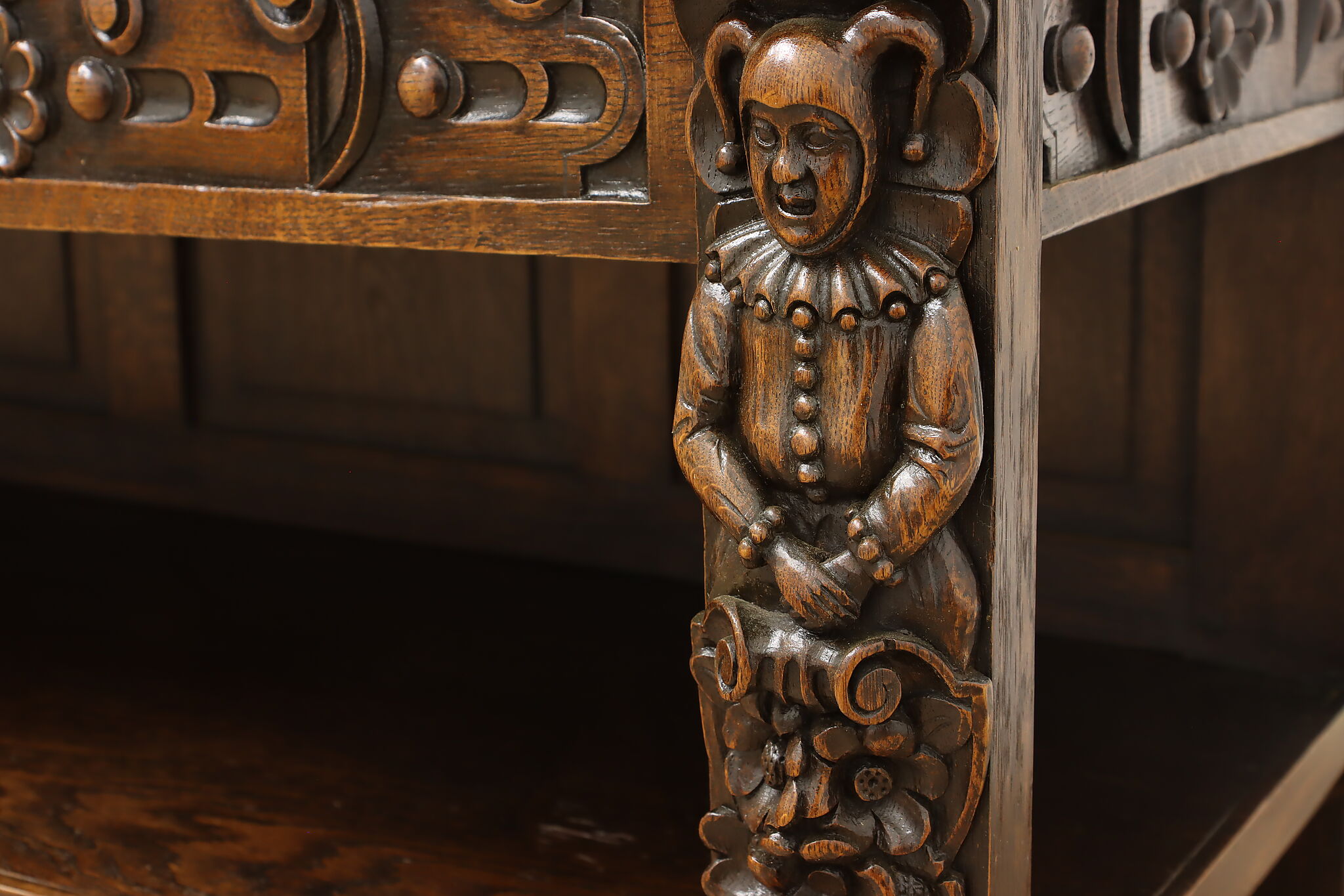 This Renaissance design buffet or sideboard has fantastically carved village pub scenes and figures, including a court jester!