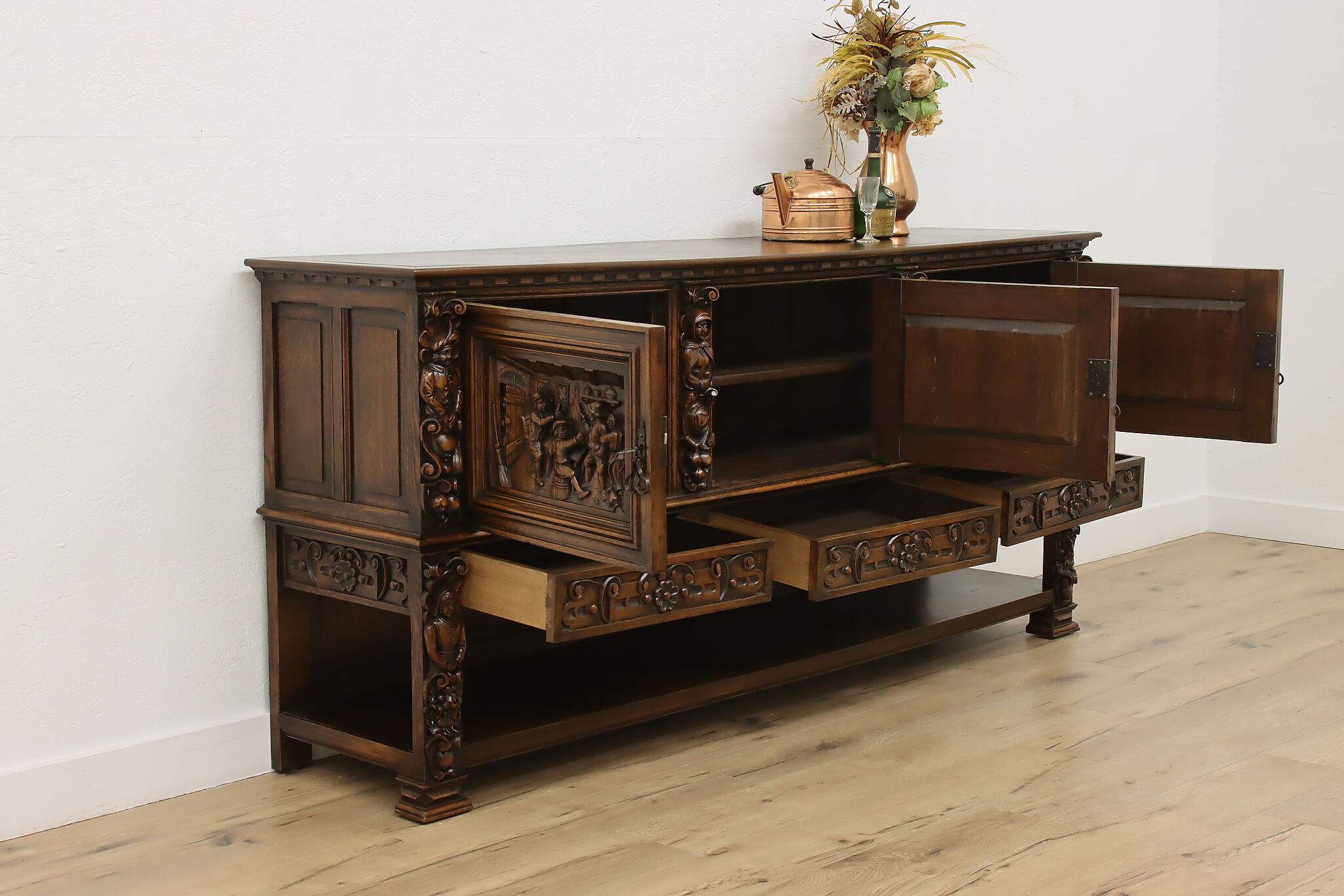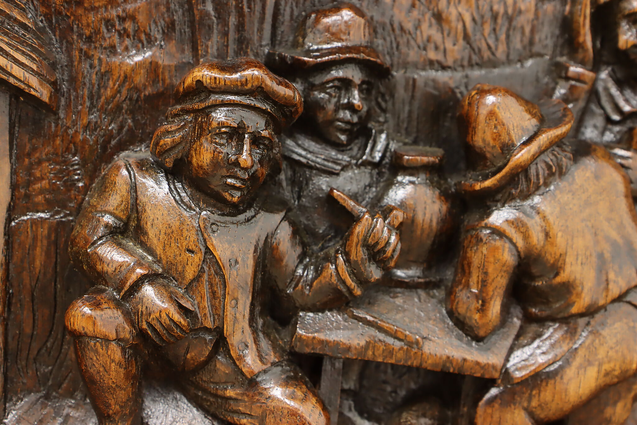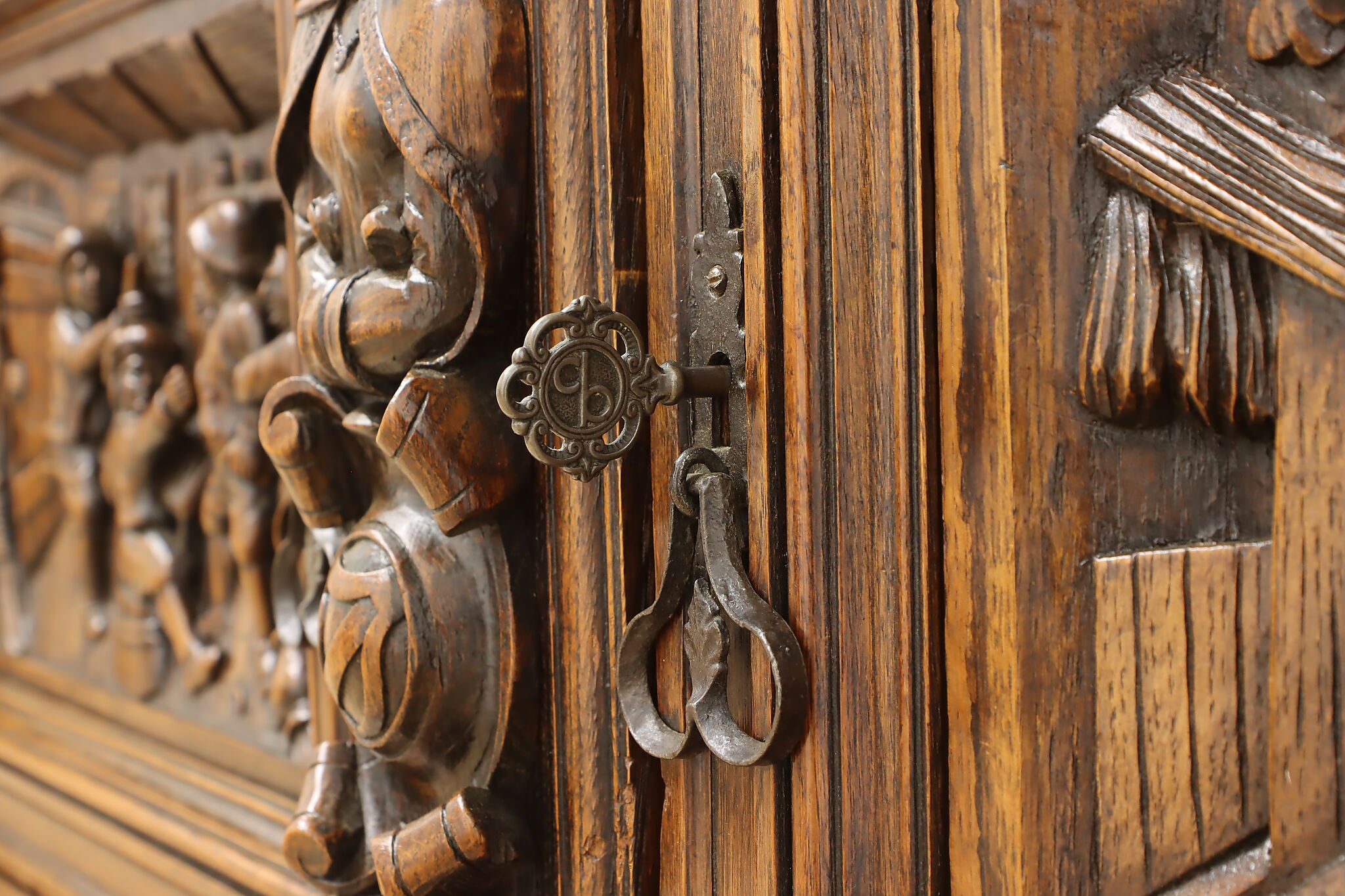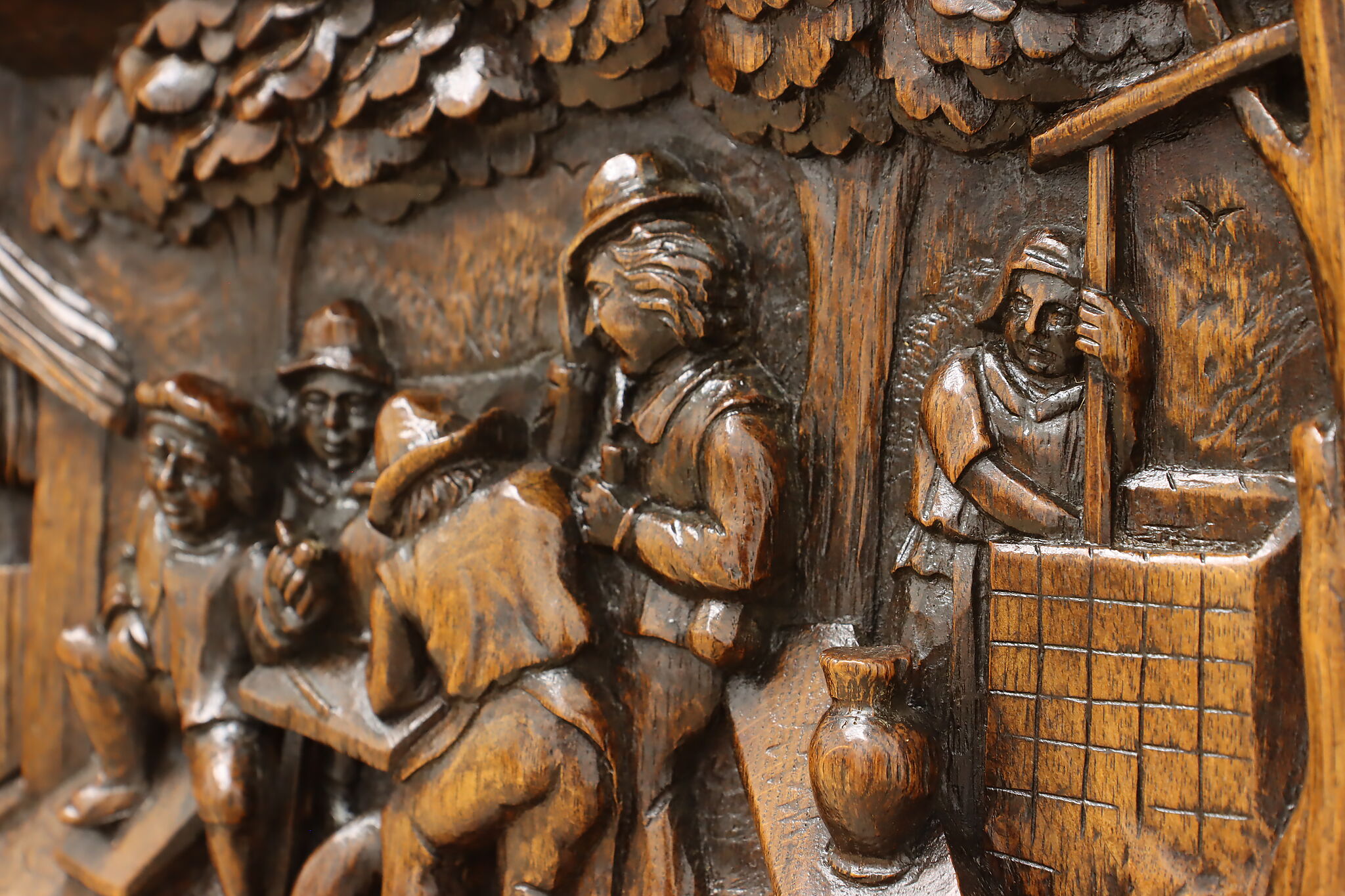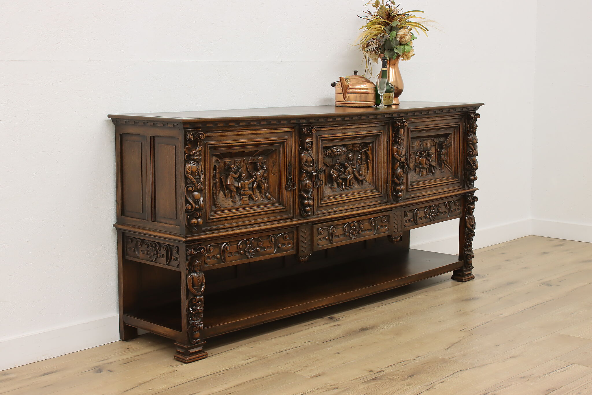 This Renaissance design buffet or sideboard has fantastically carved village pub scenes and figures, including a court jester!