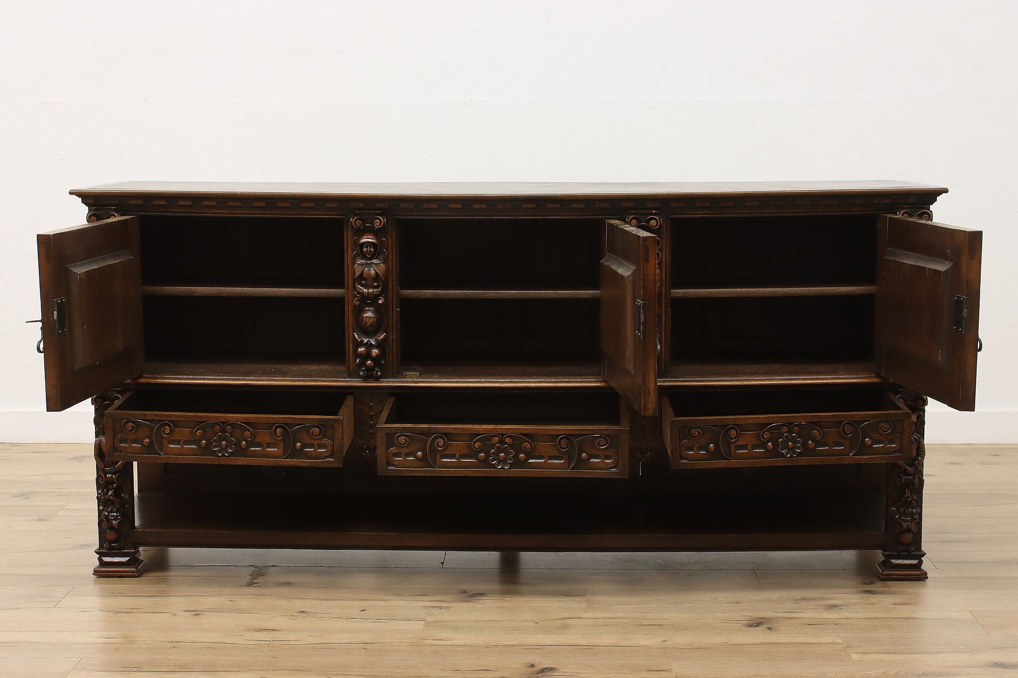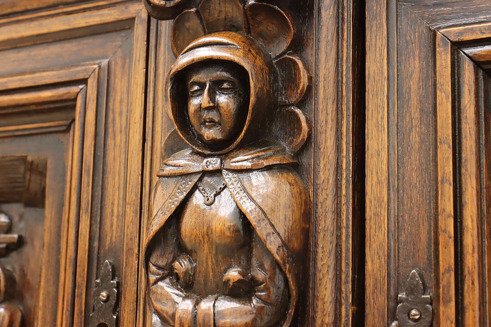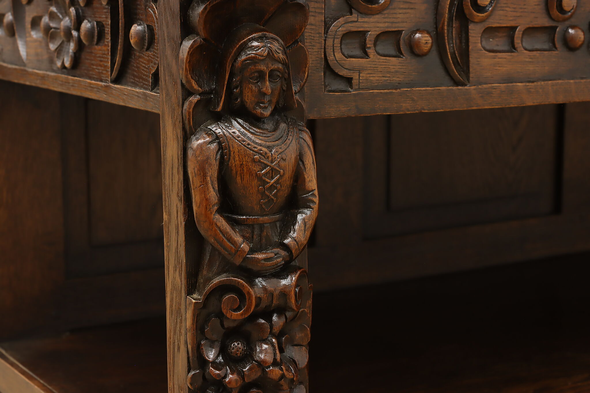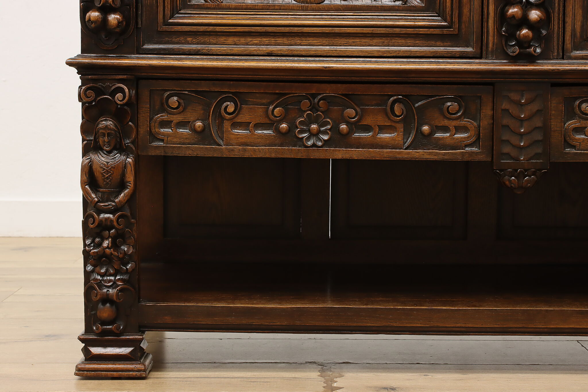 This Renaissance design buffet or sideboard has fantastically carved village pub scenes and figures, including a court jester!