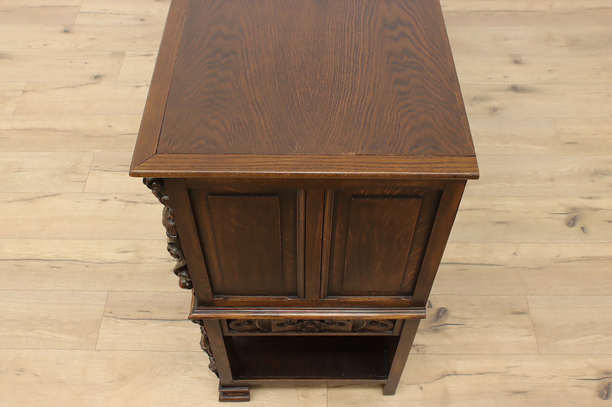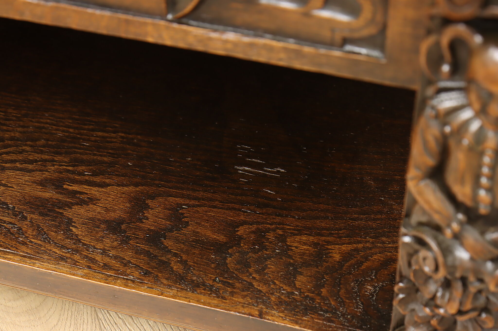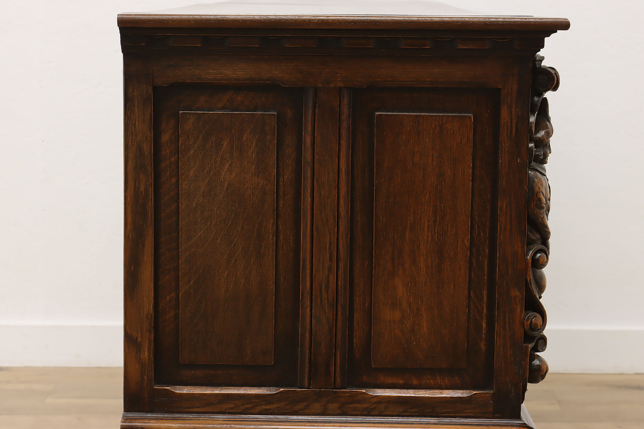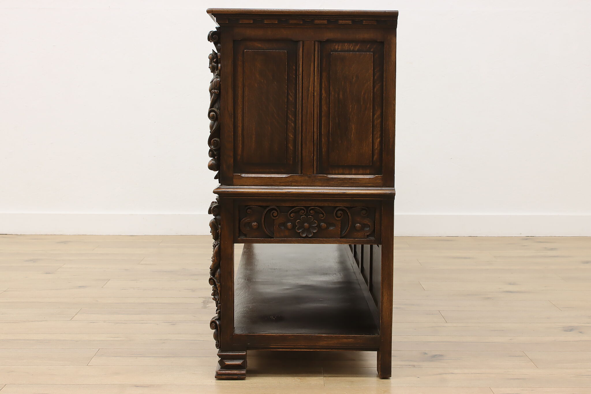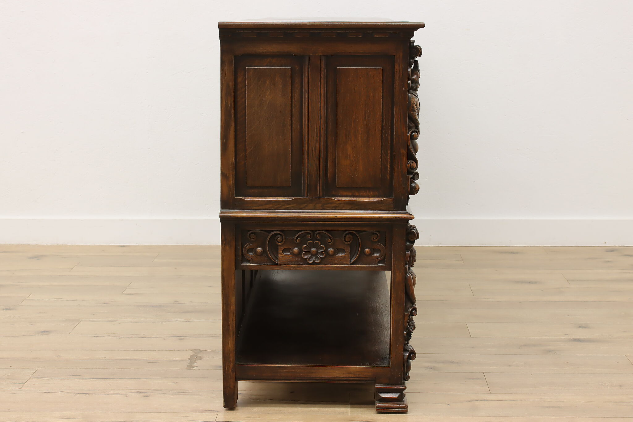 This Renaissance design buffet or sideboard has fantastically carved village pub scenes and figures, including a court jester!
