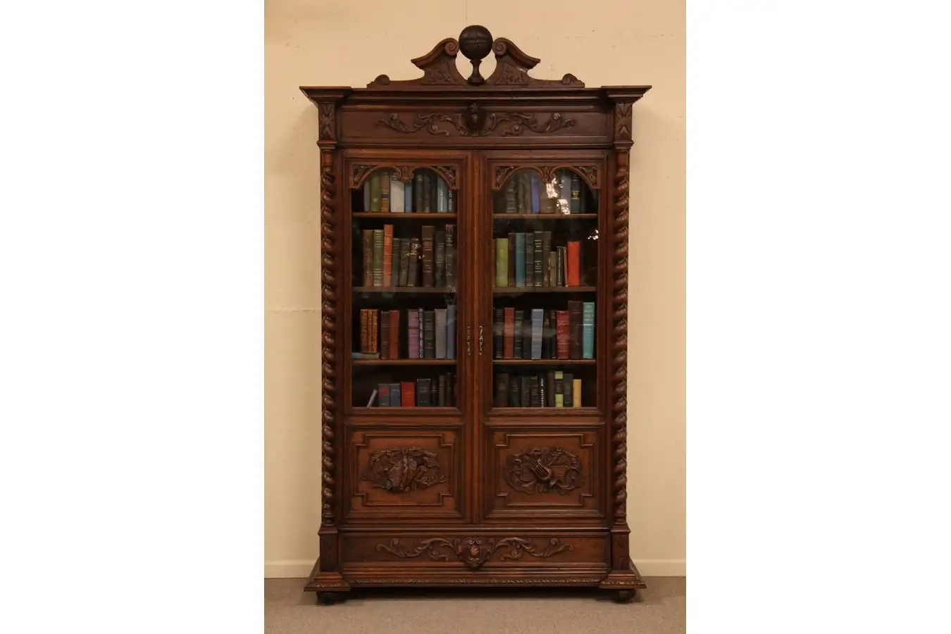 This Classical Renaissance oak bookcase or china cabinet is in wonderful condition. Spiral columns and deep moldings distinguish this imposing antique furniture dating from about 1890.