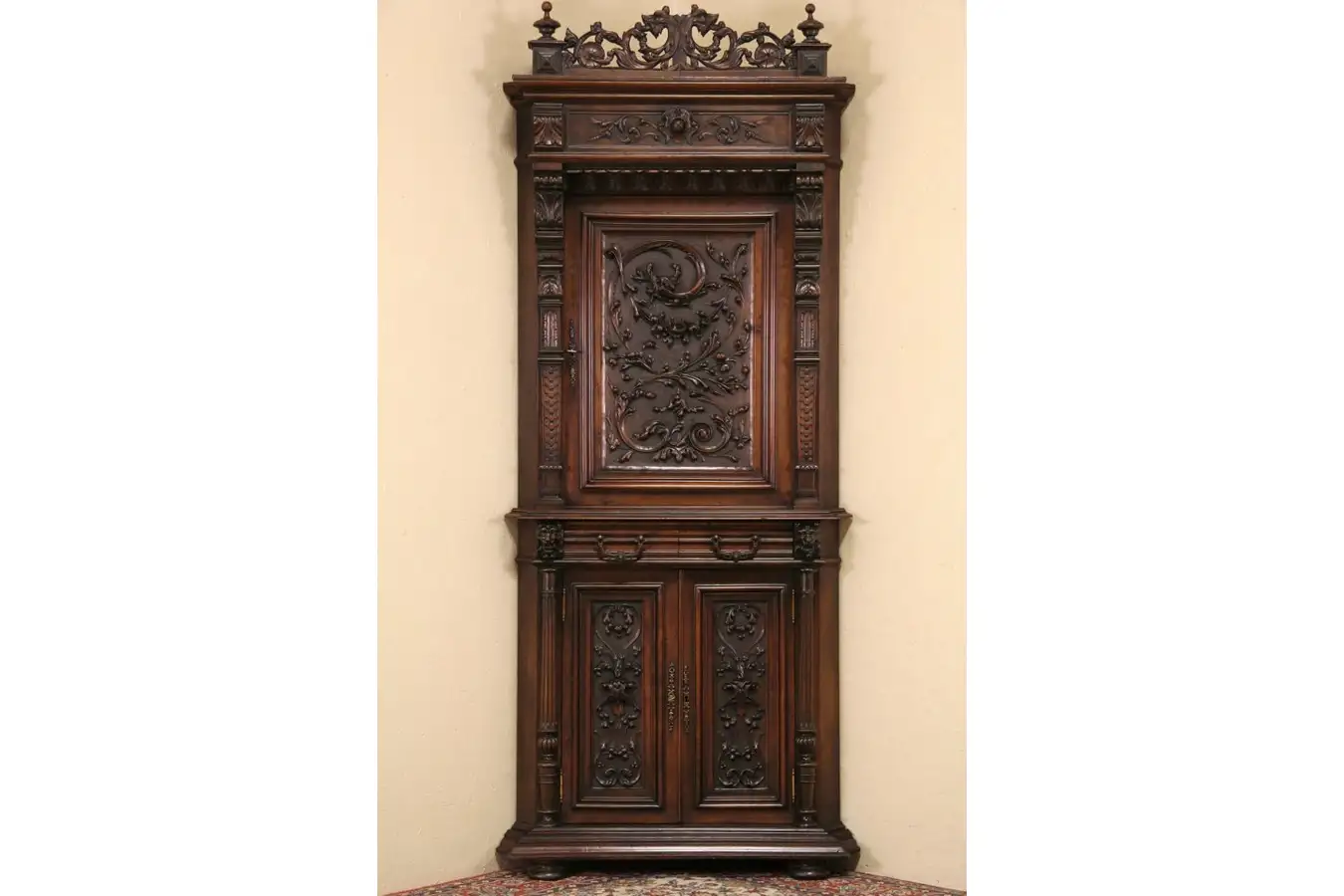 Masterful artistry in woodcarving includes dragons and lion heads, sculpted in solid walnut about 1890 on this corner cabinet from France.